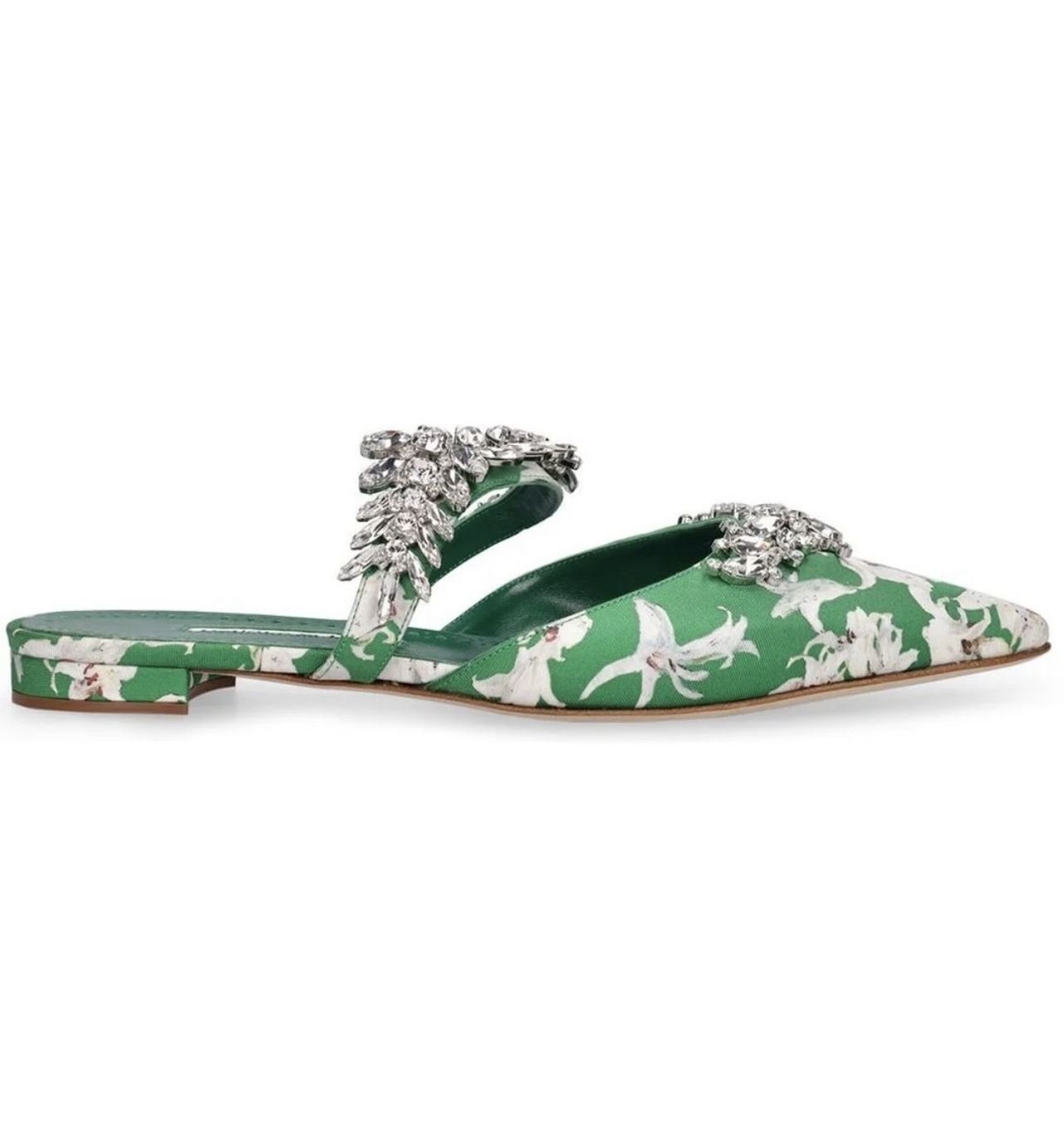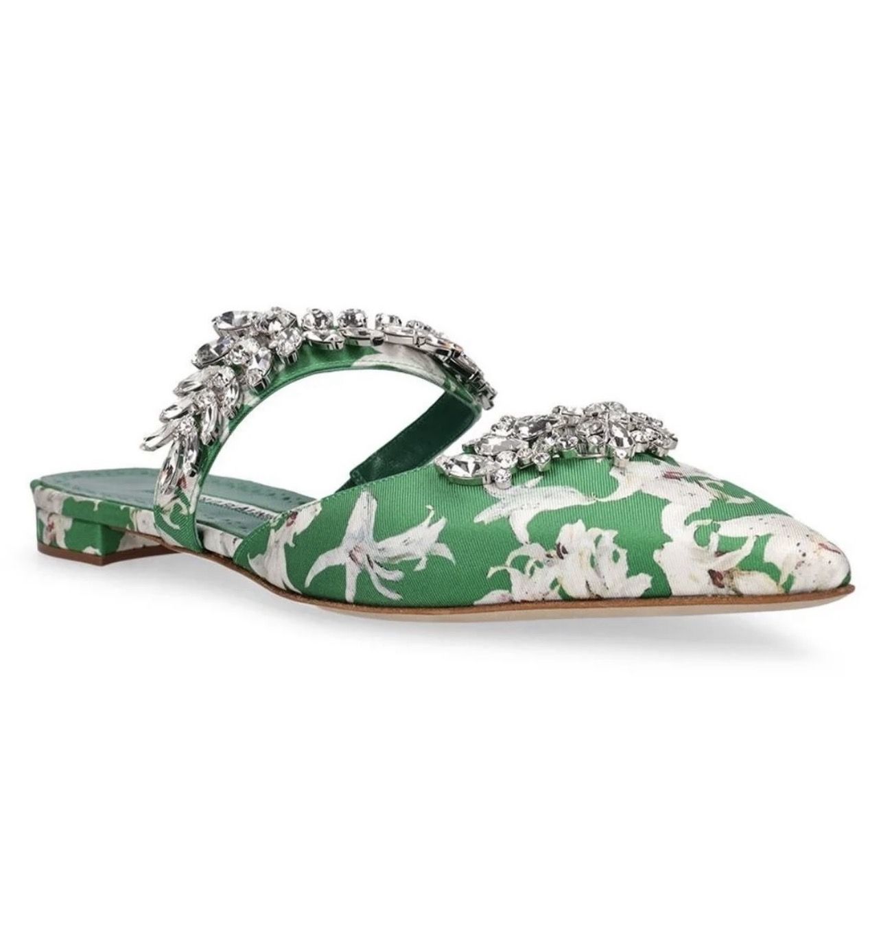 Showcasing a pointed toe and flat silhouette, these slip-on sandals feature a striking floral pattern in predominantly emerald green tones. Glamour-maximalist crystal embellishments lend a touch of sparkle, making them ideal for evening occasions, parties, or adding a bold accent to casual outfits.