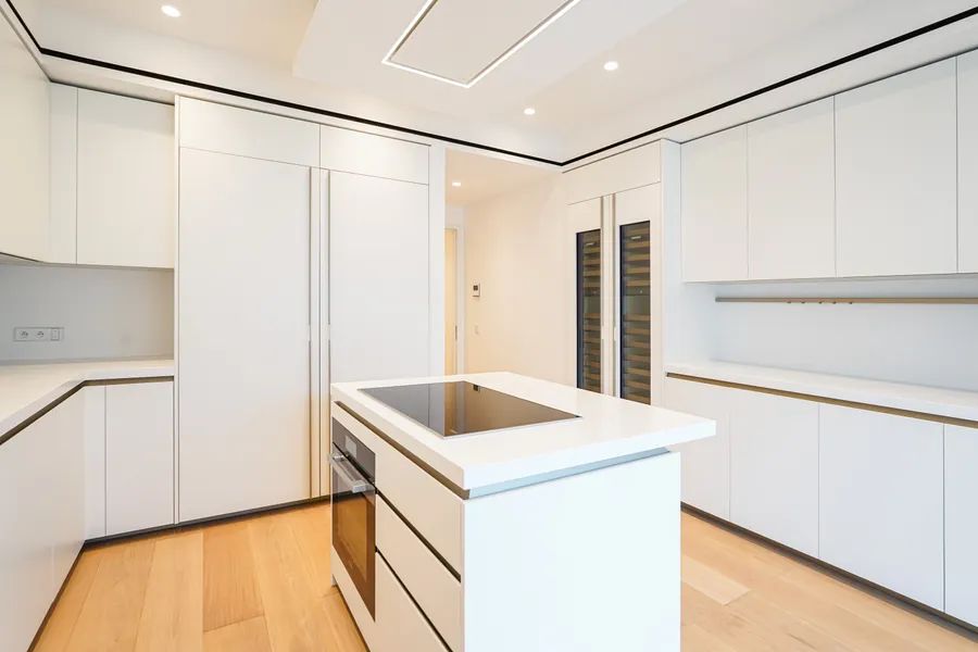 The modern kitchen, equipped with a central island and a wine cellar, has been designed for gourmet enthusiasts. A laundry room, maid toilets and a service entrance complete the layout.
