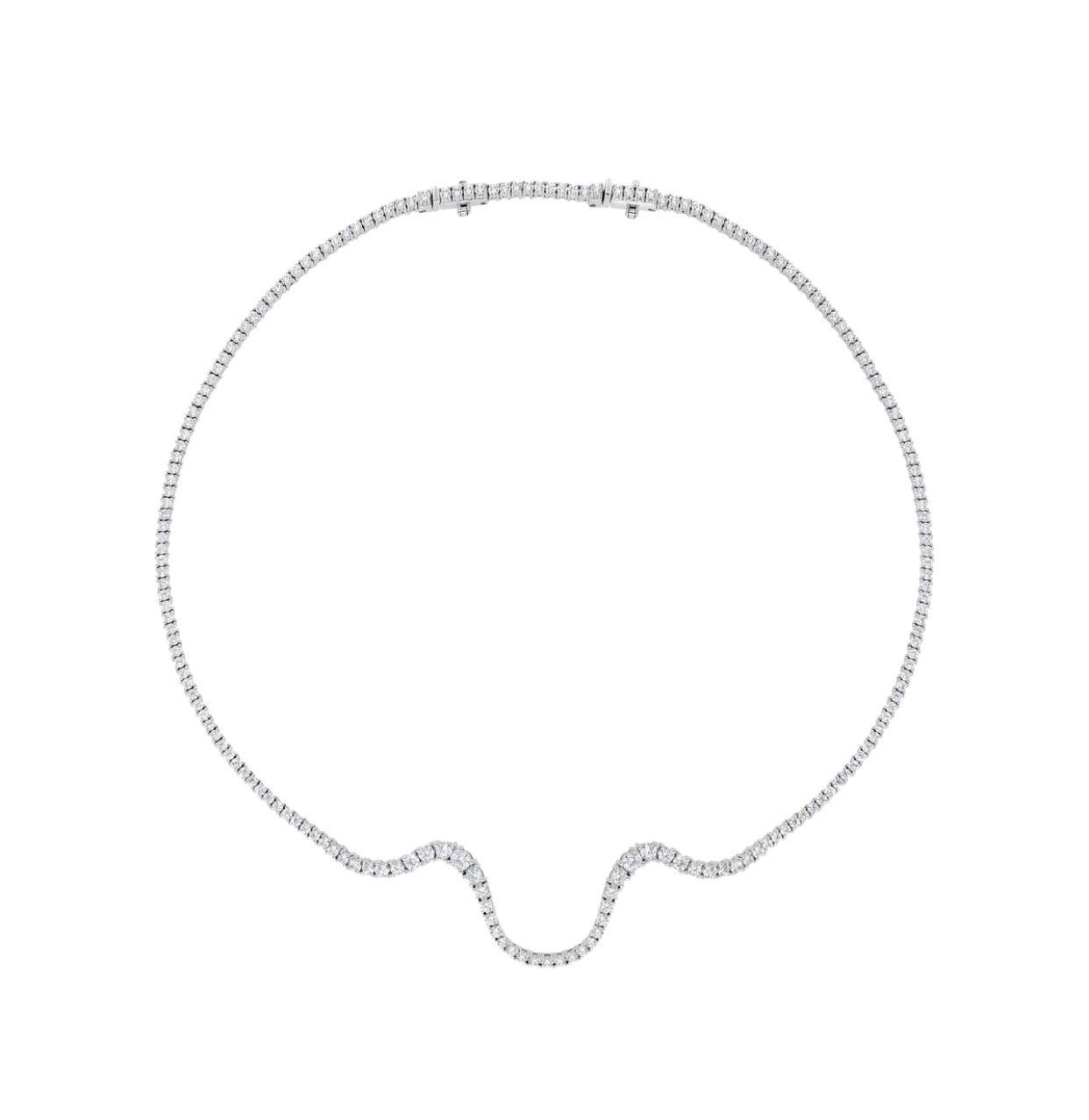 A full diamond choker crafted in 18k white gold set with 193 diamonds totalling 7,8 carats. The diamonds perfectly catch the light creating an illusion of a light drawing. In contrast, the rigid part beautifully highlight the wearer's collar bones and the dip on the neck, while the supple part of the chain gently hug it. Features an adjustable closure to regulate the length.