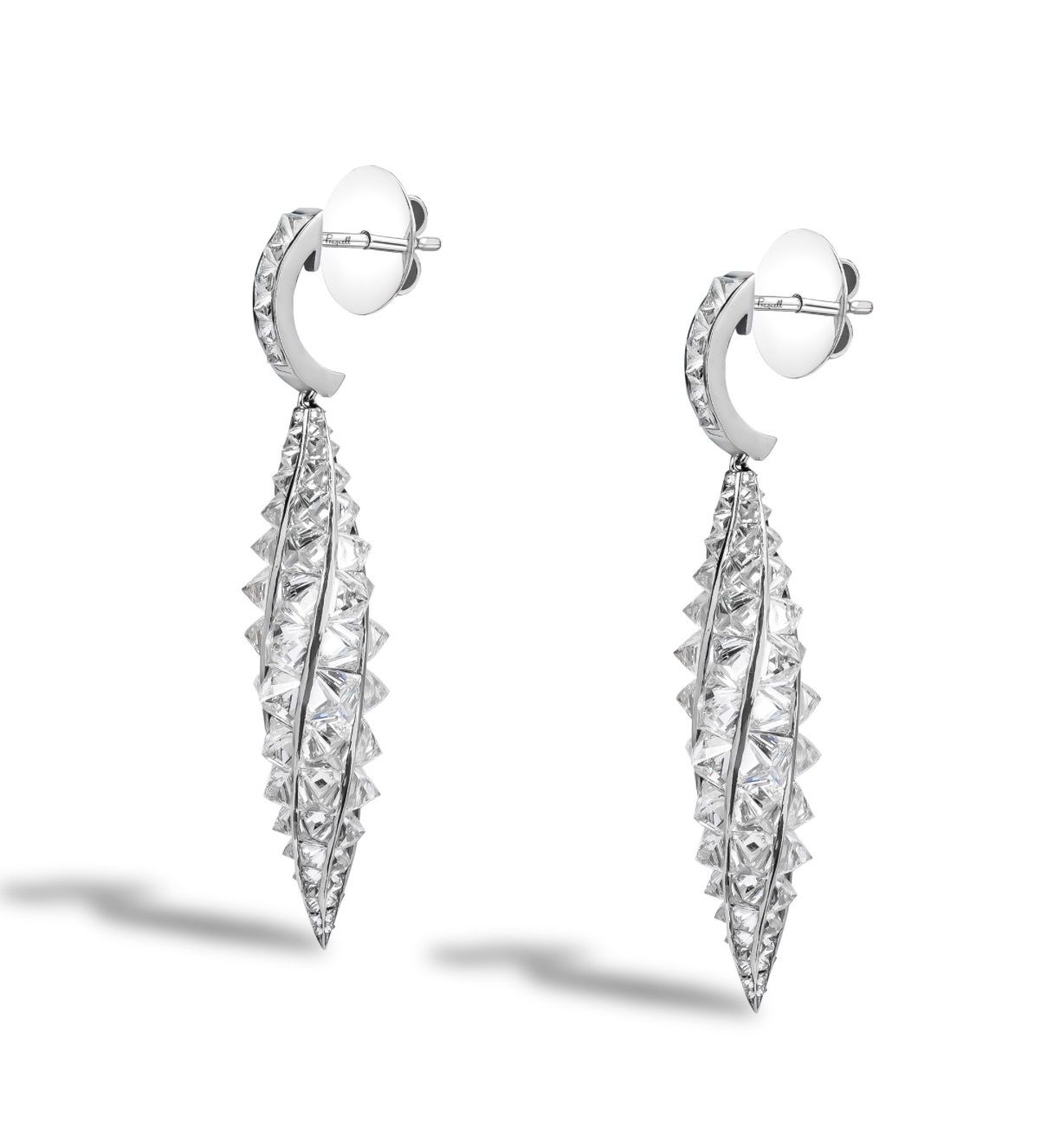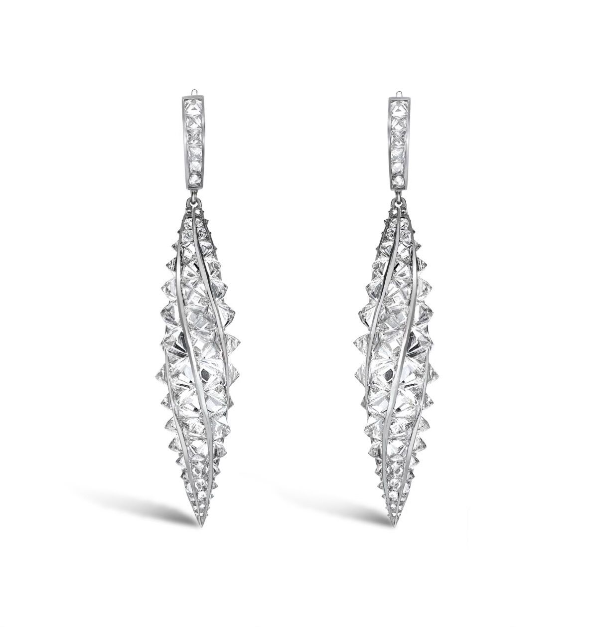 Striking diamond drop earrings from the Masterpiece Collection. Rows of reverse set princess cut diamonds, totalling 18.34ct, gently twist around sleek and sculptural torpedo-shaped platinum drops. This unorthodox diamond setting style creates a dramatic silhouette and captivating play of light. Each drop is suspended from a diamond set bar, ensuring maximum movement when worn. Princess cut diamonds have been reversed so that their angular culets become the main attraction. The organic texture achieved is ultra ornate, yet surprisingly wearable and versatile. Pragnell Masterpieces showcase exceptional artistry, craft and gemstones.