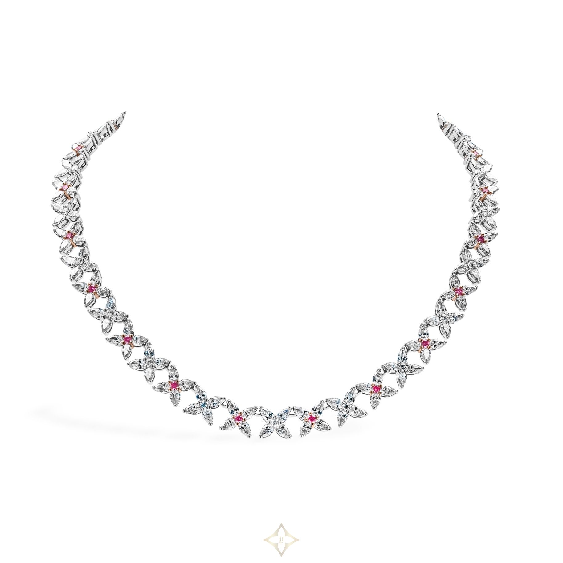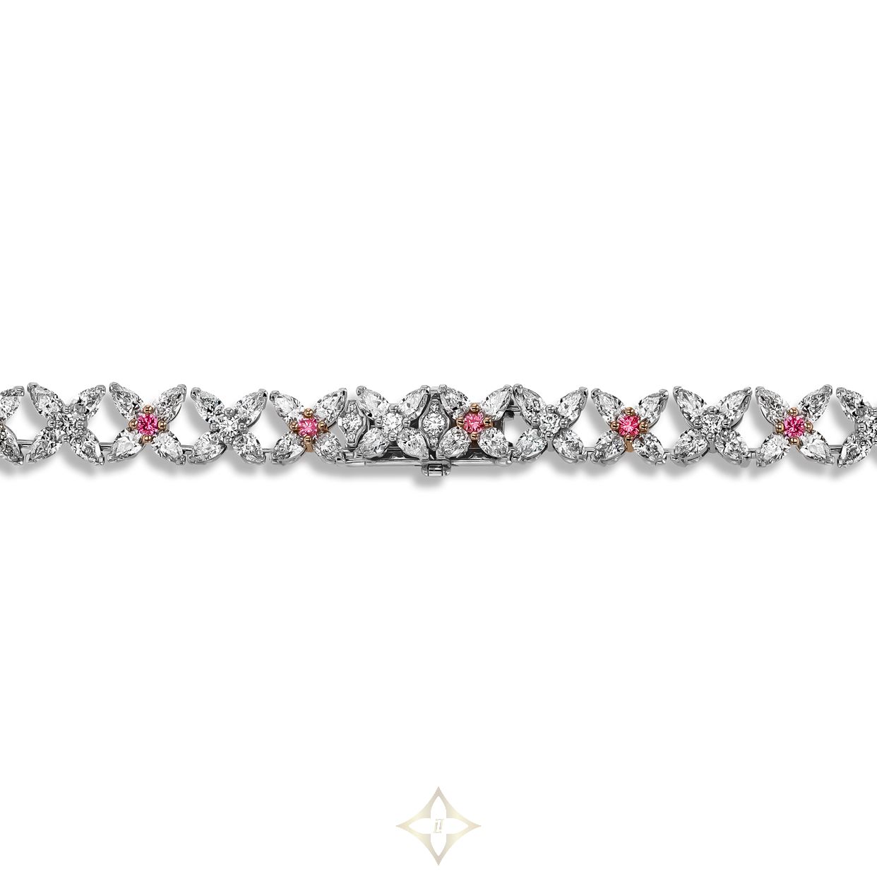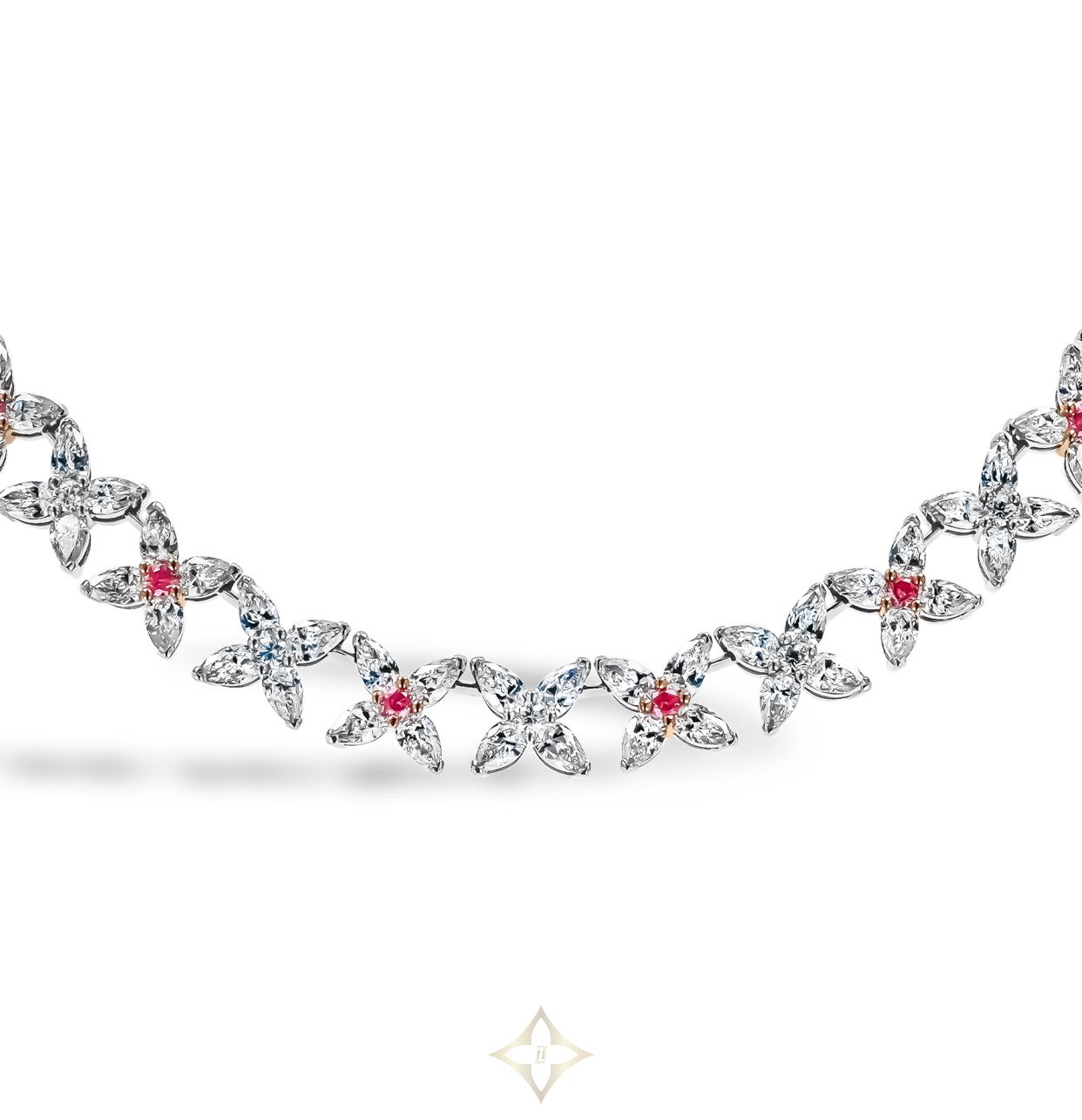 A captivating diamond necklace composed of arrangements of shimmering white pear cut diamonds (24.97cts) in a romantic kiss shaped design. Set into platinum each arrangement of four pear cut diamonds has been beautifully defined by central brilliant cut diamonds. Catching the eye these alternate between rare fancy intense pink and colourless examples (1.25/1.24cts). As a sixth-generation family jeweller Pragnell are experts at sourcing the rarest and most sought-after gemstones in the world. Natural coloured diamonds have been coveted by connoisseurs and collectors for hundreds of years with their ethereal adamantine lustre captivating all who gaze upon it. Only one in every ten thousand diamonds mined possesses a desirable colour, with fancy intense pink examples, resulting from a slippage in the crystal lattice, being hugely sought after. All Pragnell Masterpiece creations are unique expressions of our rich history of being part of the most special moments in our clients' lives. Handcrafted in our workshops in the heart of England they showcase exceptional artistry, craftsmanship and gemstones.