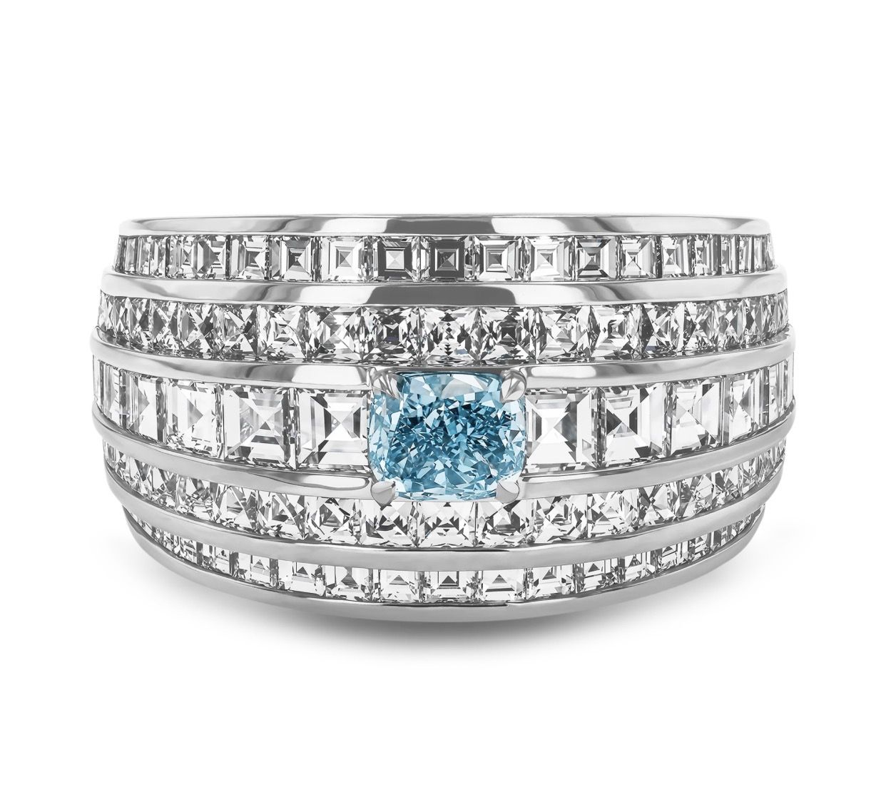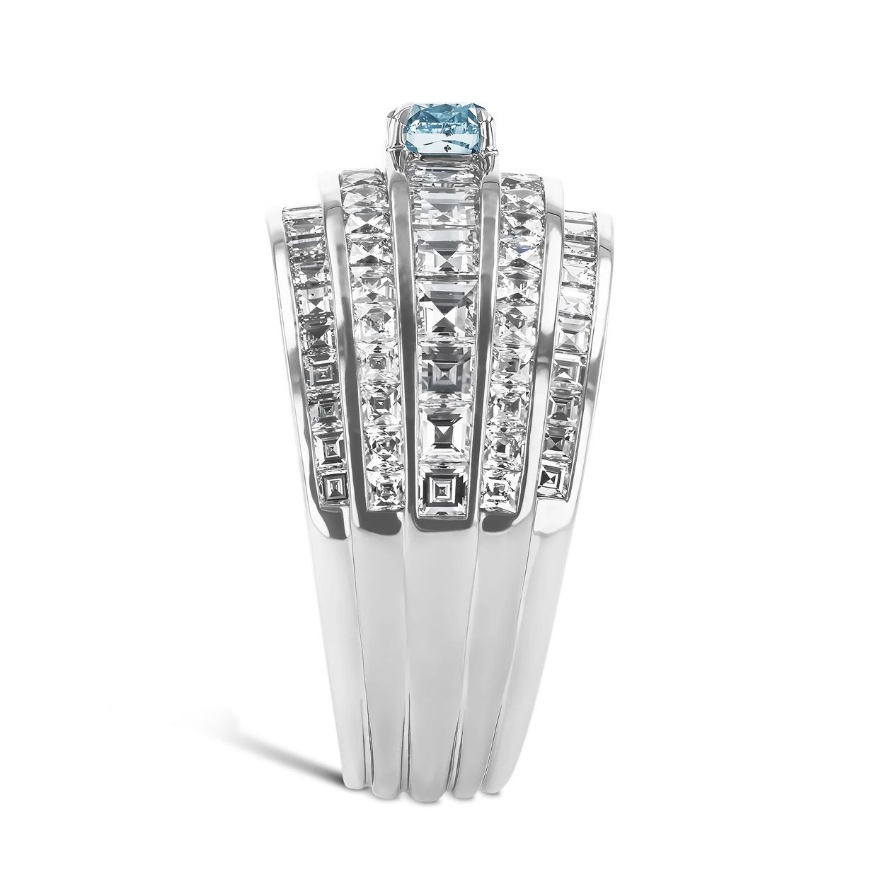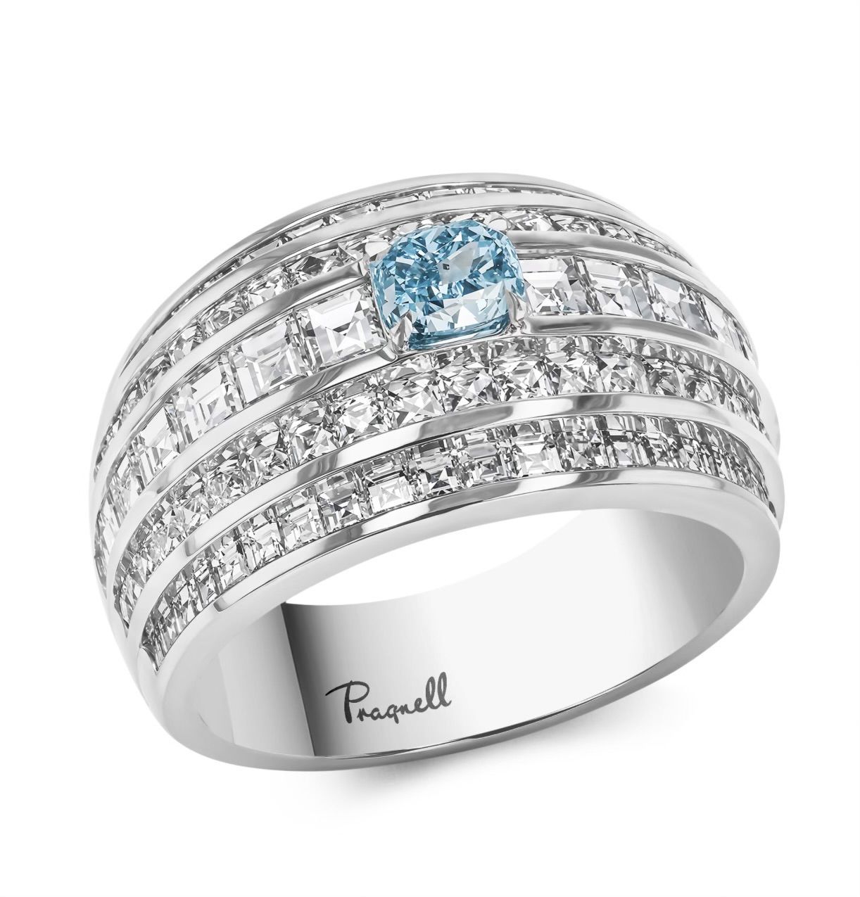The latest addition to our Manhattan range is a thoroughly modern interpretation of a classic Art Deco style. While apprenticing in the vibrant streets of New York City in the early 2000s, Charlie Pragnell found inspiration at every turn. As he wandered between workshops, the city's infinite energy and sense of optimism combined with the breathtaking skyline inspired this geometric jewellery collection, capturing the essence of perspective. Handcrafted in the Pragnell workshops from platinum, this five row classic ring features 2.64cts of carré and French cut channel set diamonds. All the white diamonds used in this collection have been individually fashioned into these more unusual cut styles to highlight the antique inspiration of this collection. Commanding attention, a rare fancy intense blue-green cushion cut diamond has been set as the centrepiece of this stunning masterpiece. As a sixth-generation family jeweller, Pragnell are expert at sourcing the rarest and most sought-after gemstones in the world. Fancy coloured diamonds have been coveted by connoisseurs and collectors for hundreds of years, with their ethereal adamantine lustre captivating all who gaze upon it. Only one in every ten thousand diamonds mined possesses a fancy colour, with Fancy Intense Blue-Green examples, resulting from boron and natural radiation being present when the diamond is formed, being particularly sought after. All fancy diamonds found at Pragnell are completely natural, with this example being accompanied by certification from the GIA. All Pragnell Masterpiece creations are unique expressions of our rich history of being part of the most special moments in our clients' lives. Handcrafted in our workshops in the heart of England,