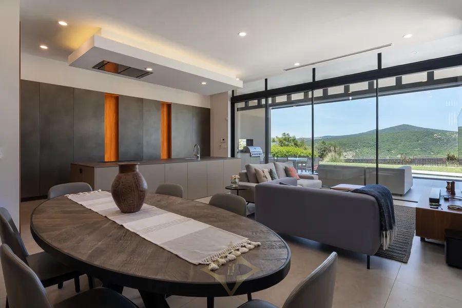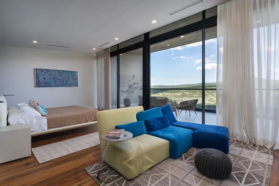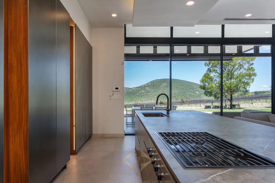 Floor-to-ceiling double glass windows and sliding doors, framed in premium aluminum by Cortizo were imported from Spain, inviting abundant natural light and frame the captivating landscape that surrounds the property. Throughout the home, bathrooms are adorned with imported Porcelanosa wall and floor tiles, and Porcelanosa and Hansgrohe fixtures complement and elevate a daily routine into spa-like experience.