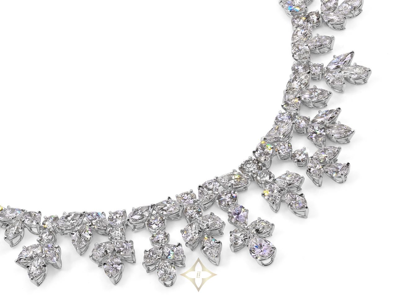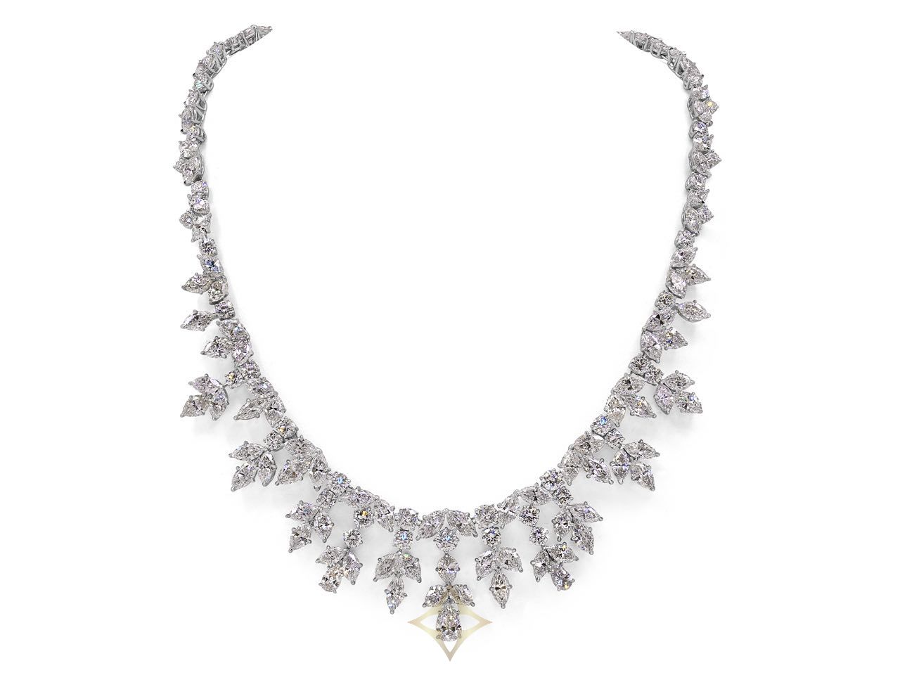 Suspending a fringe of alternating quatrefoil pear-shape diamonds and trefoil marquise diamonds, from a marquise and round diamond line, mounted in platinum.