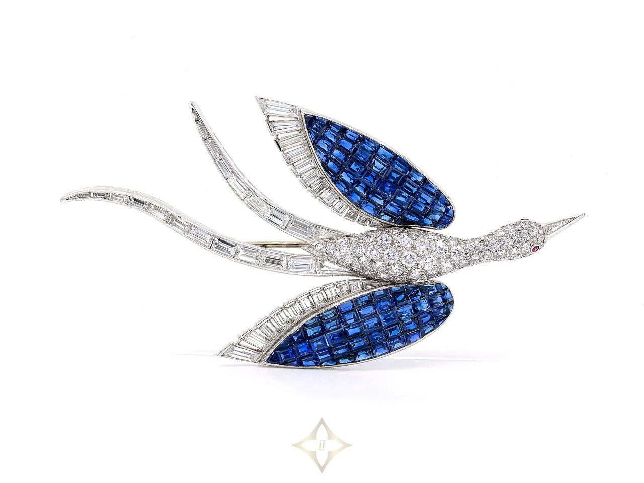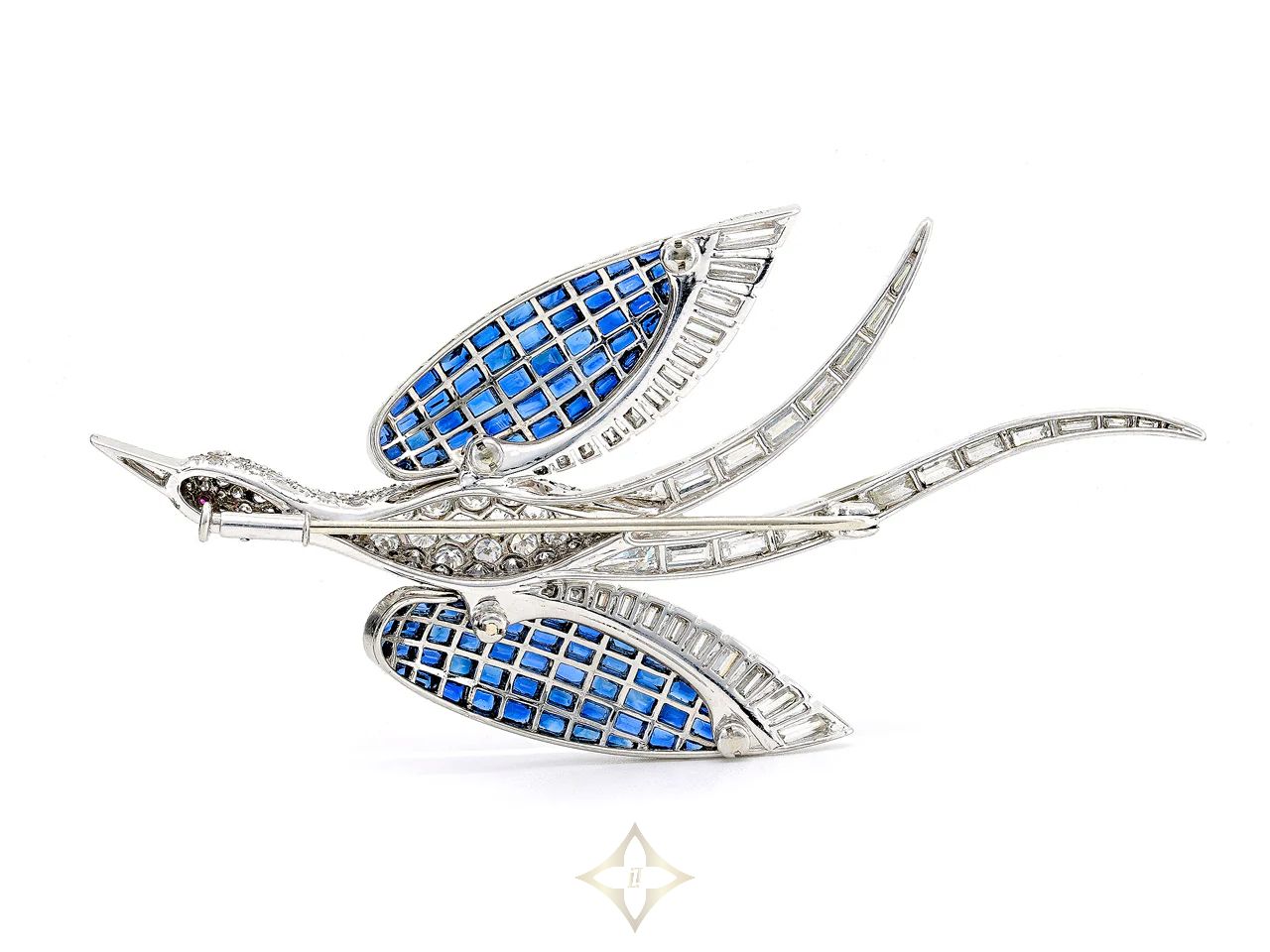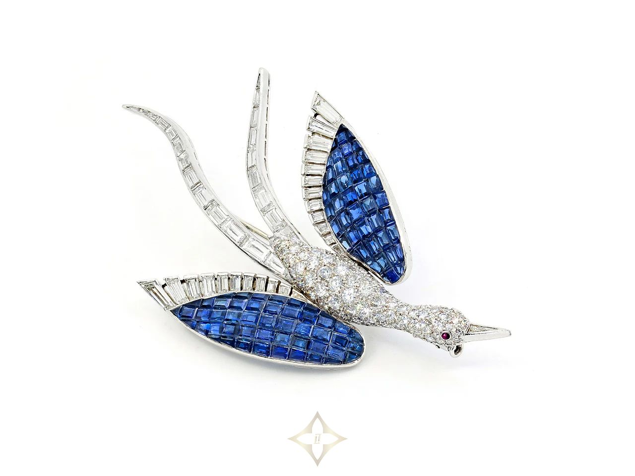 Mid-Century Invisibly-set Sapphire, Diamond & Platinum Bird Brooch, French | CA 🇺🇸