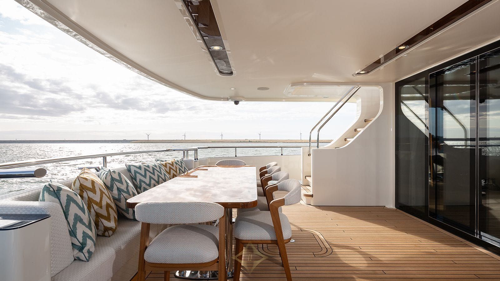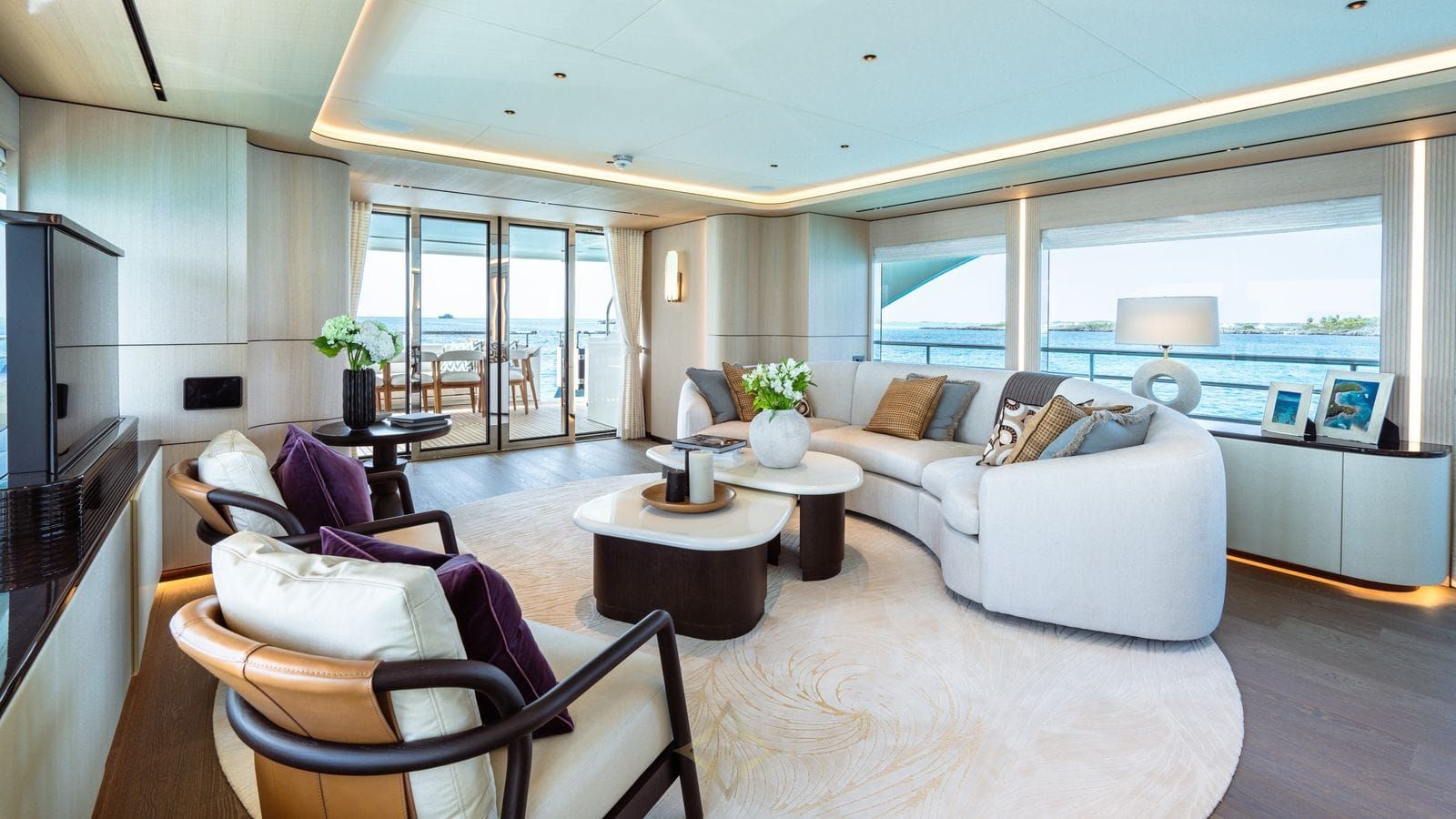 Outside, the expertise of exterior designer René van der Velden shines through with expansive exterior decks and a generous top deck spanning 775 square feet (72 square meters). Whether lounging in the sun or dining al fresco, there is ample space for relaxation and entertainment.