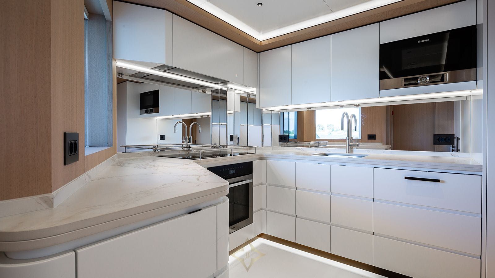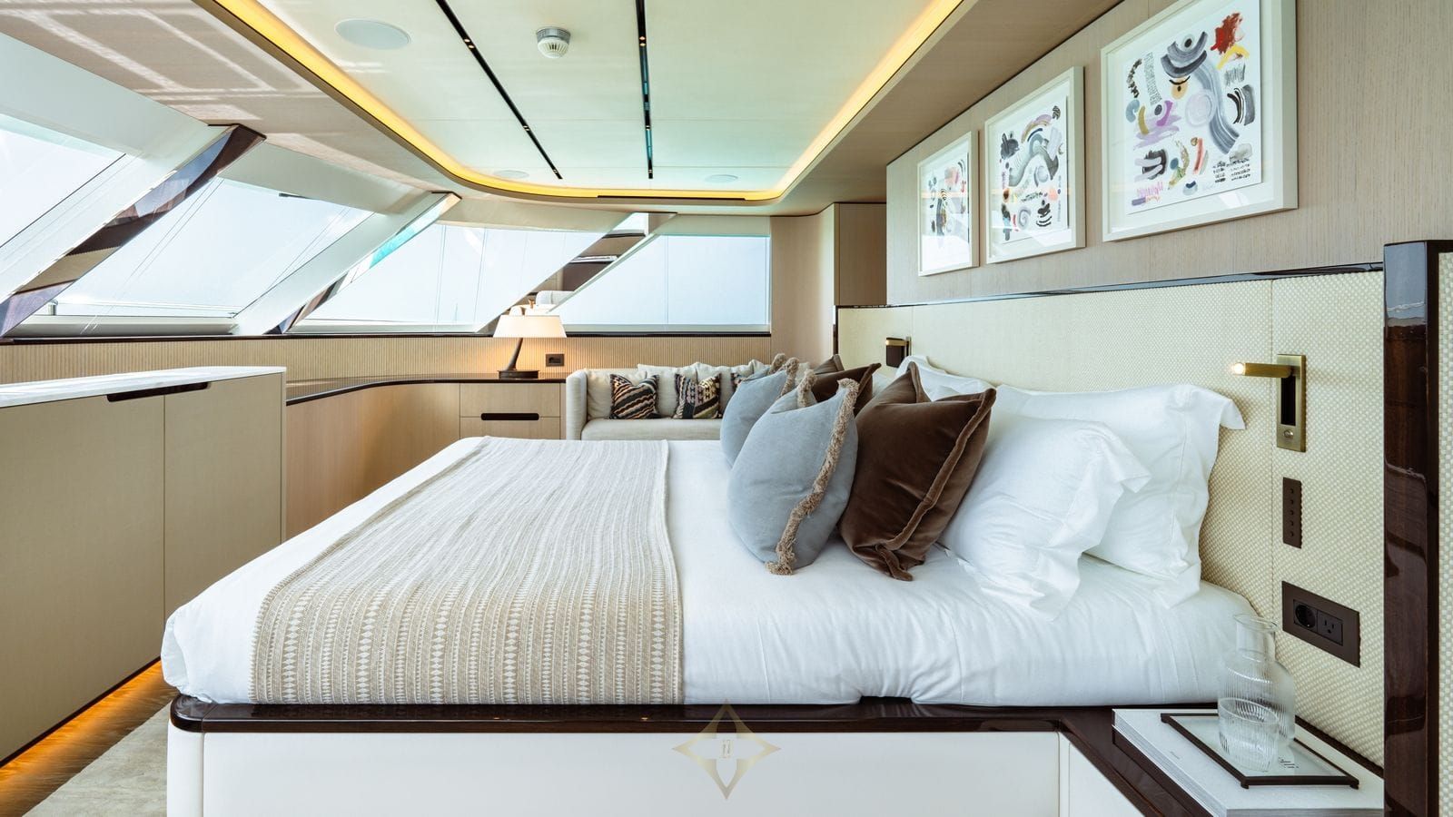 Designed by the renowned Studio Indigo, the interior of the Moonen 110 boasts stylish sophistication and versatility, with every detail carefully considered to enhance the onboard experience. Boasting over 7’ (2m) of headroom, the interior exudes a sense of spaciousness, complemented by a versatile layout that ensures every inch of space is utilized effectively. Despite her size, the vessel reads larger, thanks to its clever design and ample volume, providing guests with a luxurious and comfortable environment to relax and unwind.