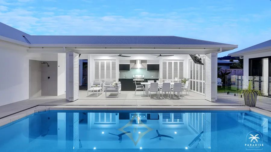 - Pavillion Summer House & Pool Cabana with Colorbond Steel Louvres and sliding stacker doors and waterproof outdoor coastal fans provide the ultimate space for entertainment. The Outdoor Kitchen & Dining Area offers stone benchtops, alfresco cabinetry, integrated bar fridge, Ziegler and Brown self-cleaning 5 burner barbeque and commercial extraction with media center and surround.