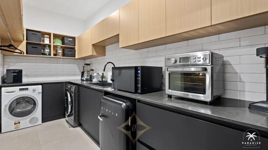 - Sophisticated Kitchen Design – the oversized central island bench with slimline black granite waterfall bench tops provides plenty of seating for entertaining. Custom cabinetry with deep walk in Butler’s Pantry and Laundry. Complimented by high-end integrated appliances, feature window and the Portofino SMEG 900mm induction freestanding oven and Range Hood (*world’s most energy-efficient large-format cooker).