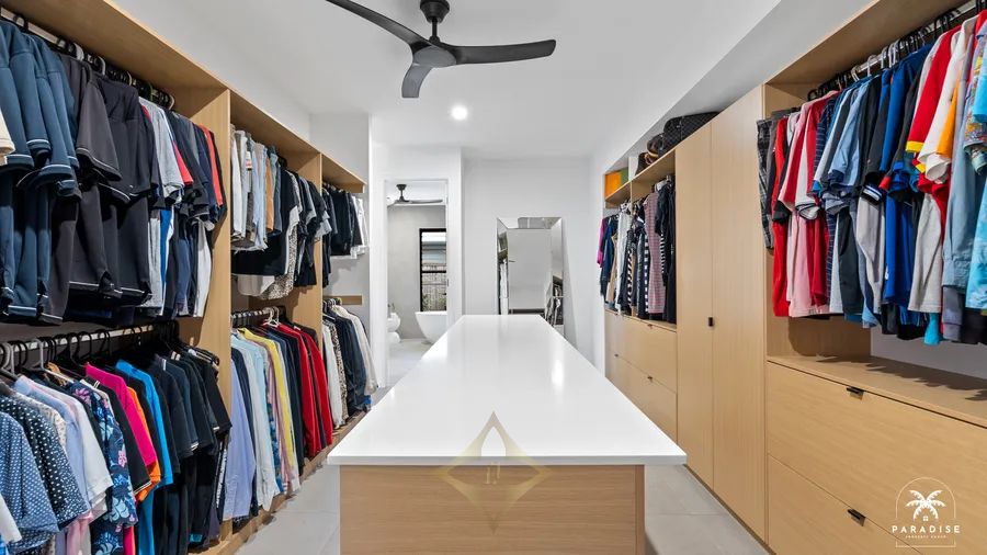- Luxurious Owners Suite of breathtaking scale designed to capture the sunrise with its bank of tropical tinted glass louvers that overlook the pool promoting cross ventilation and cool breezes. Oversized natural stone floor tiles lead you through the vast walk through the Dressing Room and Personal Gym Space (currently set up as office).