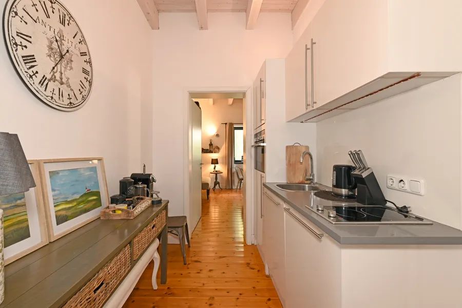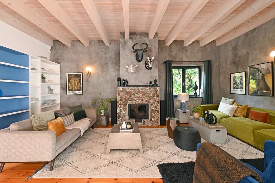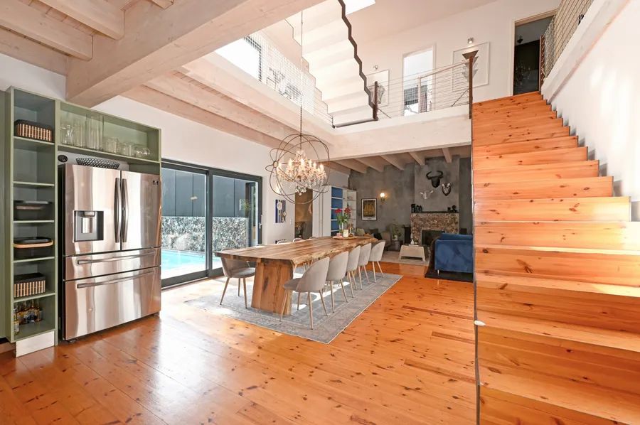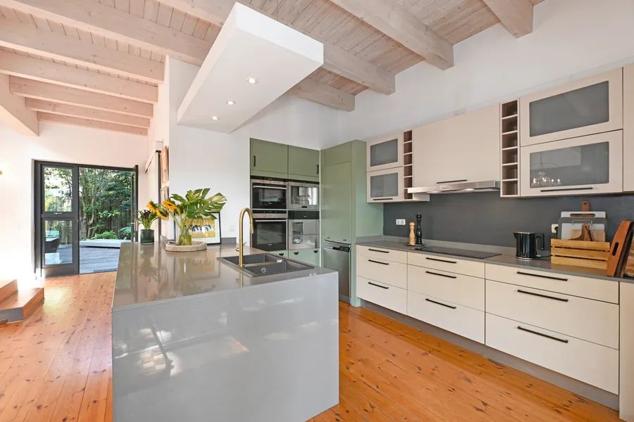 Open plan well equipped kitchen, dining area with big table. The lounge with sofas, fireplace and smart TV. All in one double volume spacious room.