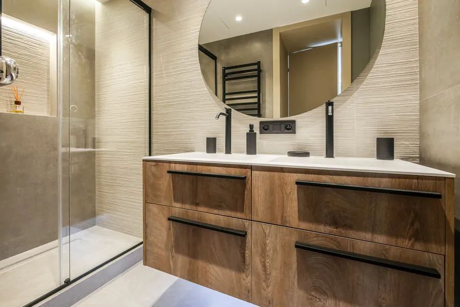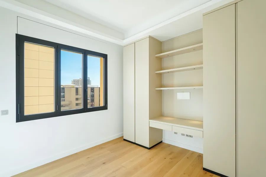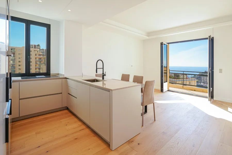 This 2-bedroom apartment has been tastefully renovated in a contemporary style with light, elegant tones. Its corner configuration, combined with its main façade facing South/West, ensures abundant natural light throughout the day. The layout has been carefully redesigned to optimise space and functionality. It comprises an entrance hall leading to a bright living room with a fully equipped open-plan kitchen. This living area opens onto a balcony overlooking Boulevard de Suisse, offering panoramic views of the city, Monaco’s port, and the Rock.