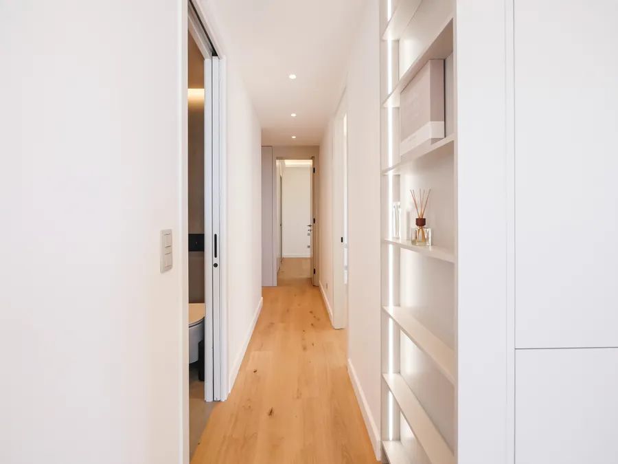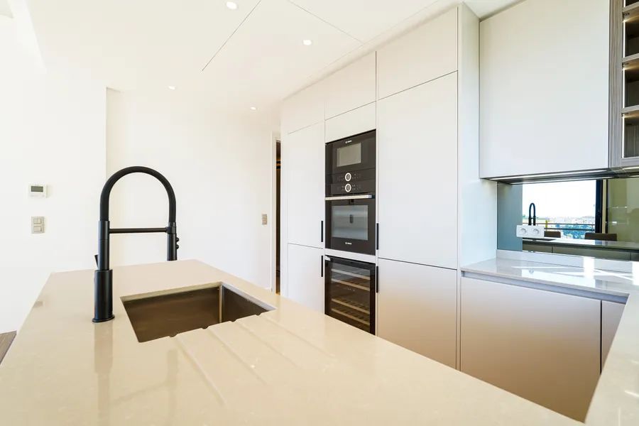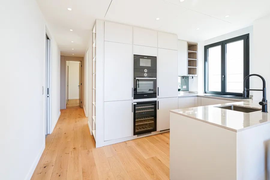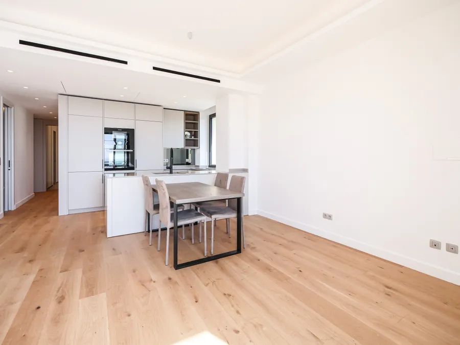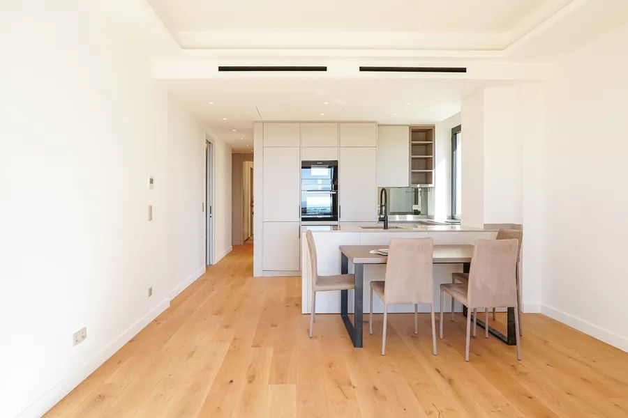 The night area features two comfortable bedrooms with fitted wardrobes, including a master with an en-suite shower room. A second shower room with toilet, as well as a separate guest toilet, complete the apartment. Fully air-conditioned, it offers modern comfort and convenience in every detail.