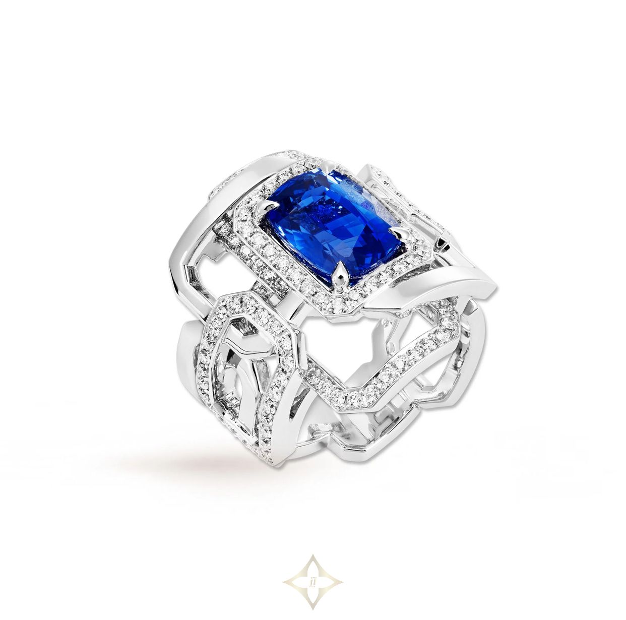 The Architecte Mosaïque ring is a graphic ring whose geometric shapes intersect and intertwine around a sublime blue sapphire or an exceptional pink tourmaline. Like a subtle mosaic, this ring dresses the hand with modernity and femininity.