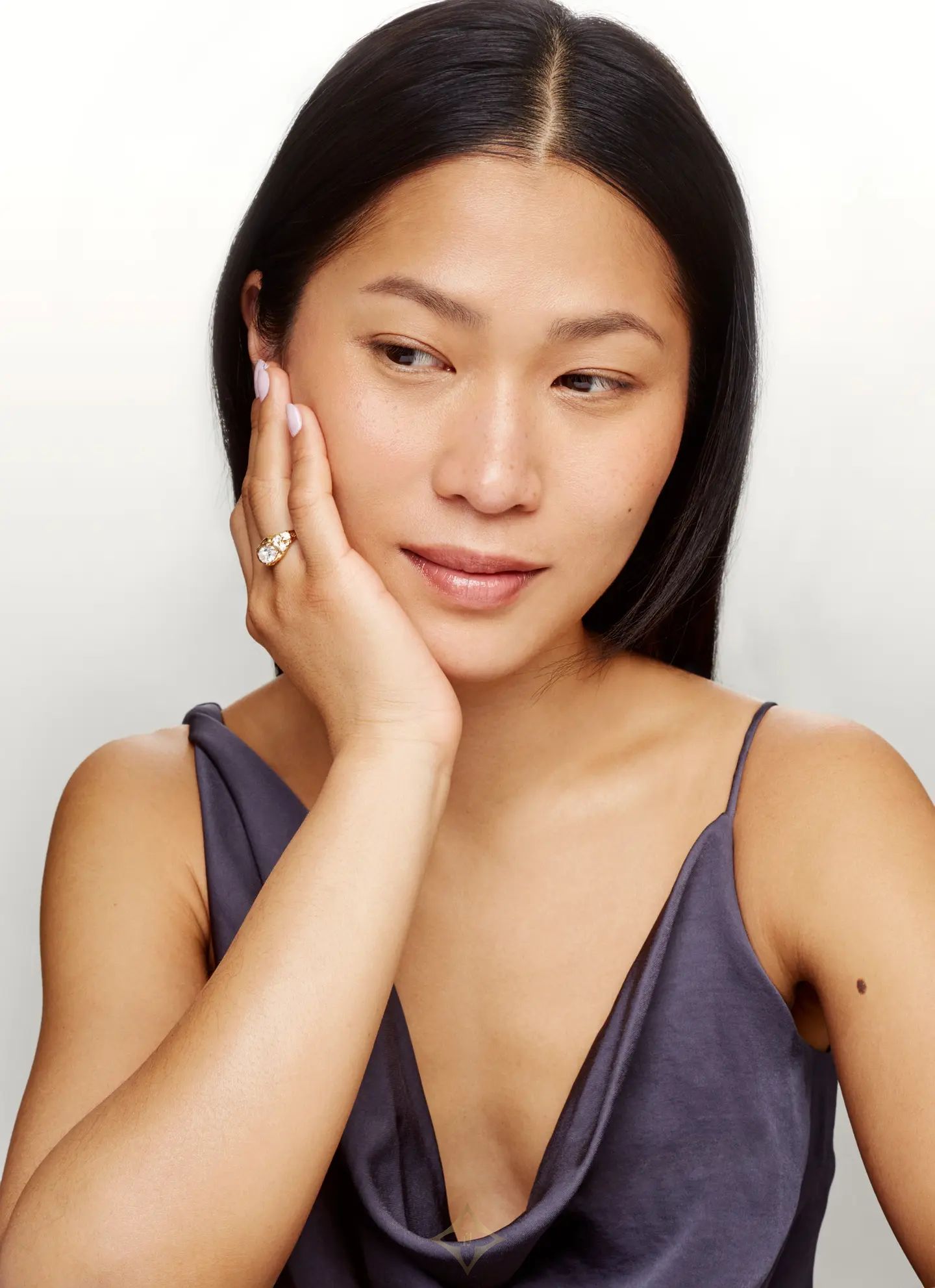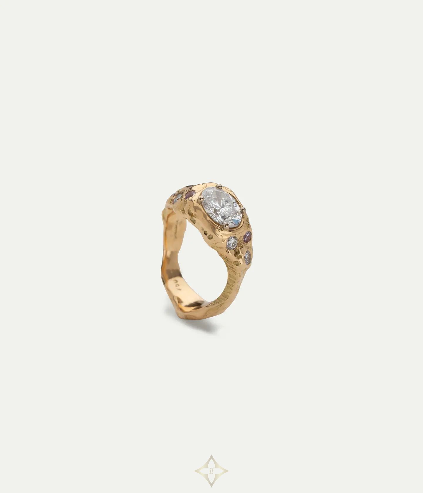 Nadia Shelbaya’s Lagoa Ring is a one-of-a-kind piece with a raw yet refined allure. A 1.02-carat central diamond (E White, VS1) sits atop an 18k yellow gold setting (750/1000), accented with scattered diamonds (0.20 ct, F-G White, VVS) and pink sapphires (0.16 ct). Its sculptural, textured design evokes organic beauty, striking a perfect balance between strength and elegance.