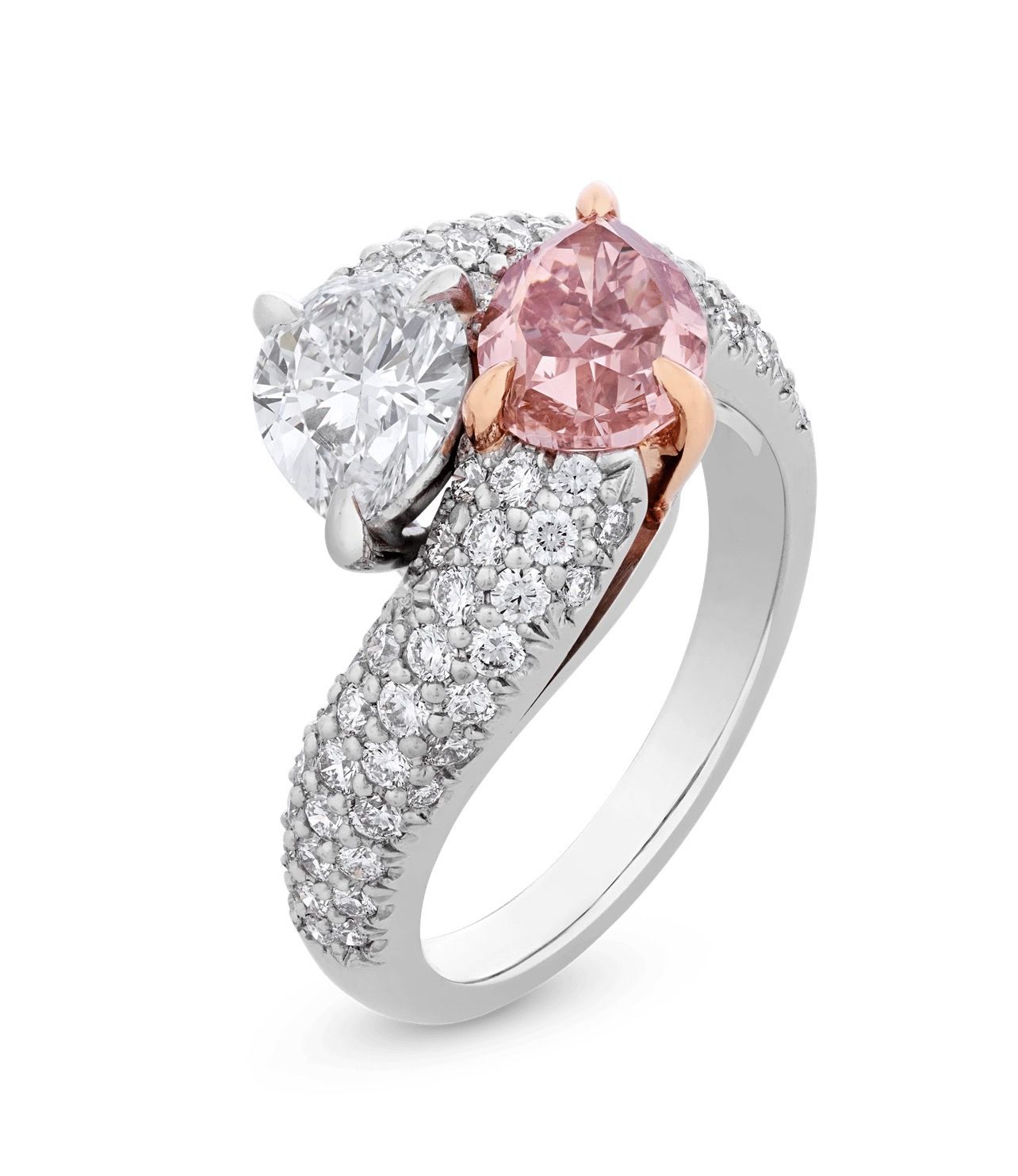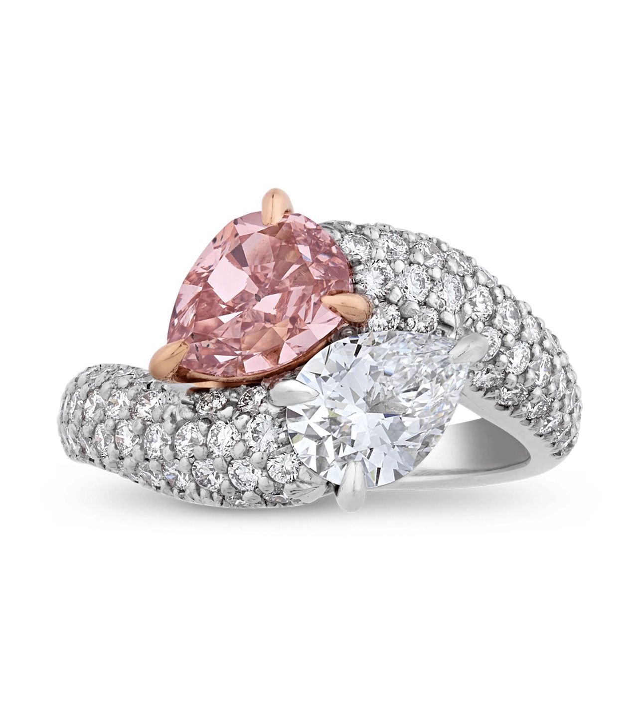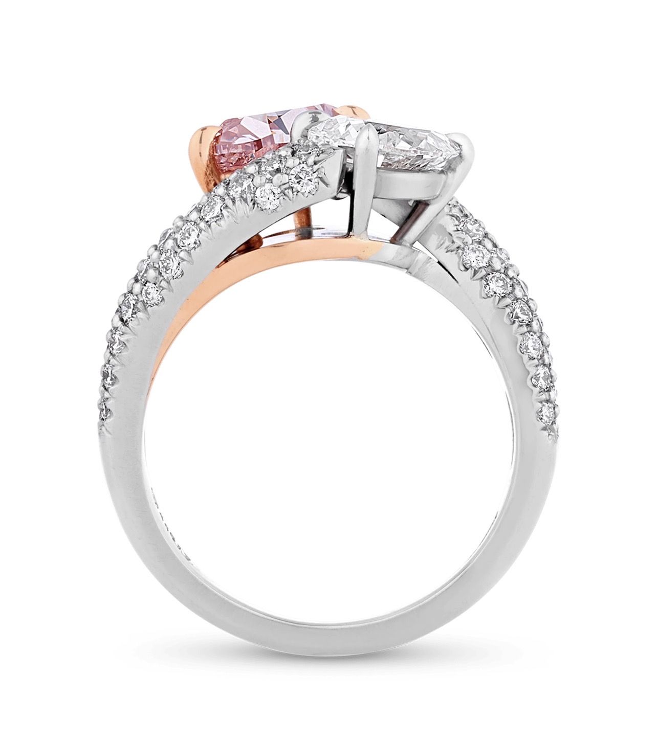 This stunning ring features two incredible stones, including a natural fancy intense pink diamond