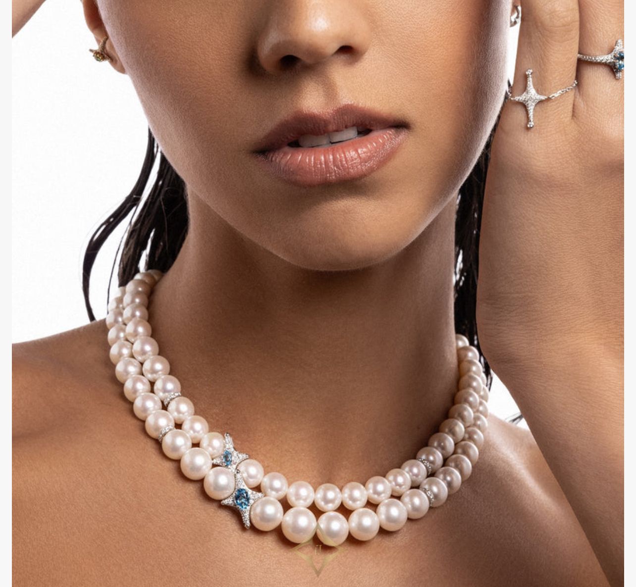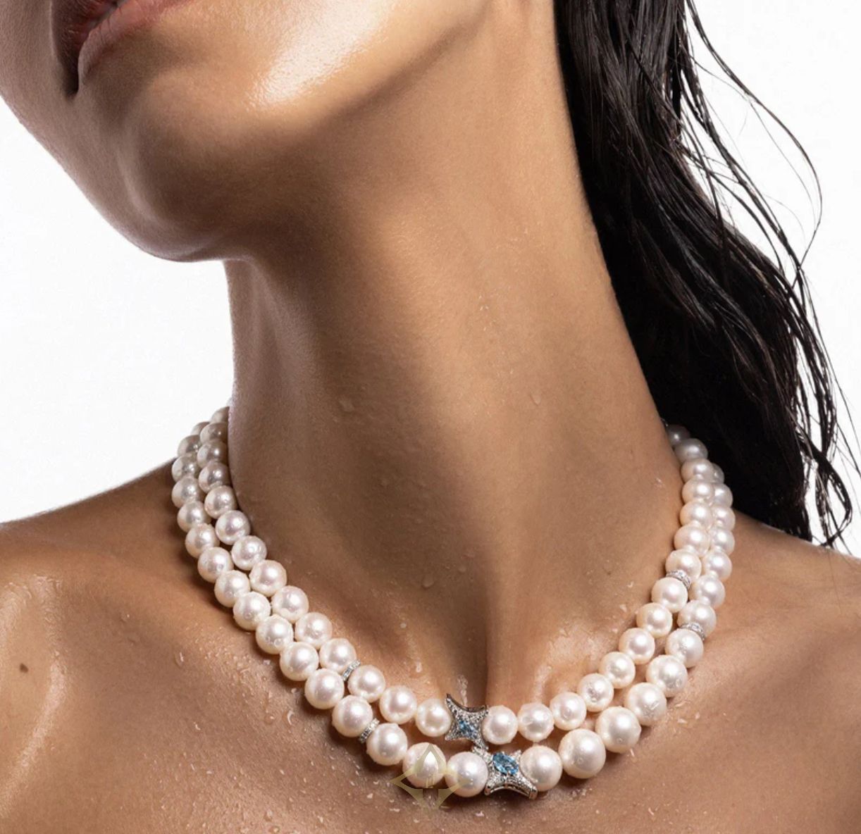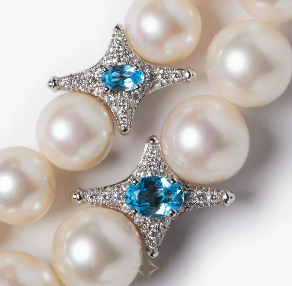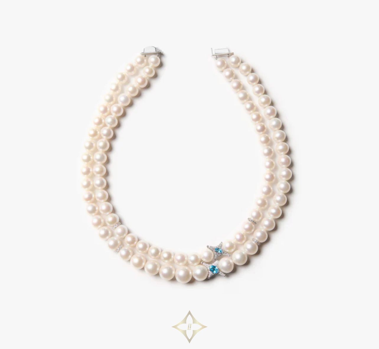 Nereide Pearl Necklace Price: 184.025.629₫ Product Details The Nereide Pearl Necklace features two strands of pearls with white gold sword-inspired pendants, each set with an oval-cut blue topaz. Diamond-set disc beads add subtle detailing to the round fresh-water pearls. This statement piece balances the celestial and oceanic inspirations of the collection, where delicate beauty and strength blend in perfect harmony. Colour: White Gold Main material: 18 Carat Gold Made in: UAE Materials and Care 18K White Gold: 9.04 Grams Round Diamonds: 112 units / 1.092 Carats Sky Blue Topaz: 2/ 1.10 Carats Fresh Water Pearls: 474.40 Carats Cherish your 18 carat solid gold and diamond jewelry for a lifetime: store separately in a soft pouch or jewelry box and avoid exposure to chemicals. To restore shine, clean with a warm water and soap and dry gently with a soft cloth. Periodically check prongs and settings for security. Ofa Jewellery Trading LLC  The Binary by Omniyat No.117, Dubai, UAE Email: Info@ofaofficial.com Call/WhatsApp: +971 501156116