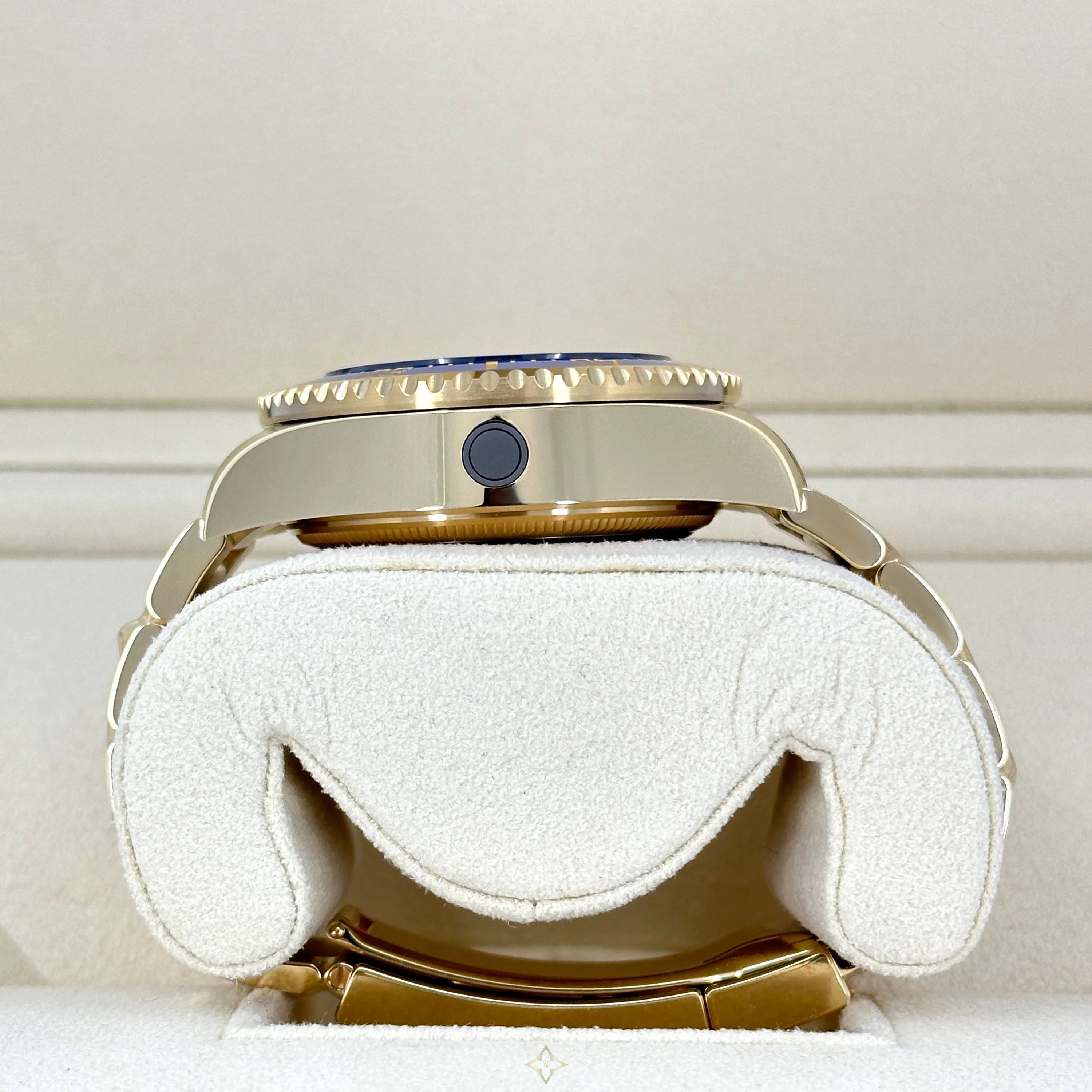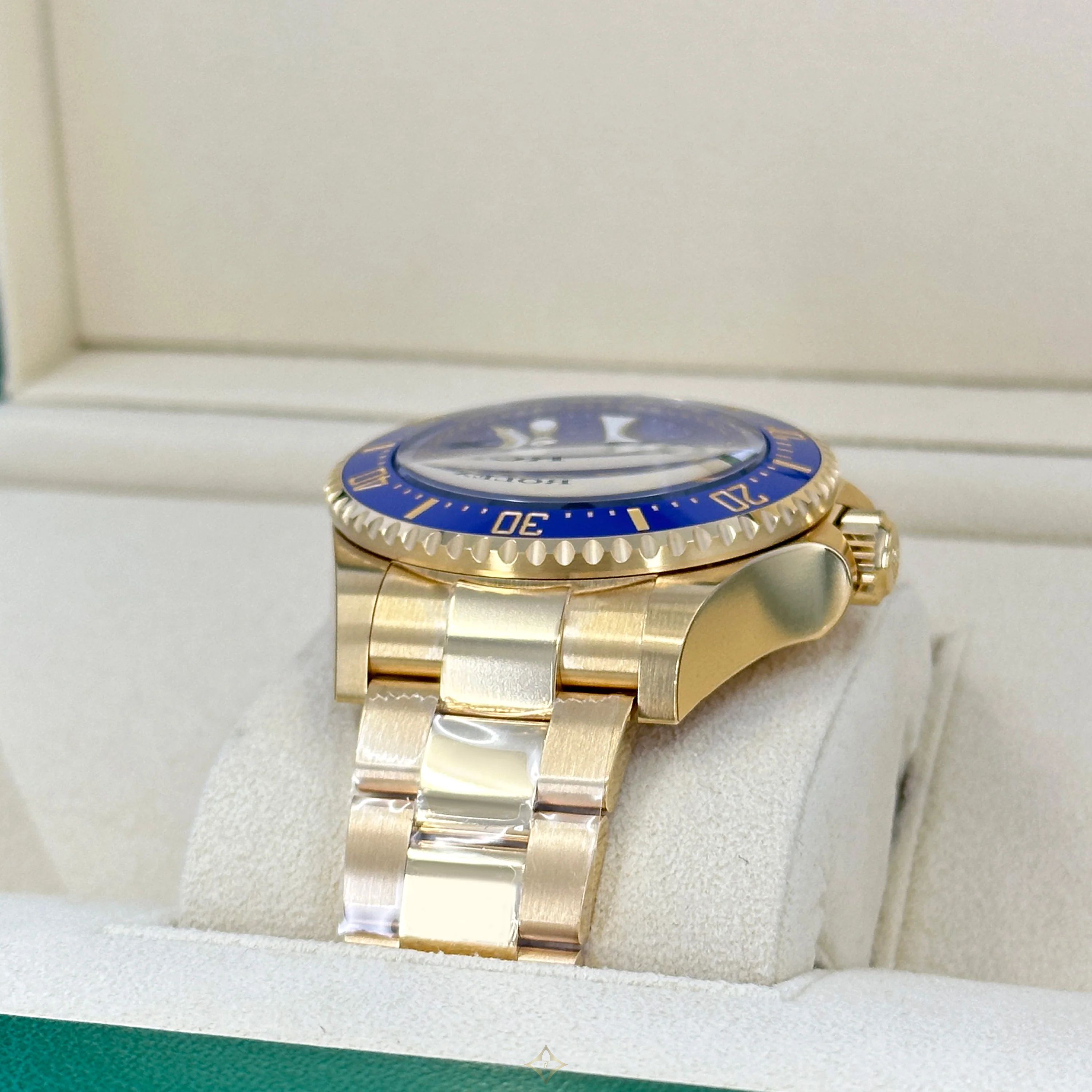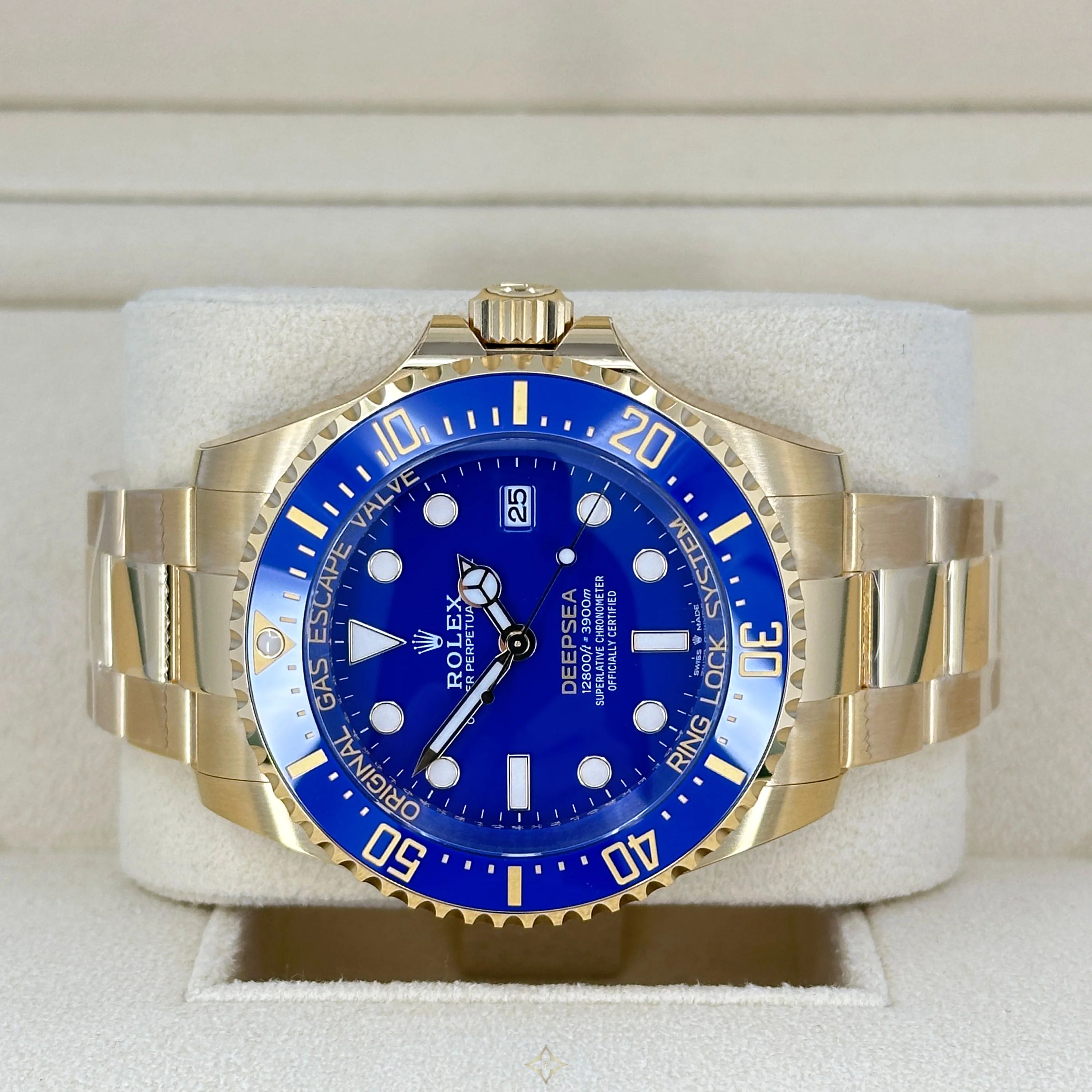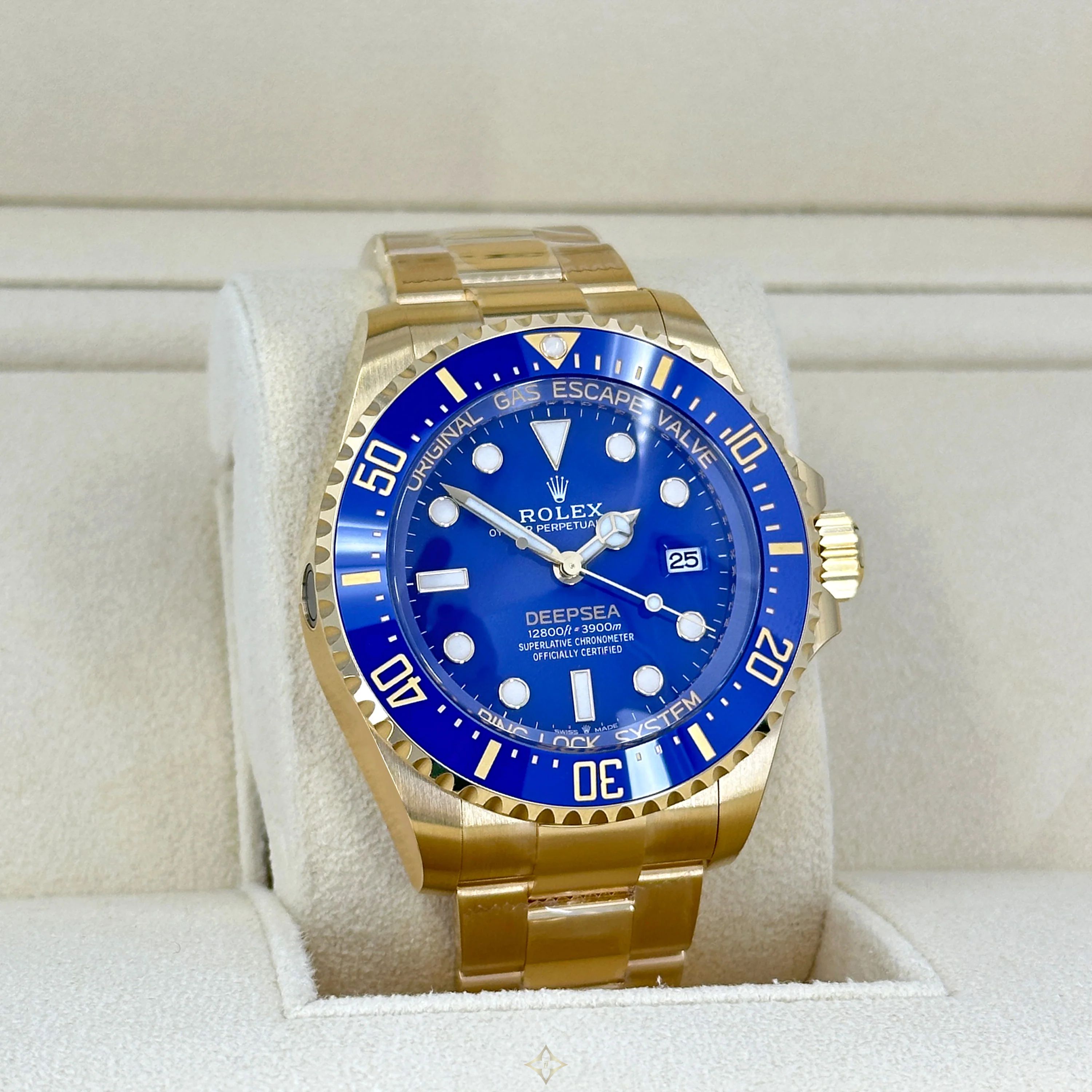 Introducing the Rolex Deepsea, a pinnacle of advanced engineering and luxurious design. This extraordinary timepiece features a 44mm 18 kt yellow gold case with a Cerachrom bezel insert in Blue ceramic, offering unparalleled durability and scratch resistance. The striking Blue dial is complemented by large luminescent markers, ensuring exceptional legibility even in the darkest depths. Equipped with the Rolex Caliber 3235, the Deepsea offers an impressive 70-hour power reserve and is water-resistant up to 3,900 meters. The watch is fitted with an Oyster bracelet, featuring the patented Glidelock and Fliplock extension systems, ensuring a secure and comfortable fit over diving suits. Offered in unworn condition, this Deepsea comes as a full set with the original Rolex box, booklets, and a Rolex warranty card dated 2024. Secure this exceptional timepiece today and experience the perfect fusion of cutting-edge technology and timeless style. The Rolex Deepsea is ideal for both professional divers and watch enthusiasts, ready to accompany you on any underwater adventure or sophisticated occasion.