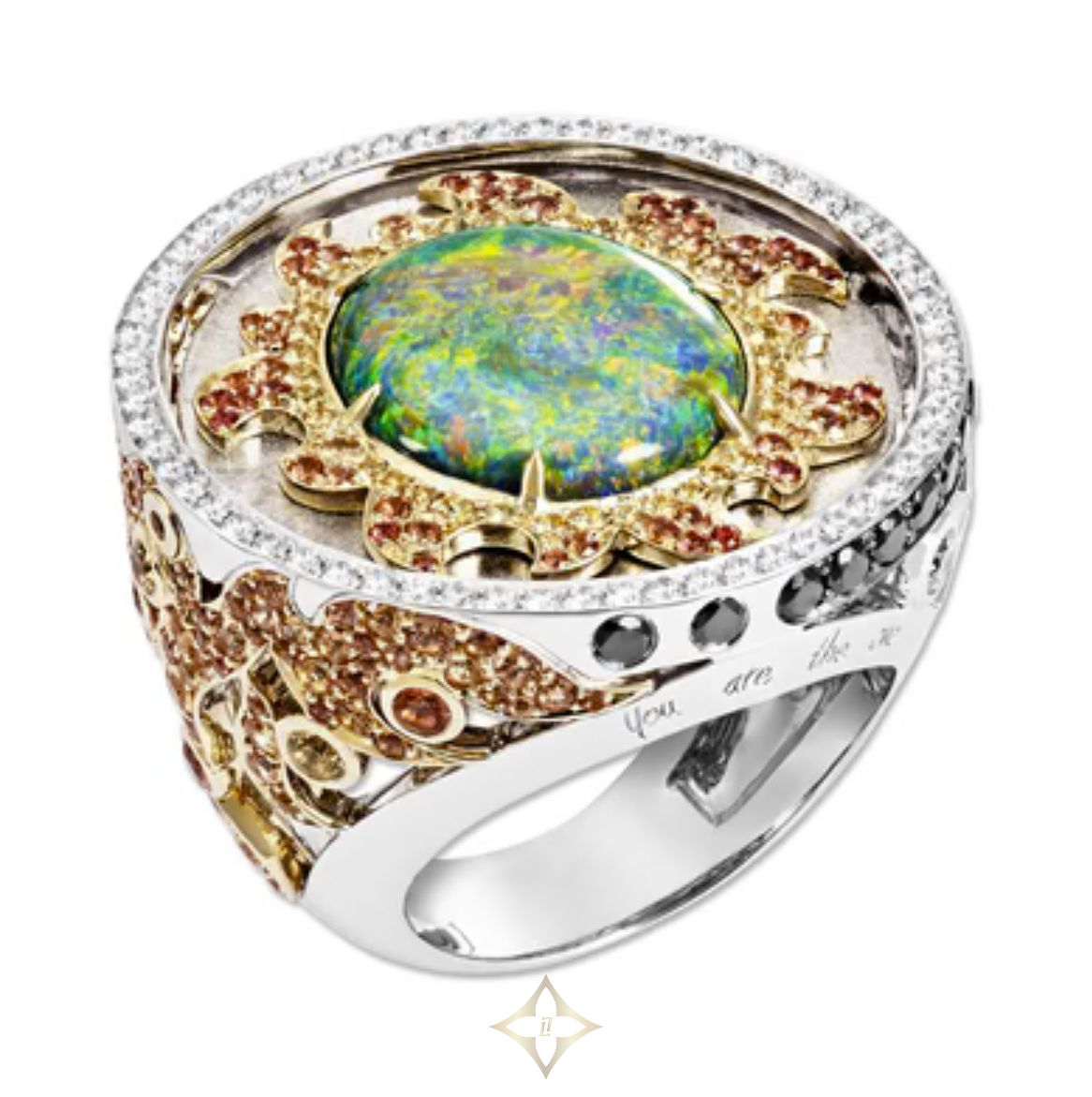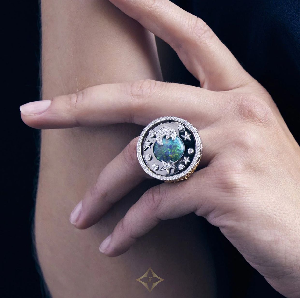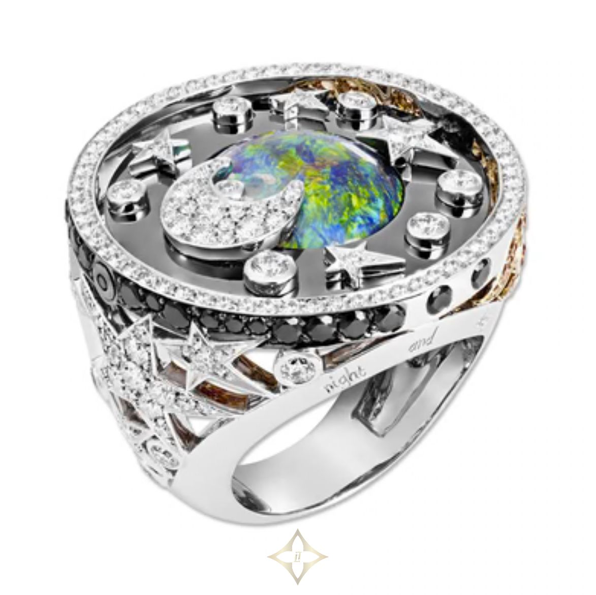 The Architecte Night & Day ring, a surprising creation, is a technical feat. Inspired by the song "Night and Day, you are the one" by Cole Porter, this jewel is a subtle declaration of love. The black opal on both sides represents the sun on one side and the moon surrounded by stars on the other. Two sides, a jewel that turns according to your desires, which make this ring a unique creation.
