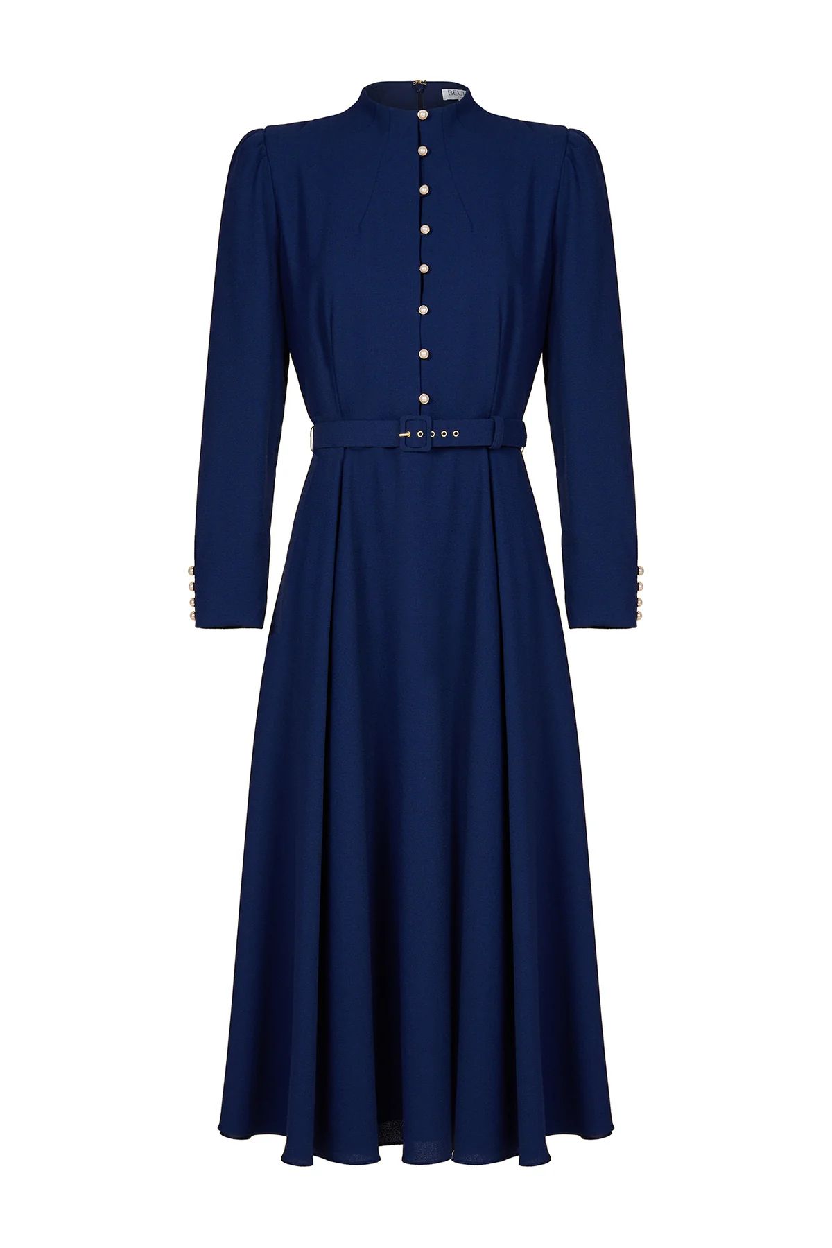 Introducing the Nyra Dress is a timeless addition to your wardrobe, crafted from luxurious wool crepe. This elegant design features a full, sweeping skirt and a tailored bodice, creating a sophisticated fit-and-flare silhouette with a longer sleeve length appropriate for colder months. Fully lined for comfort, the Nyra Dress is accented with a charming pearl button-front detail, a new mock neck collar neckline, and a belted waist to define your figure. This dress blends classic style with modern refinement, making it a must-have for your collection.