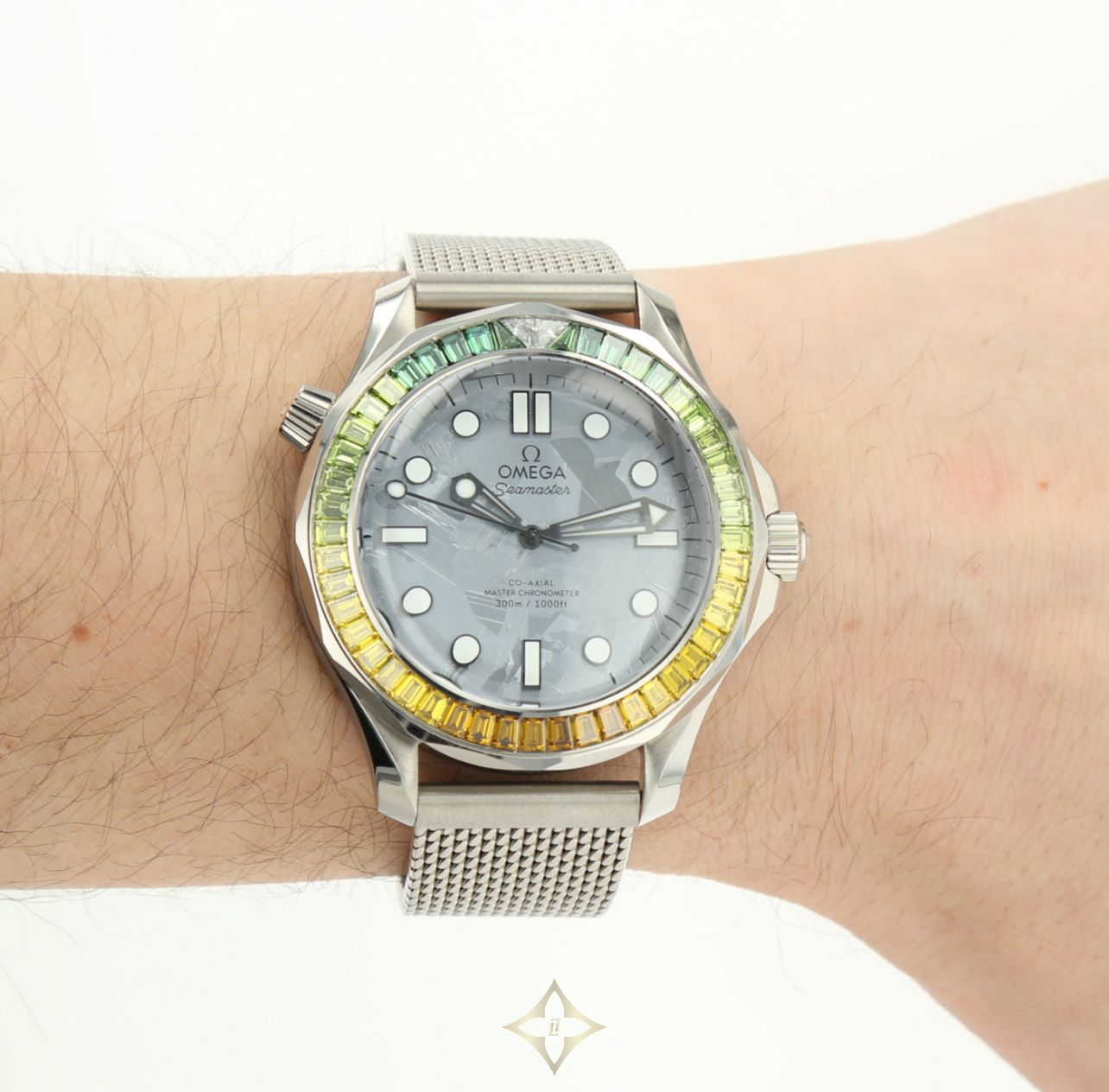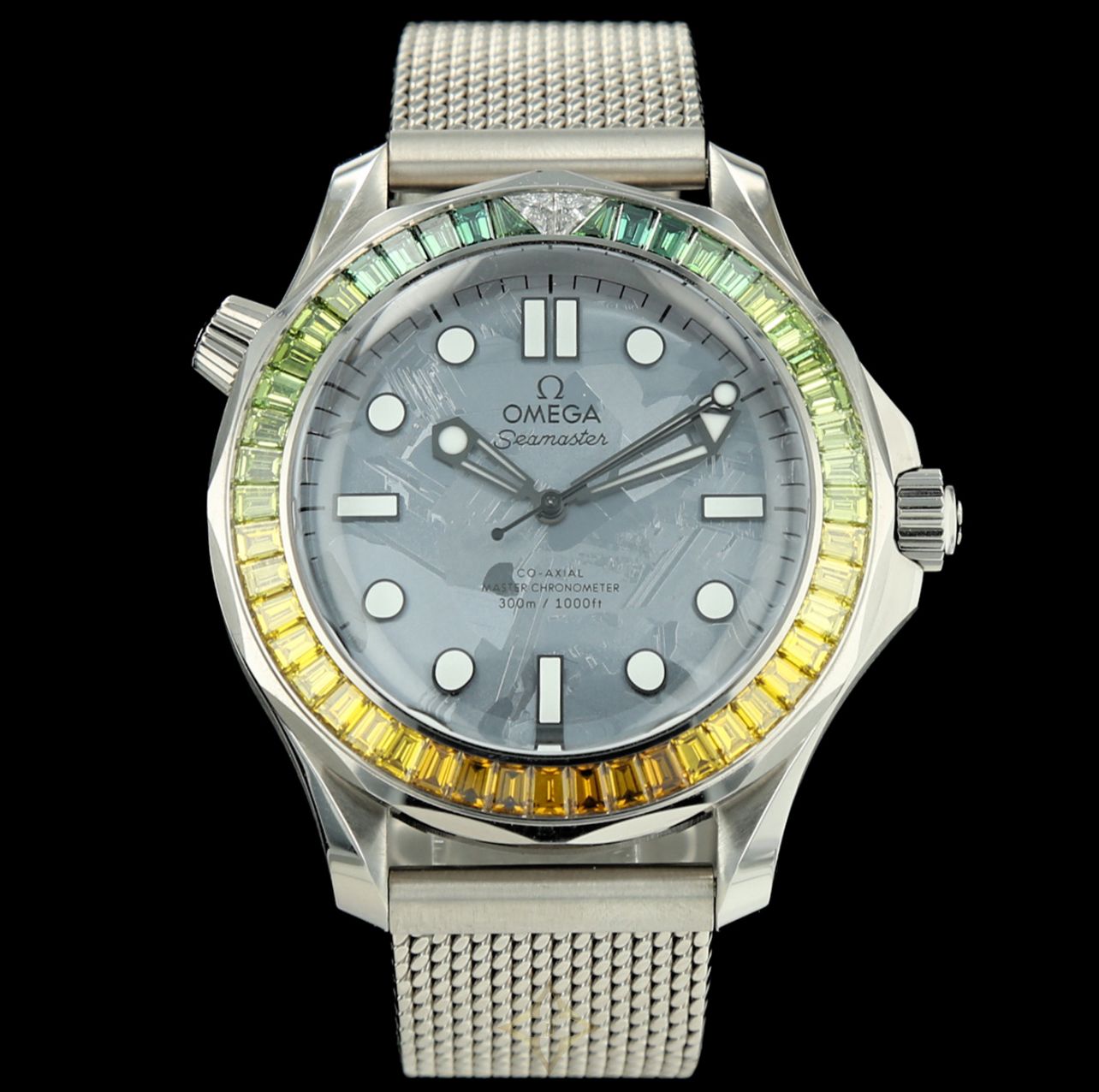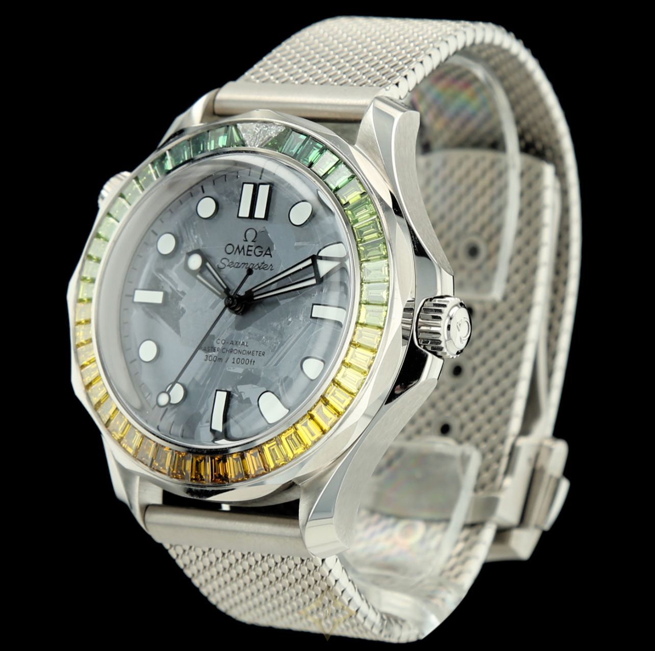 42 mm-diameter Canopus Gold case, Canopus Gold Milanese link bracelet with Omega-covered folding clasp. Scratch-resistant sapphire crystal and visible caseback revealing the movement, meteorite dial. Unidirectional rotating bezel set with 2 white diamonds at noon and a gradation of 47 trapeze-cut diamonds from green to orange for a total diamond weight of 4.91 carats. Total watch weight 286 grs.
