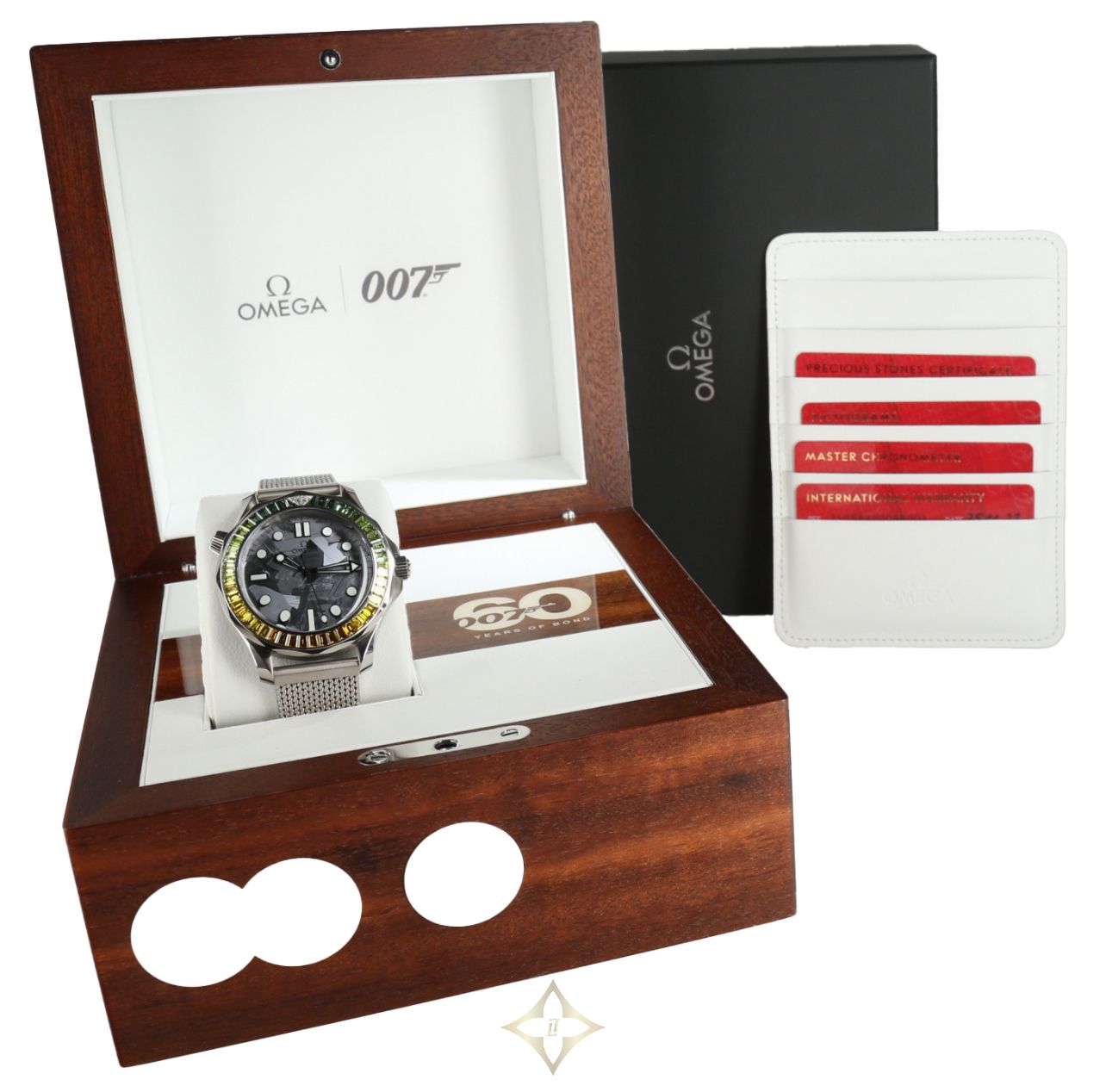 The watch is presented in a mango wood case adorned with mother-of-pearl marquetry, a Bond 60th anniversary logo and 1960s-inspired dots. The use of mango wood refers to Underneath The Mango Tree, the signature opus of Dr No, the first film in the James Bond saga.