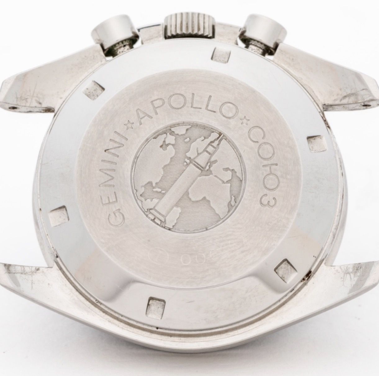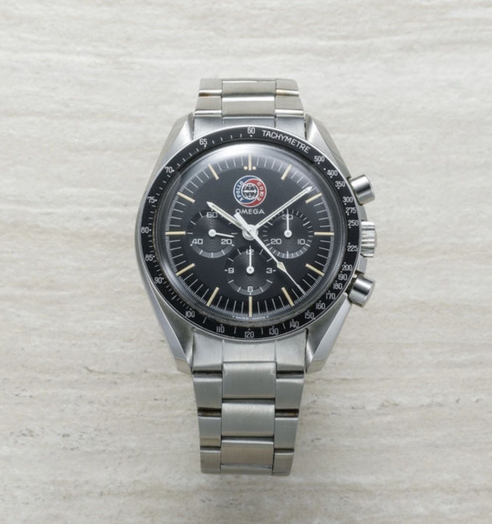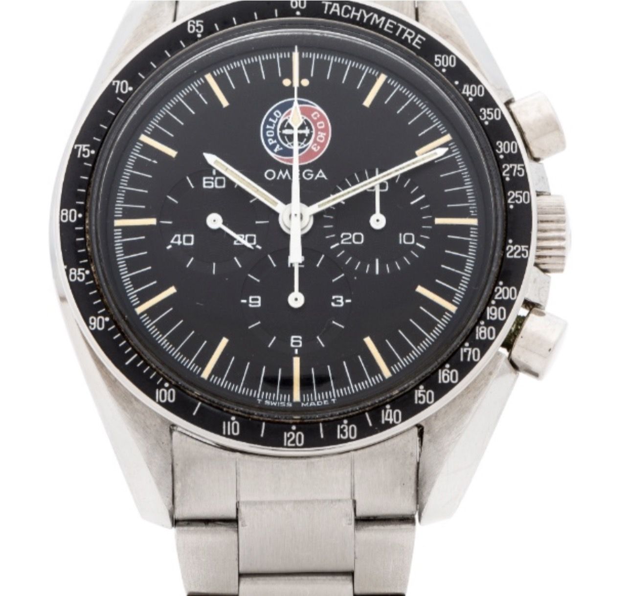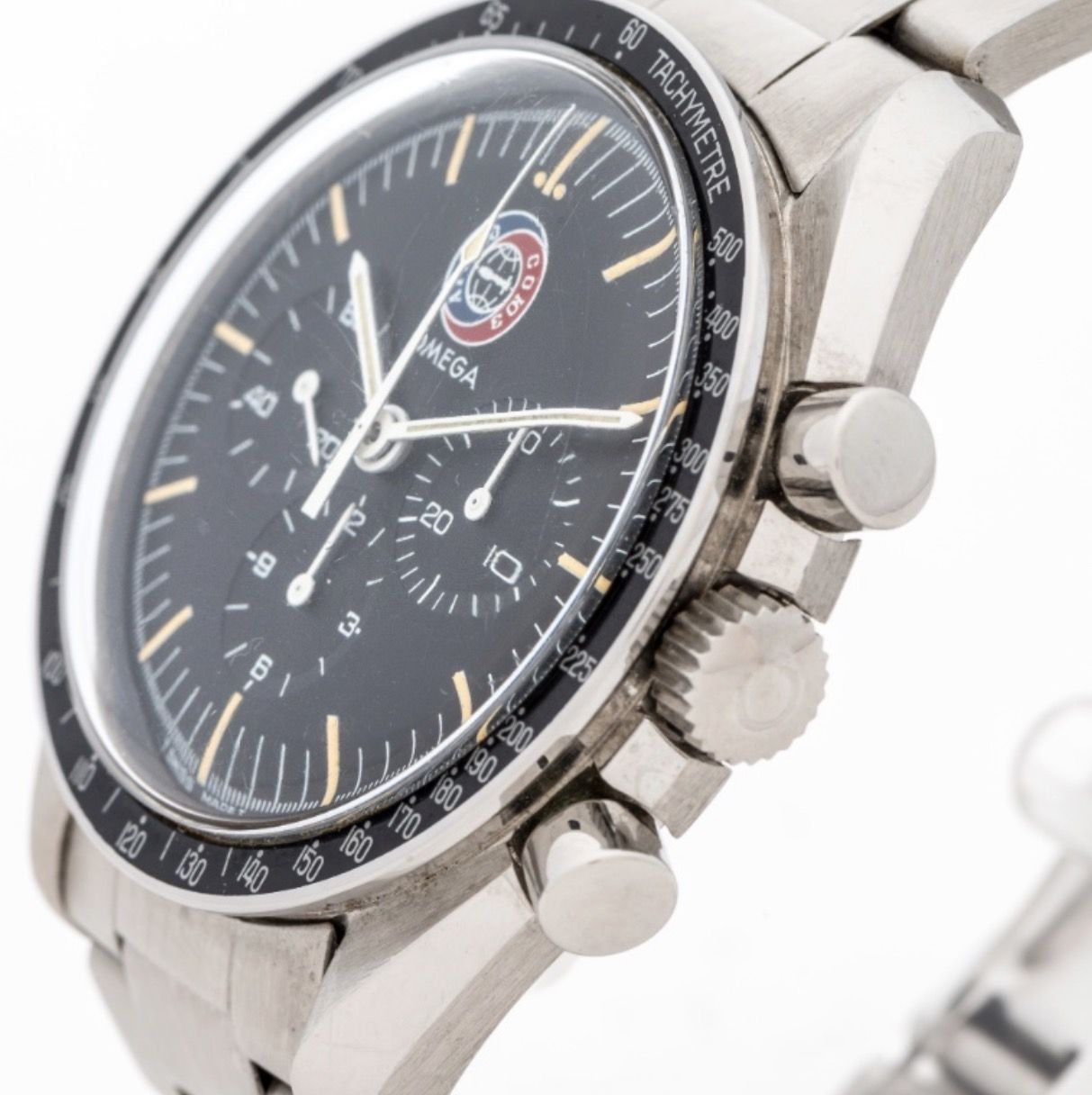 In commemoration of the successful mission between Russian and American space programs in 1975, Omega released its first numbered edition in stainless steel in 1976: The Apollo-Soyuz Speedmaster for the Italian Market. This is the only Speedmaster that does not mention Speedmaster on the dial and instead has the Apollo-Soyuz mission logo. It has special 5.5mm large pushers on the case and a commemorative numbered case back. Interestingly, it also has a special bracelet the 1168 'Oyster style' that is not seen on other Speedmasters.