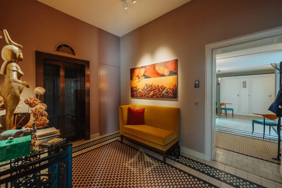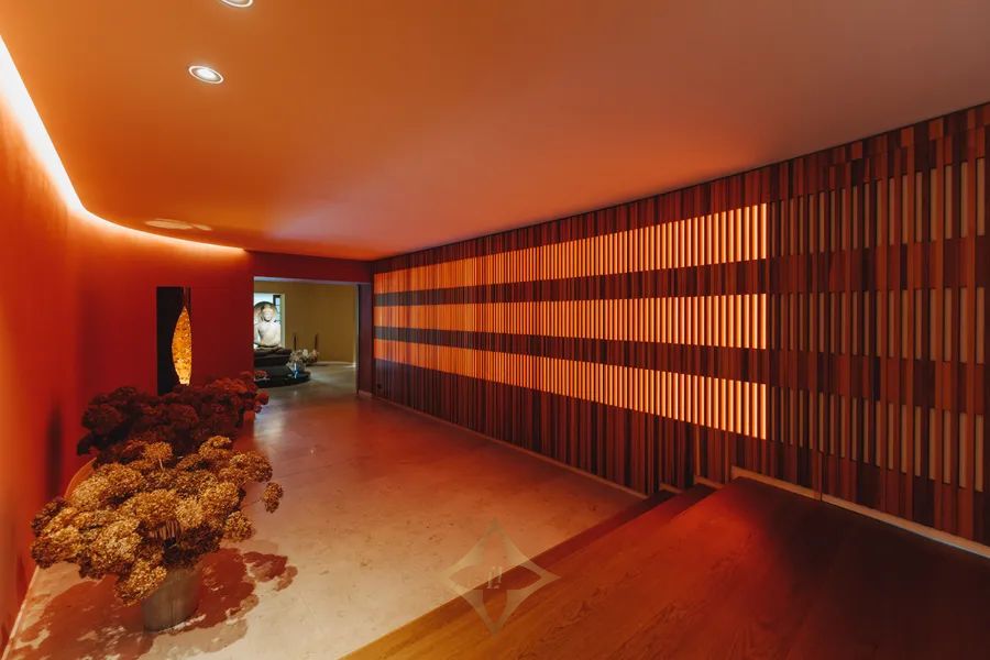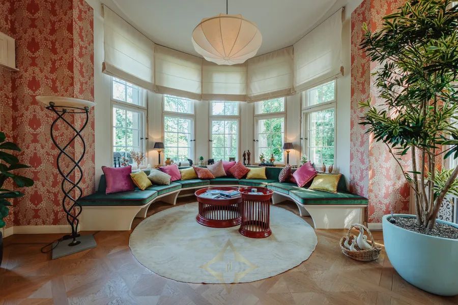 Spanning nearly 1,400 m² of refined interior space, the villa features six bedrooms and seven bathrooms including a specially designed Chinese and Indian bathroom. The centrepiece is a soaring double-height atrium clad in cherrywood and surrounded by a semicircle of formal salons, each with unique murals, carvings, or panelling.