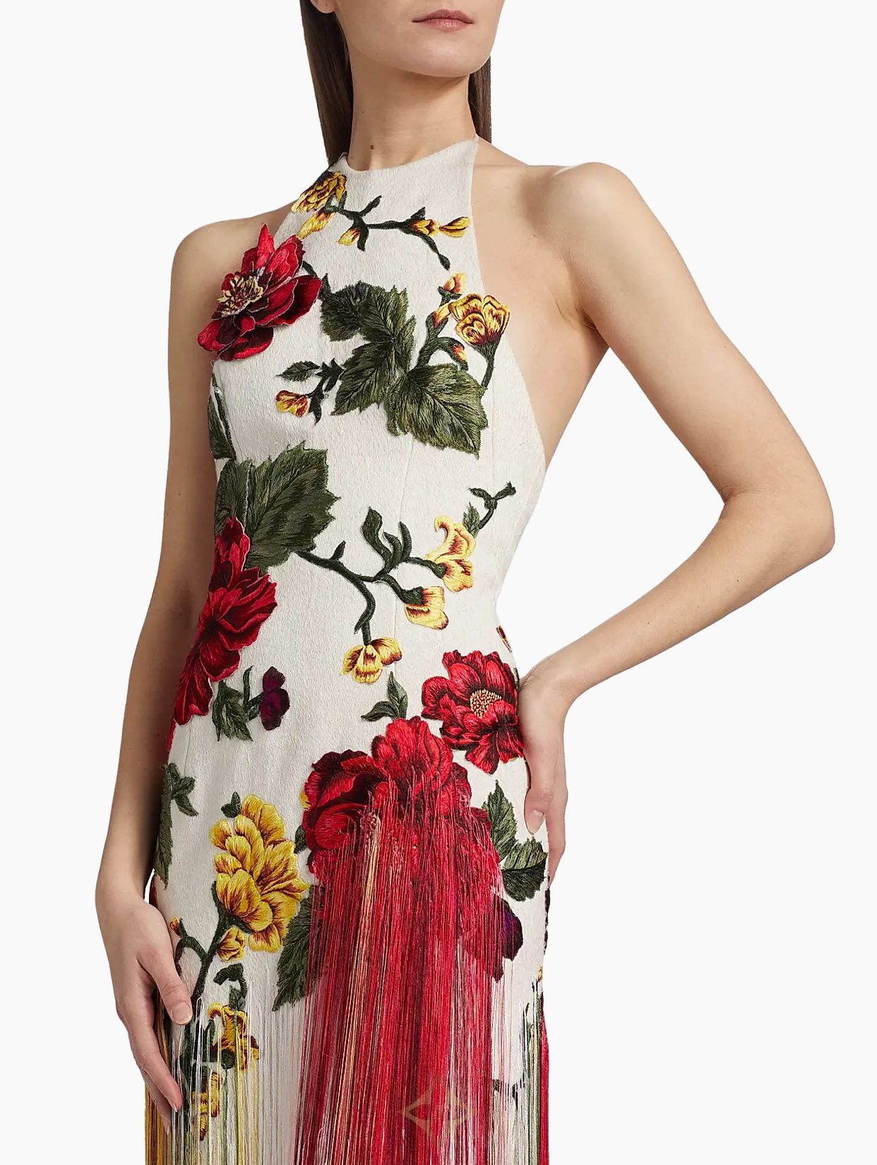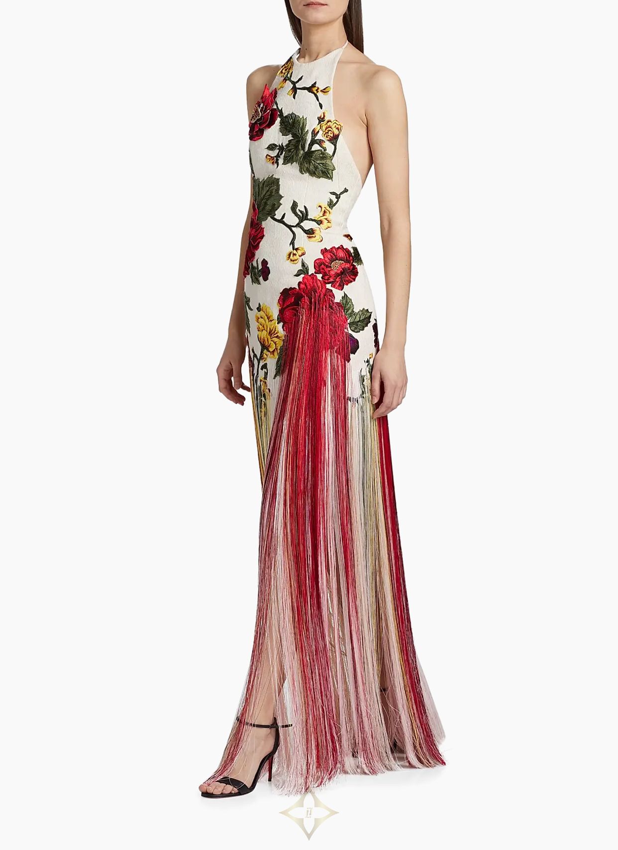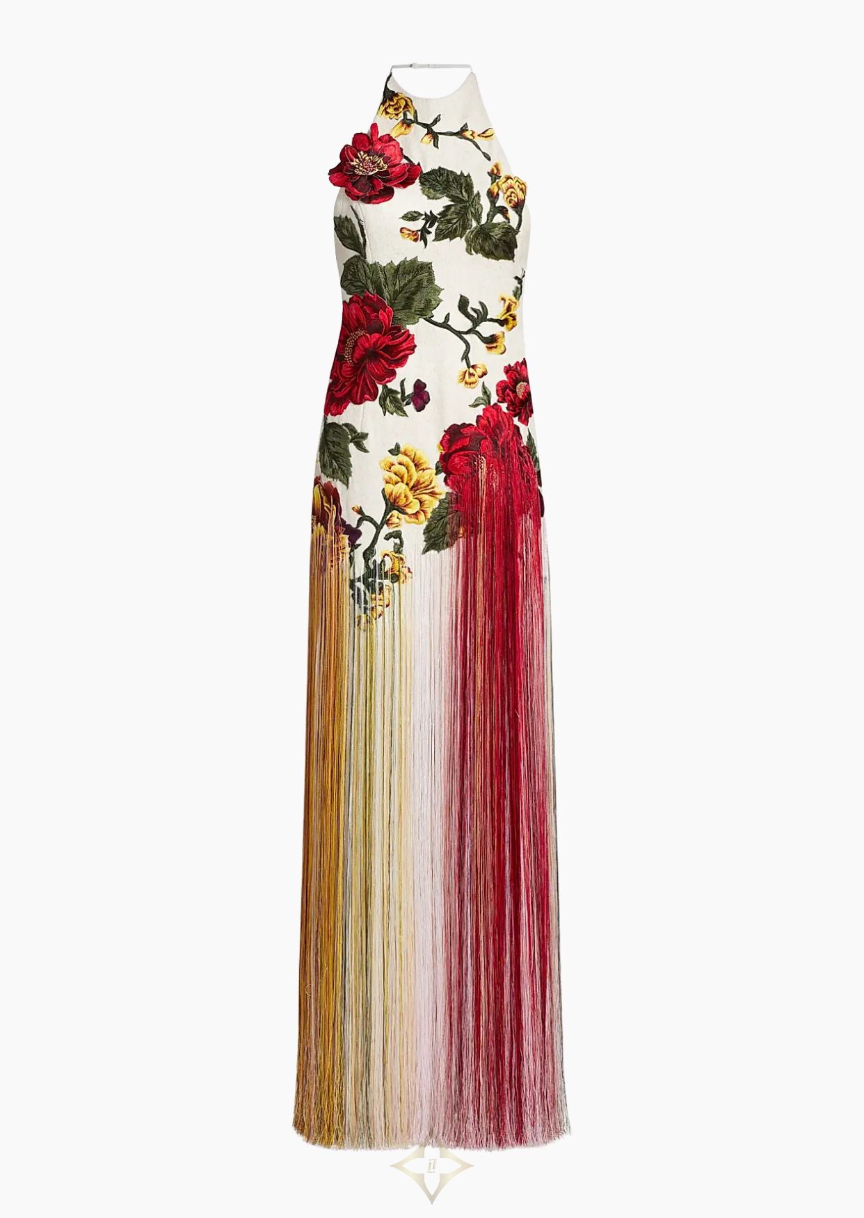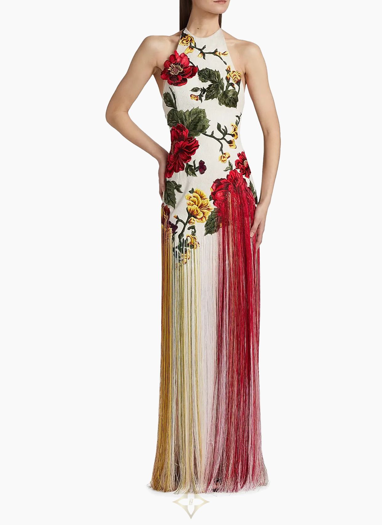 Vibrant florals come to life on this Oscar de la Renta silk gown. Cut in a halterneck silhouette, this gown showcases a fully fringe skirt that flows from the embroidered bodice.