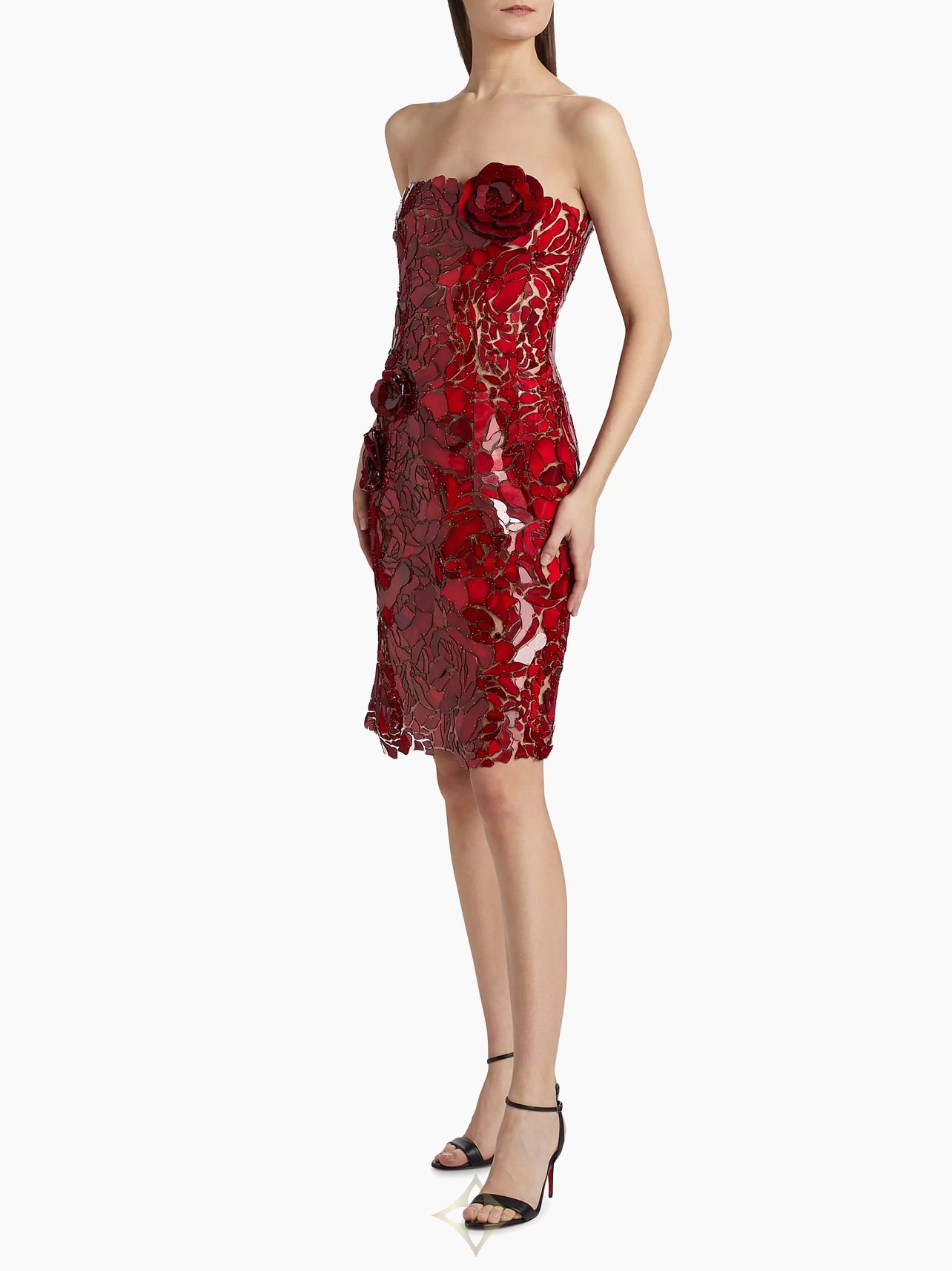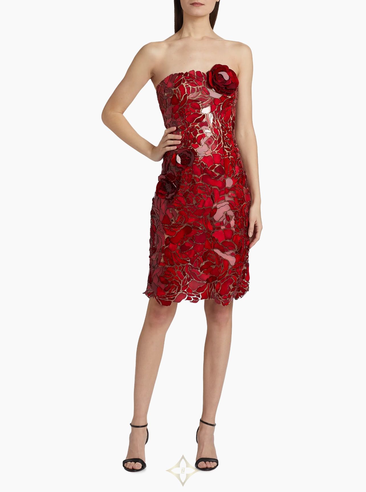 This Oscar de la Renta cocktail dress showcases tulle appliquéd with a floral mosaic. Cut for a fitted shape, 3D rosettes spring to life on this intricate design.