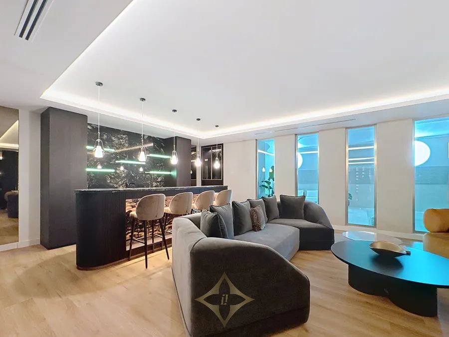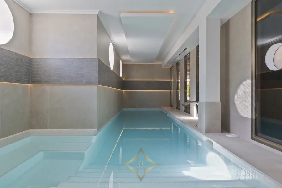 On the lower level we have the entertainment space and service area of the property. Villa includes a huge garage for 4 cars, cinema room, gym, spa area with Hamman and Sauna and indoor heated swimming pool. Also in this part of the villa, you may find a laundry area, maid’s apartment, and a guest room with English patio. The property has an elevator that connects all levels, underfloor heating throughout, domotics among the other features.
