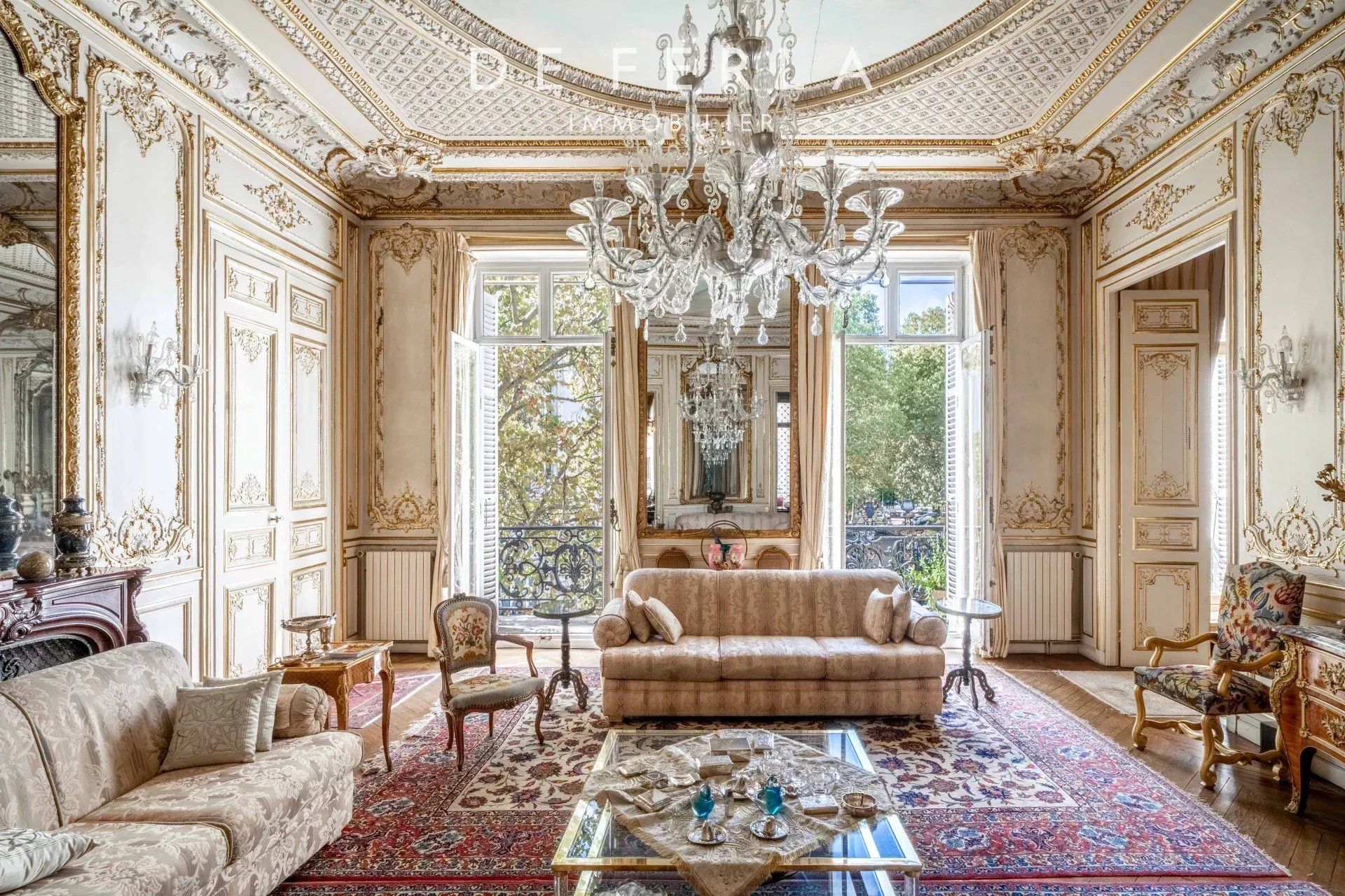 Exceptional family and reception apartment, located on the noble floor of a prestigious Second Empire building. With an area of 367.97 m} Loi Carrez (405 mª on the ground), this unique property occupies the floor alone, offering rare services on the Parisian market. Majestic volumes and historic charm with an impressive ceiling height of 4.22 m, this apartment seduces with its generous volumes and timeless elegance. Period parquet floors, refined moldings, carved fireplaces, gold leaf gilding and painted ceilings testify to its historical cachet. Facing southwest, it benefits from exceptional brightness, sublimating the reception rooms in a row: a grandiose living room, a dining room and an office, all adorned with woodwork of great finesse. The apartment is organized around an entrance gallery and includes a living room, a dining room and an office in a row, an independent kitchen (entirely to be renovated) with a mezzanine dedicated to official housing or service, five bedrooms, each with its own bathroom, offering comfort and privacy. The wooded views of Parc Monceau add a touch of serenity to this exceptional place. A spacious cellar completes this property. A rental parking space in the courtyard of the building.