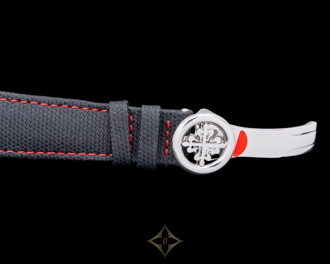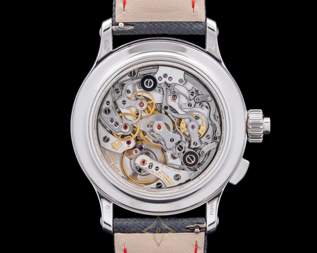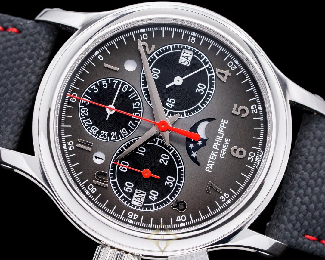 Patek Philippe Split-Seconds left hand chronograph Perpetual Calendar, 5373P-001, 5373P, first left hand chronograph offered by Patek Philippe, platinum case on a strap with a matching platinum deployant clasp, in-house manual-wind Patek Philippe caliber CHR 27-525 PS Q movement, 48-hour power reserve, 60-minute chronograph with split-seconds feature, perpetual calendar, charcoal gray dial with black-gradient rim, applied Arabic numeral hour markers, the pusher in the crown functions as a monopusher and controls the start/stop/reset, the pusher at 8 o'clock splits the twin seconds hands, sapphire crystal, display back, water resistant to 30 meters. Diameter: 38mm, Thickness: 13mm. Unworn with Patek Philippe box, setting pin, additional platinum solid caseback and papers dated 2023.
