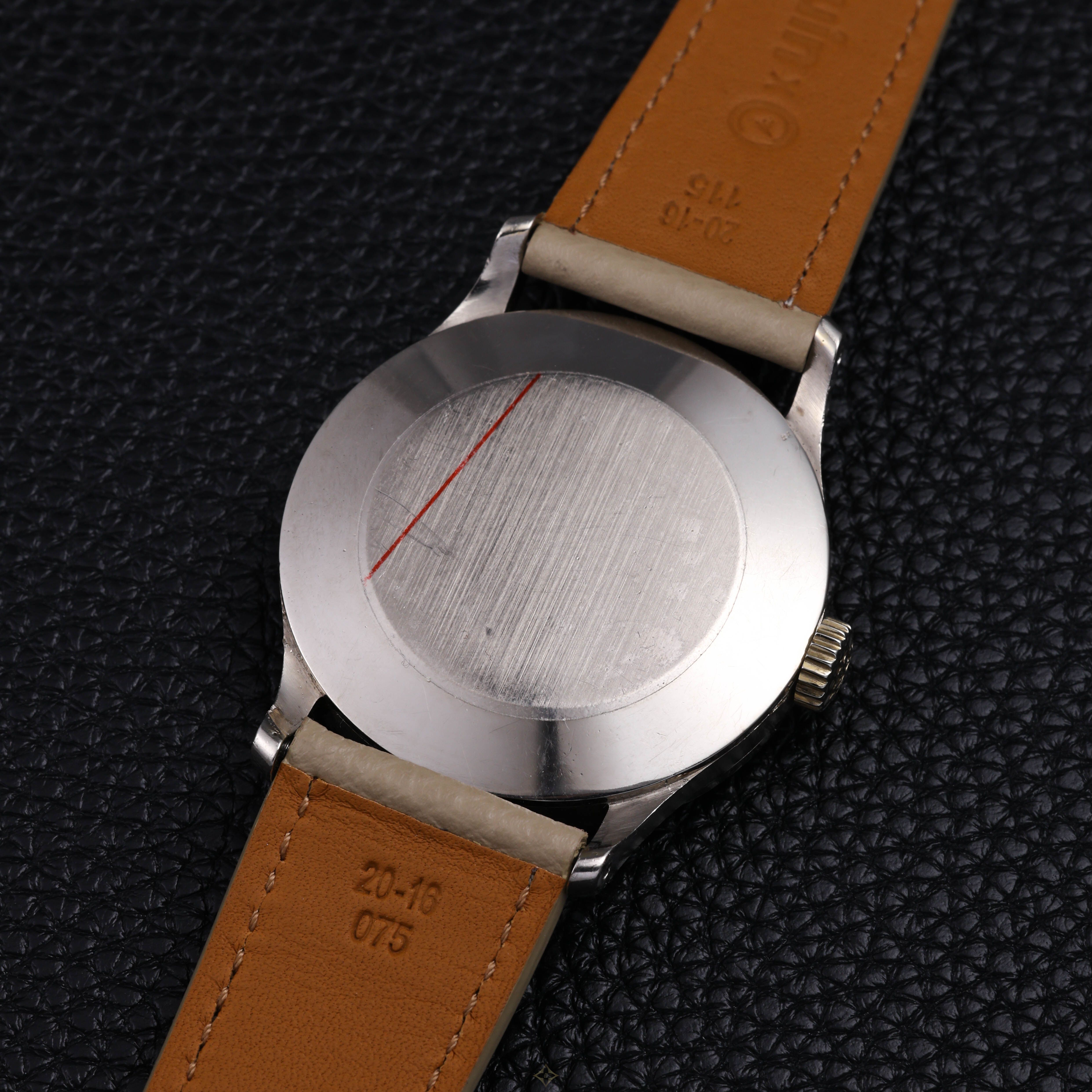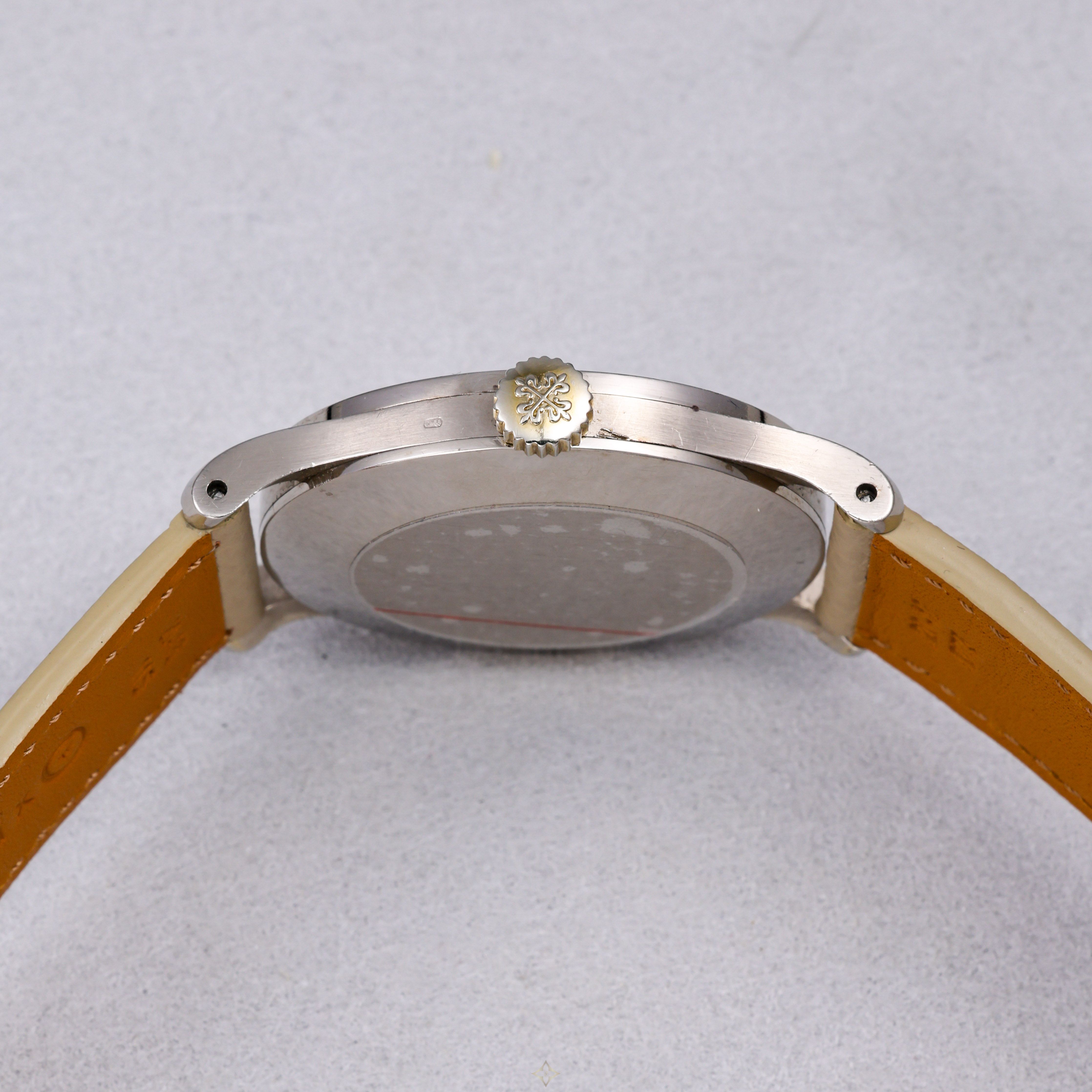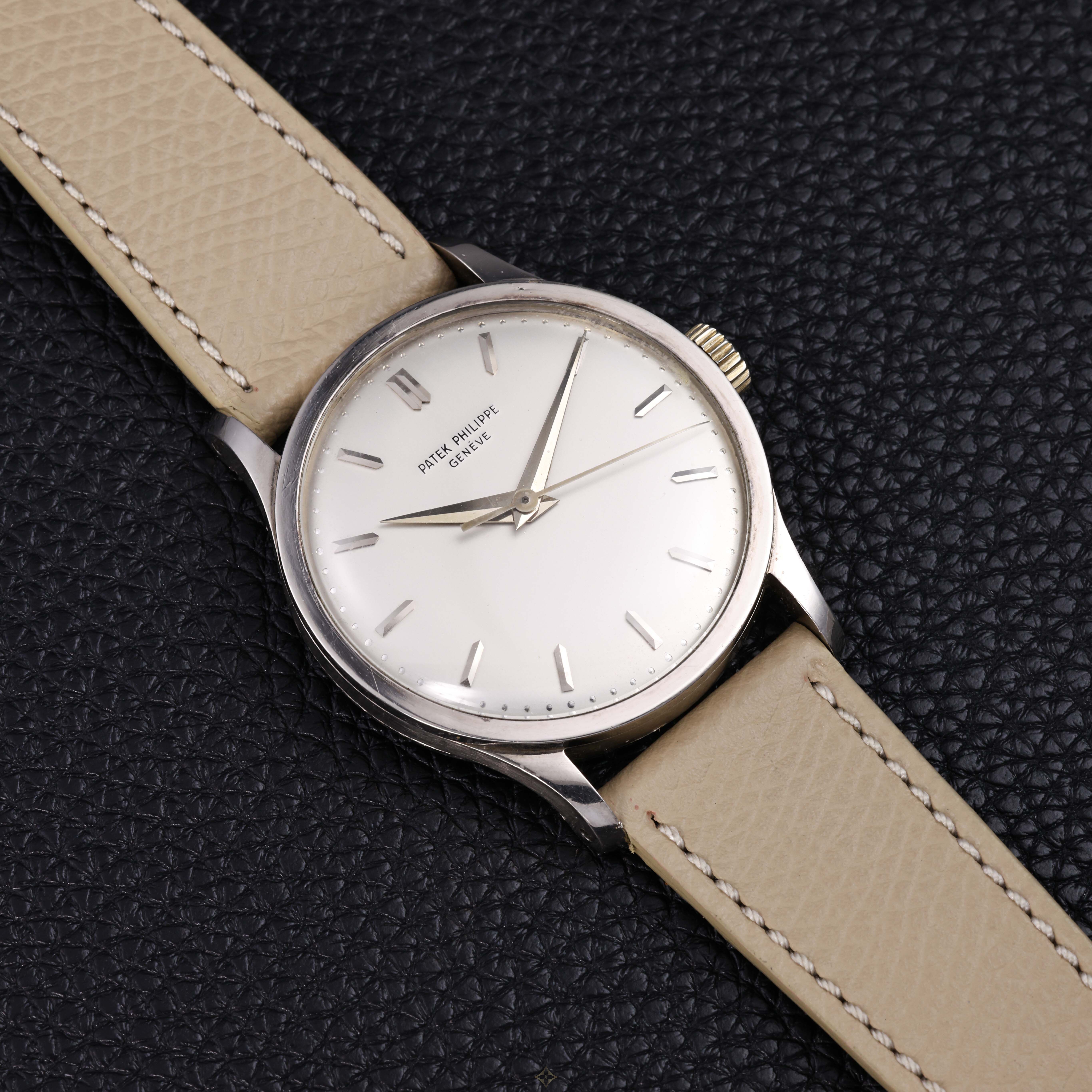 Case: three-piece, polished and satin-finished, ‘Calatrava’-type, right-angle bezel, ‘tortoise’-shaped concave lugs, snap-on case-back; polished ‘Calatrava’ crown.