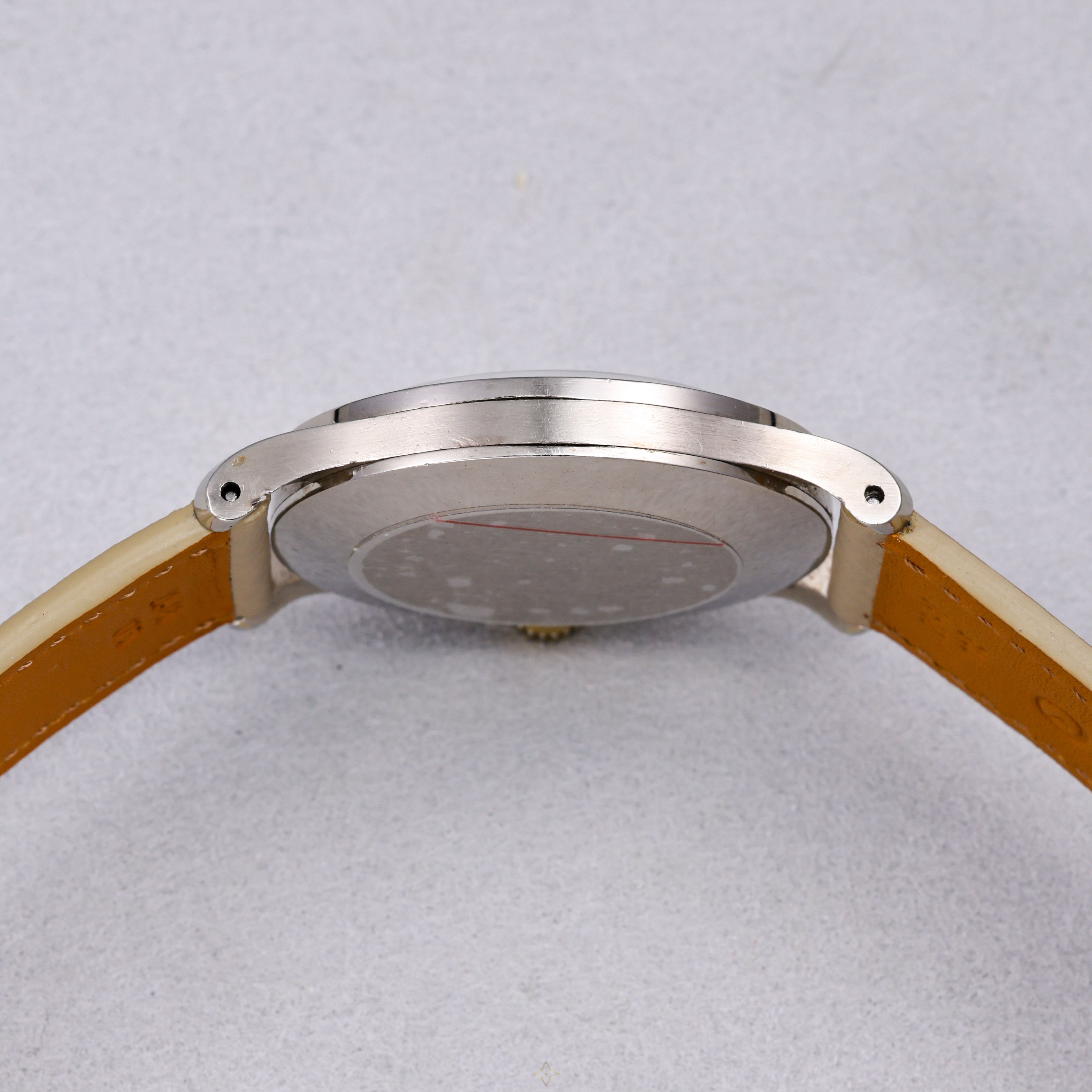 Dial: silver colour, with white gold applied radiating indexes, external minute track divided five by five with ‘perlé’ beaded dots; white gold ‘Bâton’ hands.