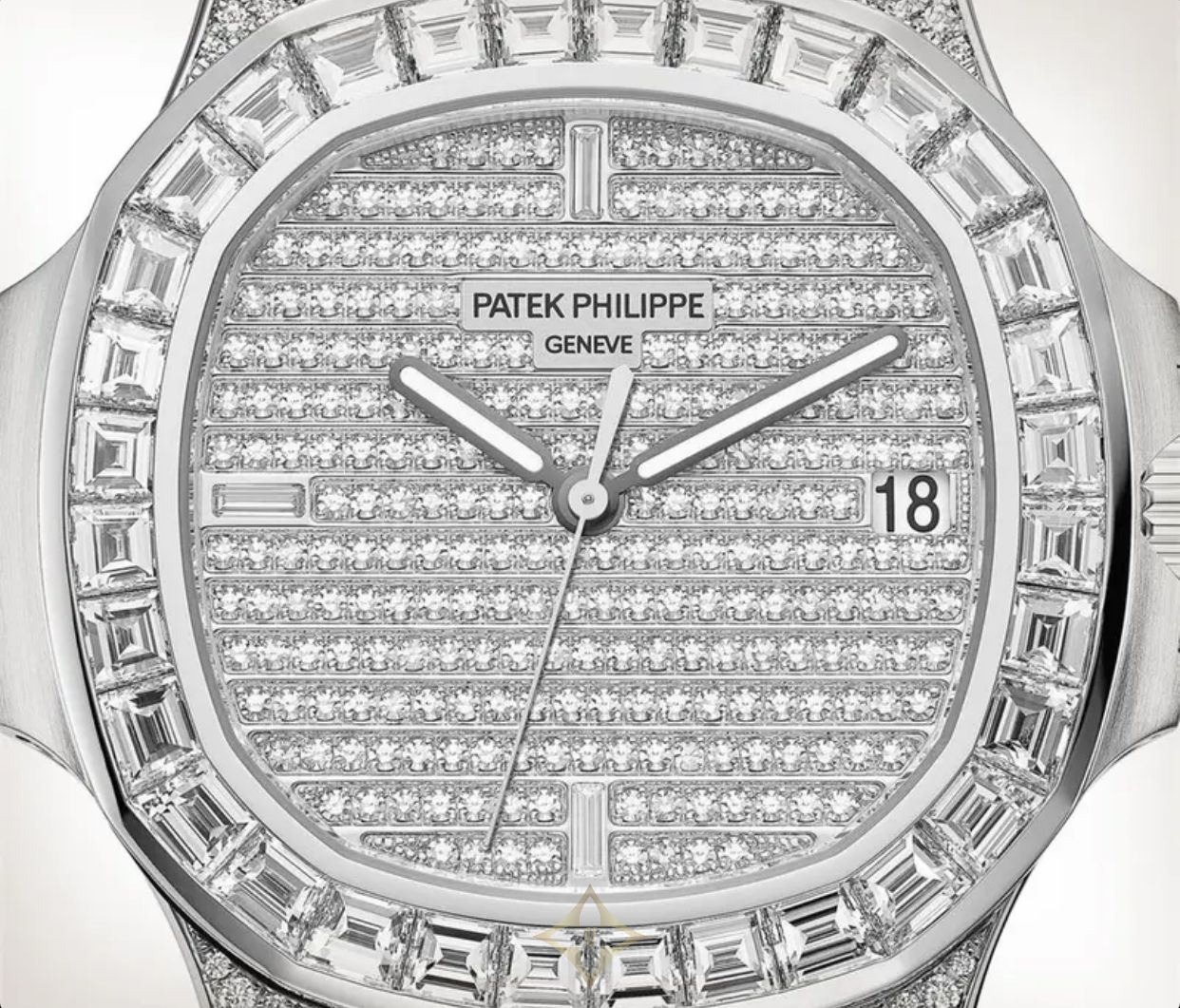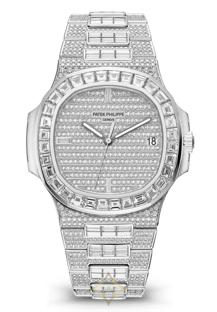 Case: 100 diamonds: ~0.69 ct. and 32 baguette diamonds: ~5.51 ct. Dial: fully set with 255 diamonds (~1.36 ct) and 3 baguette diamond hour markers (~0.01 ct). Bracelet: 803 diamonds: ~3.55 ct. and 150 baguette diamonds: ~7.52 ct. Total 1,343 diamonds: ~18.73 ct.