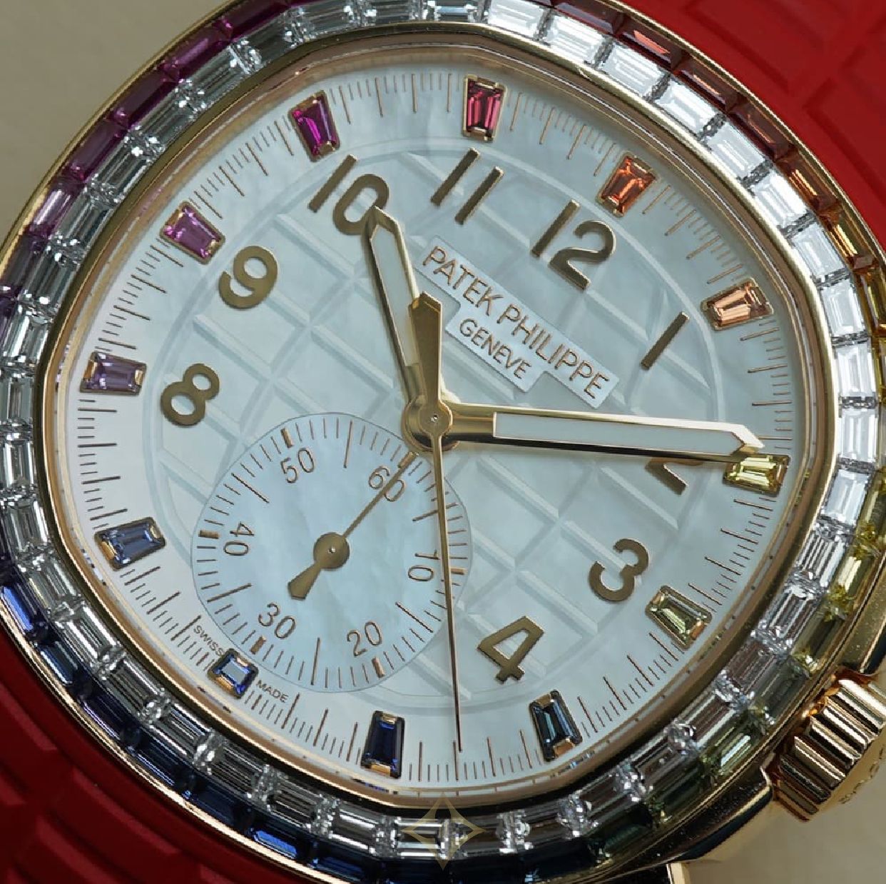 The dial is a visual tour de force: set against a radiant white mother-of-pearl canvas, deeply engraved with the Aquanaut’s signature pattern. This ethereal backdrop is accentuated by baguette multicolored sapphire hour markers and gold applied numerals, creating a luminous display that echoes the varied hues of a rainbow, demonstrating the maison’s unmatched gem-setting craft.
