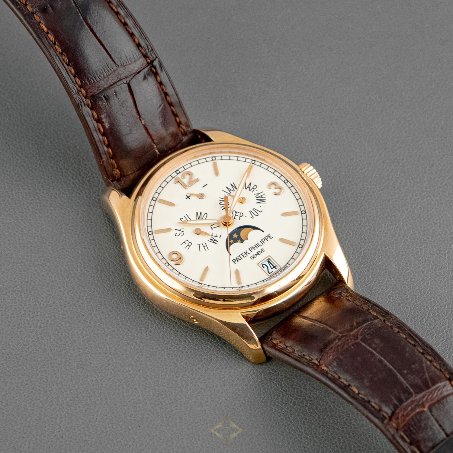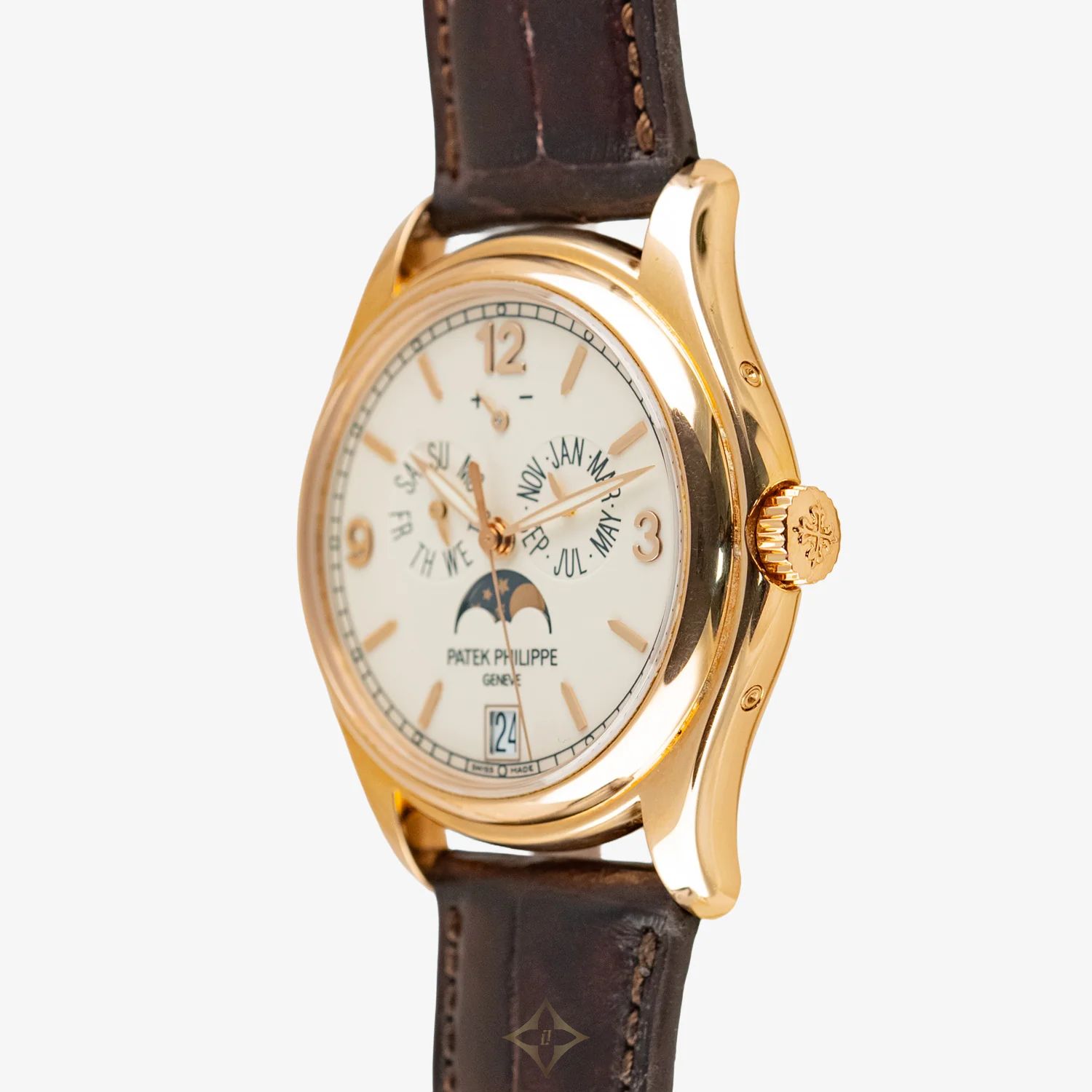 Inside beats the caliber 324 S IRM QA LU, an automatic manufacturing movement with 45 hours of running reserve and the prestigious Patek Philippe Seal, guarantee of precision and finish. The brown alligator strap with squirrel buckle completes the set with a classic air. This model, launched in 2005 and still in force, has consolidated the annual calendar as an essential complication in Patek's repertoire, both useful and poetic.