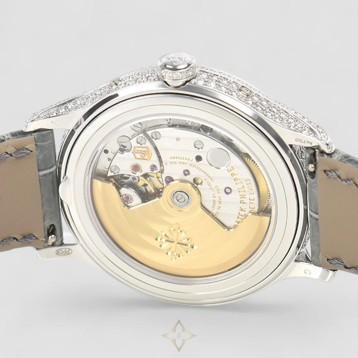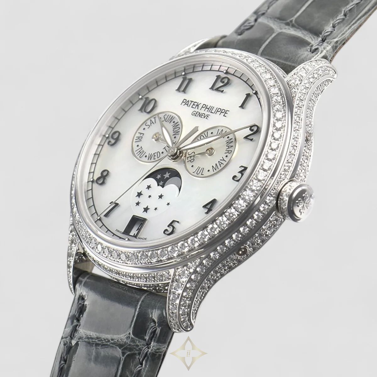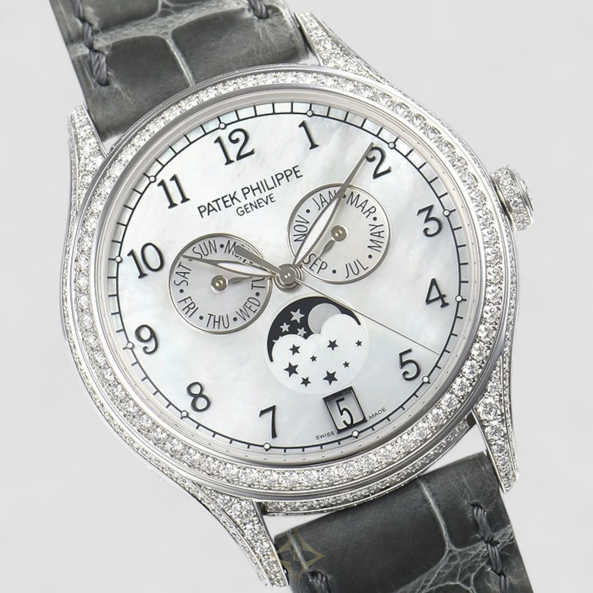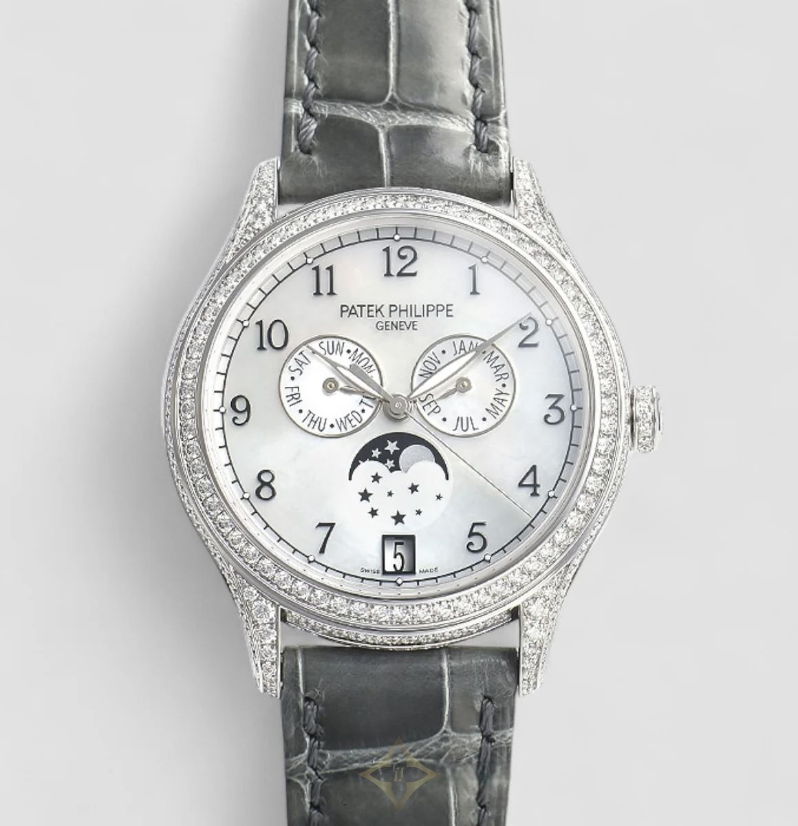 Patek Philippe Annual Calendar Complications (Reference 4948G-010) is an exquisite and highly sophisticated women's timepiece, combining Patek Philippe's renowned complications with luxurious diamond setting. The elegant 38mm round case is crafted from prestigious 18K white gold, offering a substantial yet refined presence. The bezel and often the lugs are beautifully set with brilliant-cut diamonds, adding a dazzling sparkle. The captivating mother-of-pearl dial features Arabic numerals and elegantly displays the annual calendar complications (day, date, month, and moon phase), a hallmark of Patek Philippe's ingenuity as it requires adjustment only once a year. Powered by a high-performance automatic movement (Caliber 324 S QA LU) with a 45-hour power reserve and 34 jewels, this watch showcases Patek Philippe's mastery of haute horology. It is fitted with a luxurious grey crocodile skin strap and an 18K white gold buckle.