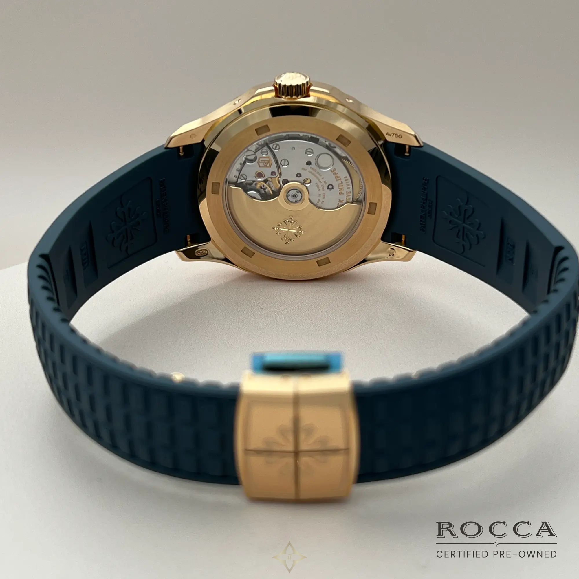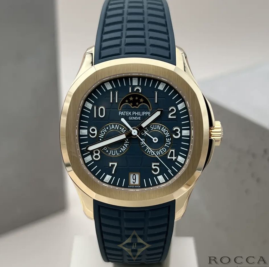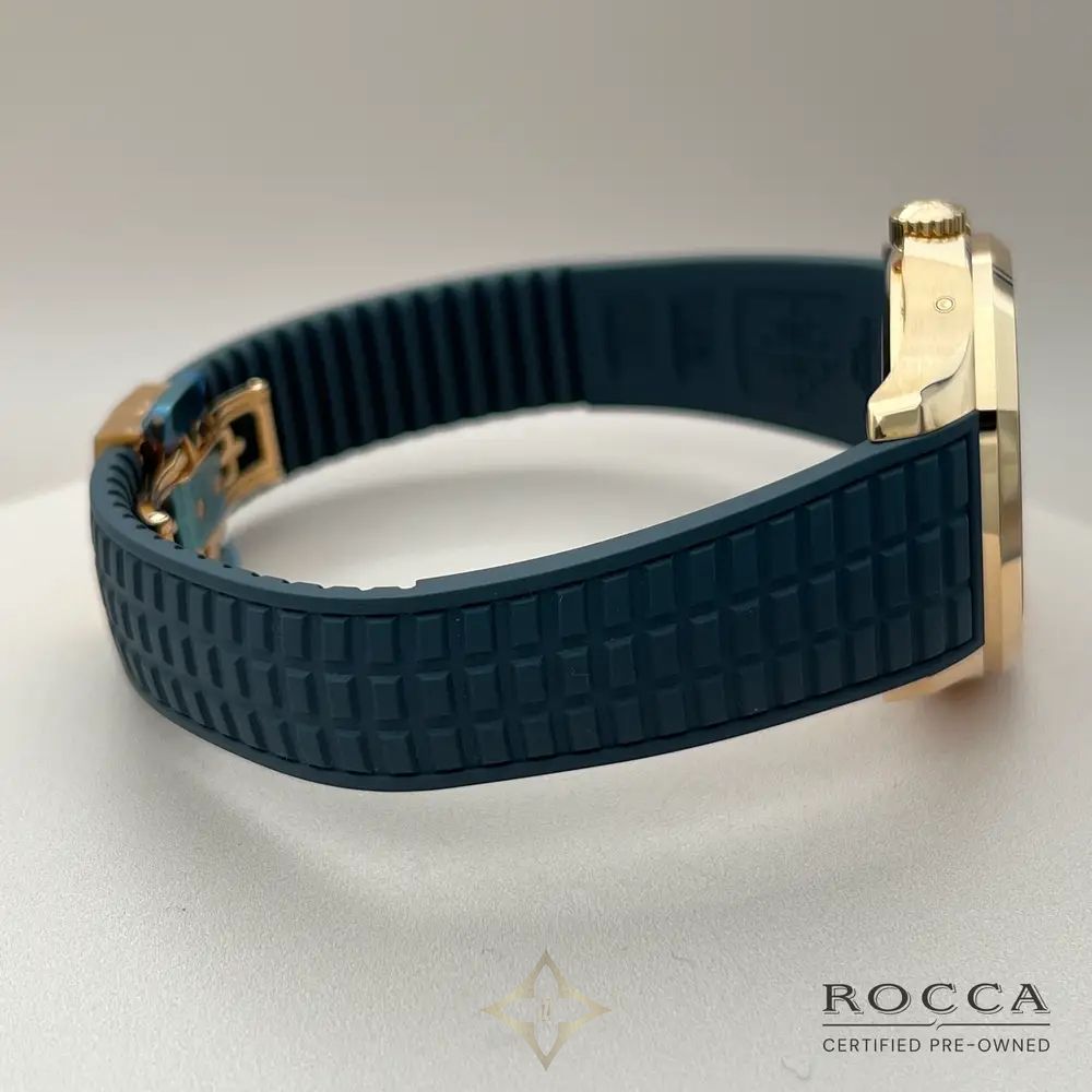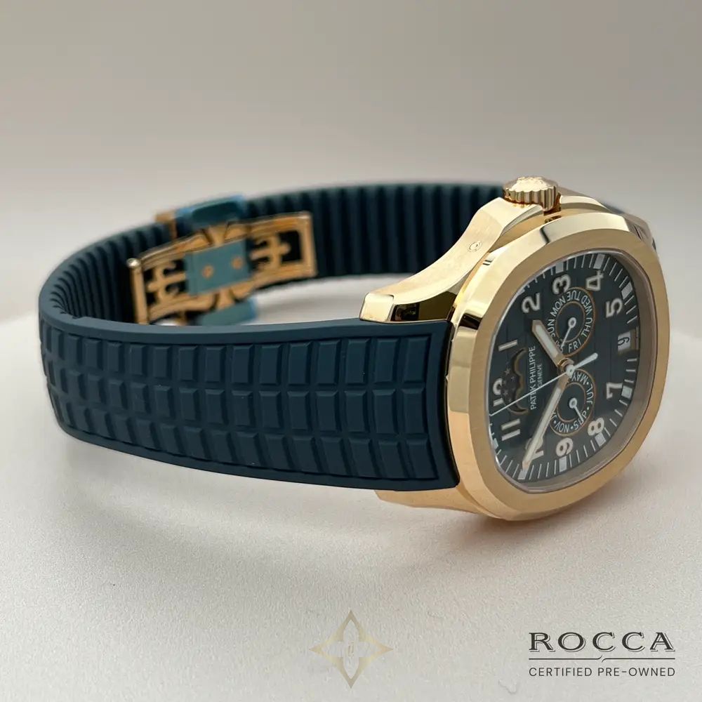 Patek Philippe Aquanaut 5261R | 40 mm | 2023 PRICE: €149,000 New Reference: 5261R-001 Aquanaut 5261R | 40 mm | 2023 | Original box | Original papers Product Description The Patek Philippe Aquanaut 5261R is a high-class timepiece with a 39.9 mm rose gold case, launched in 2023. This model features a matte grey-blue dial with the Aquanaut pattern, giving it an elegant and dynamic appearance. It is powered by the automatic movement 26-330 S QA LU, with a power reserve ranging from 35 to 45 hours, offering the functions of an annual calendar, day and month display with hands, date in a window and moon phases. The blue rubber strap is another distinctive element, perfectly complementing the sporty and sophisticated design of the watch. The Patek Philippe Aquanaut 5261R is ideal for those seeking a timepiece that combines elegance, functionality, and exquisite watchmaking craftsmanship. Product Details Case Water Resistance: 30 m Crystal: Sapphire Bezel Material: Pink gold Case Material: Pink gold Case Diameter: 40.00 mm Bracelet Clasp Material: Rose gold Clasp: Déployante Bracelet Color: Blue Bracelet Material: Rubber Movement Calibre: 26-330 S QA LU Power Reserve: 35 Hours Movement: Self-winding ——— ROCCA 1794 (Damiani S.p.A.) VAT No. : 01457570065 Registered office: Piazza Damiano Grassi Damiani No. 1 in Valenza (AL) Boutique Milano, Piazza Duomo, 25 Piazza Duomo, 25, 20121, Italy, Milano, Milano Phone: +39 02 805 7447 WhatsApp: +39 0131929873 Email: CONTACT@ROCCA1794.COM