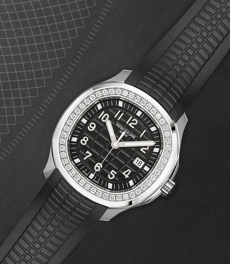 Patek Philippe reinterprets the quartz Aquanaut Luce in stainless steel with a larger diameter (38.8 mm) and a new integrated composite strap. This epitome of contemporary casual chic is attired in an elegant shade of black adorning the dial and matching strap. Water-resistant to 30m, the rounded octagonal case is enhanced by polished and satin finishes. The bezel is lit up by a row of 48 diamonds (~1.11 ct). The patented folding clasp is secured by four independent catches.