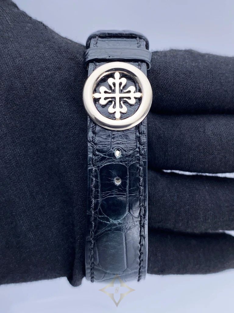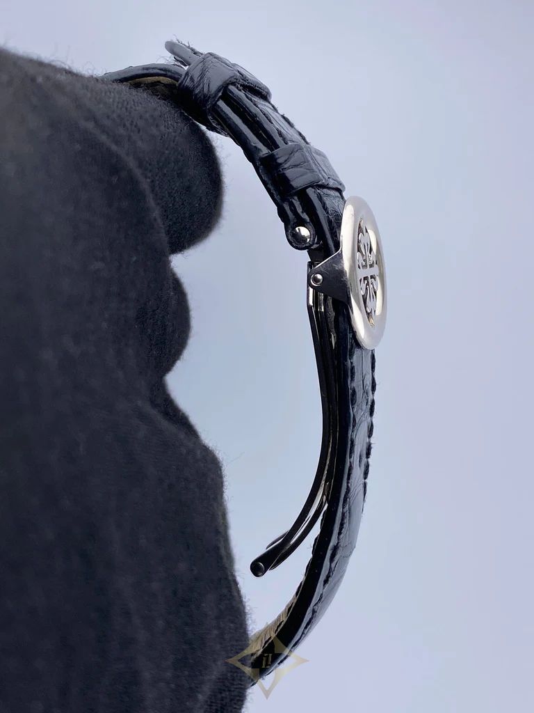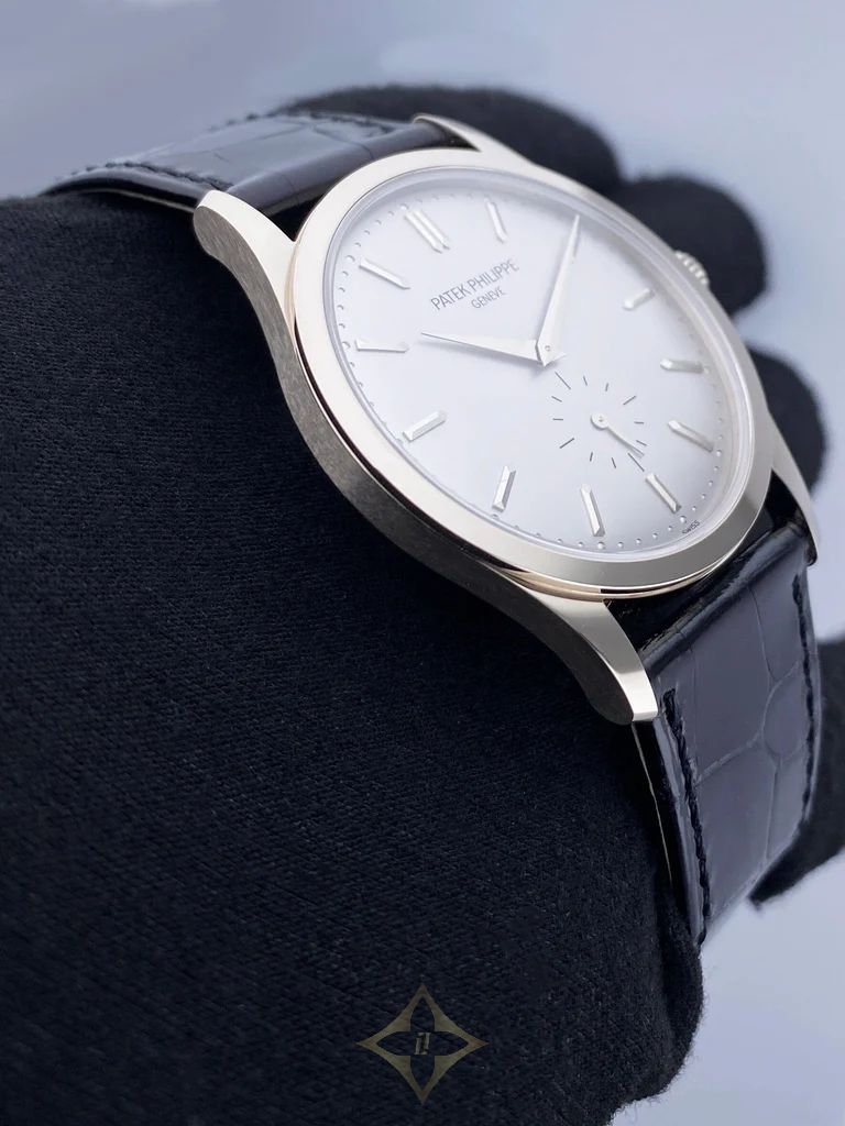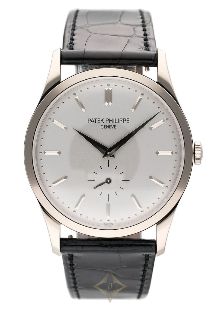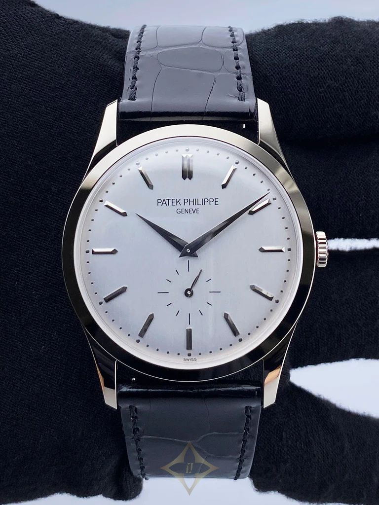Patek Philippe Calatrava 5196G-001 Mens Watch. 37mm 18K white gold case. 18K white gold smoothed bezel. Silver dial with silver-tone hands and index hour markers. Small second dial display at 6 o'clock position. Black leather Patek strap with 18K white gold deployment buckle. Will fit up to a 7-inch wrist. Sapphire crystal. 18K white gold case back. Mechanical hand-winding movement. This watch comes with original Box and Papers.