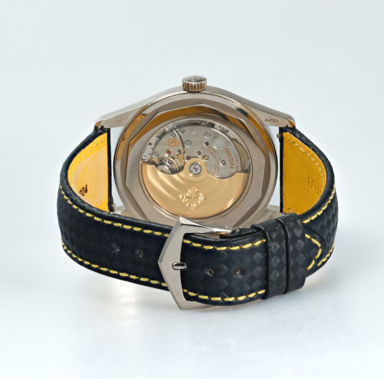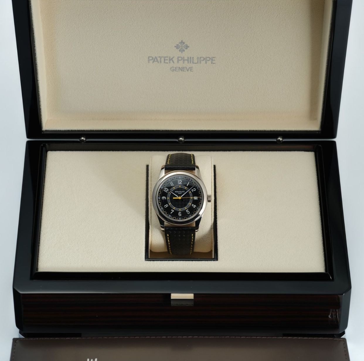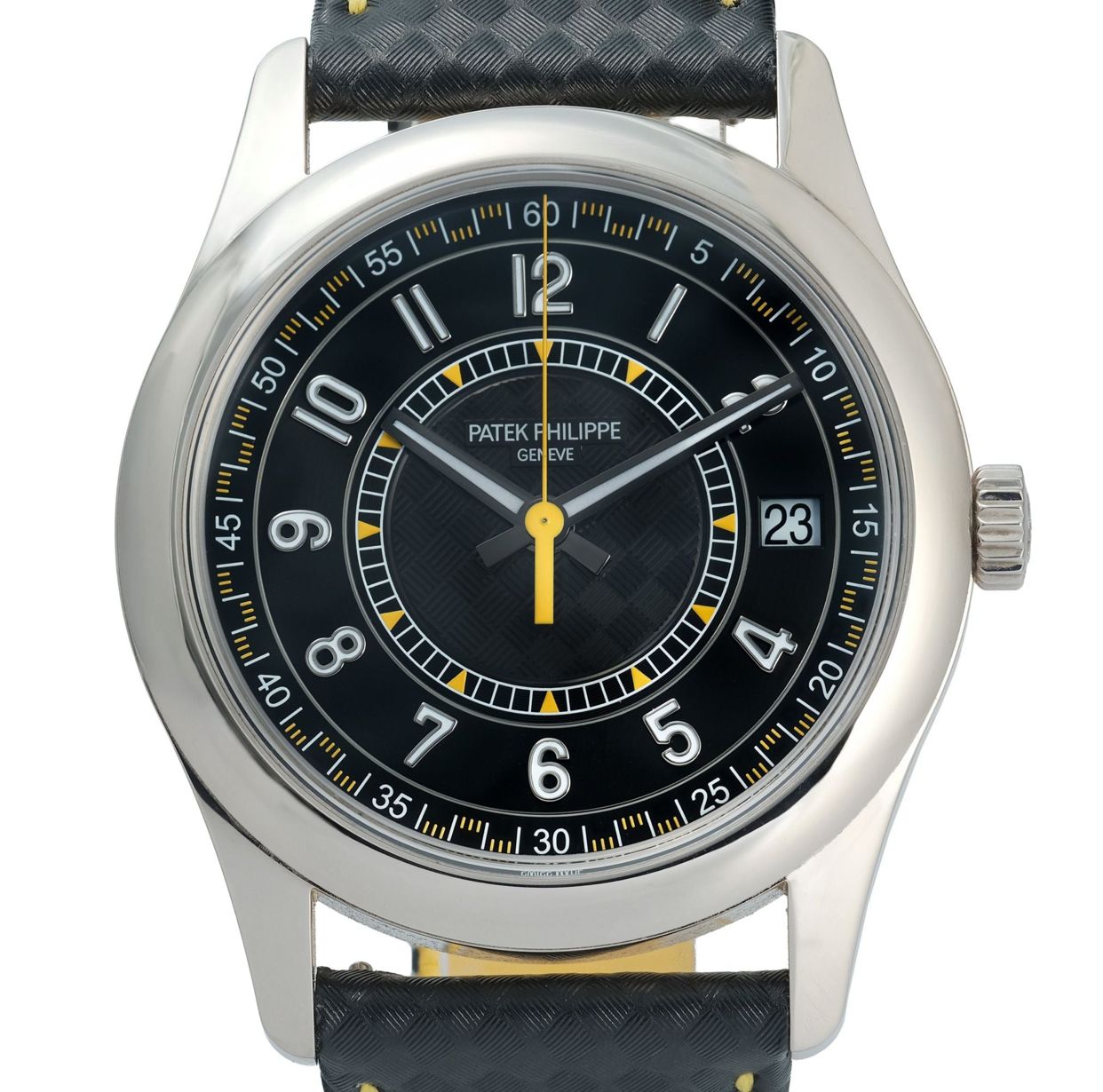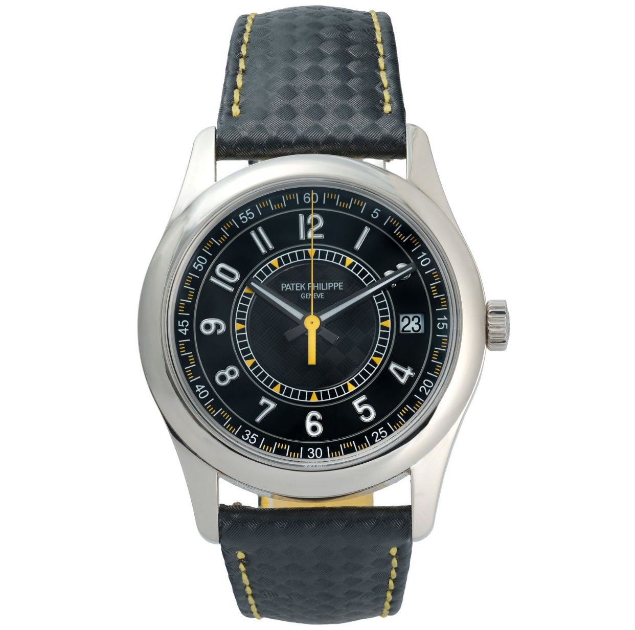 The Patek Philippe Calatrava Ref. 6007G-001 is a strikingly modern interpretation of the brand’s most classical line, released in white gold with a bold, contemporary twist. Measuring 40mm, it features a black dial adorned with a carbon-pattern motif, white Arabic numerals, and vibrant yellow accents that inject a sporty energy rarely seen in the Calatrava family. Powered by an automatic movement and paired with a patterned calfskin strap to match the dial’s motif, it perfectly balances tradition and innovation. This 2023 example is offered in very good condition with its original box and papers, making it a highly desirable piece for collectors.