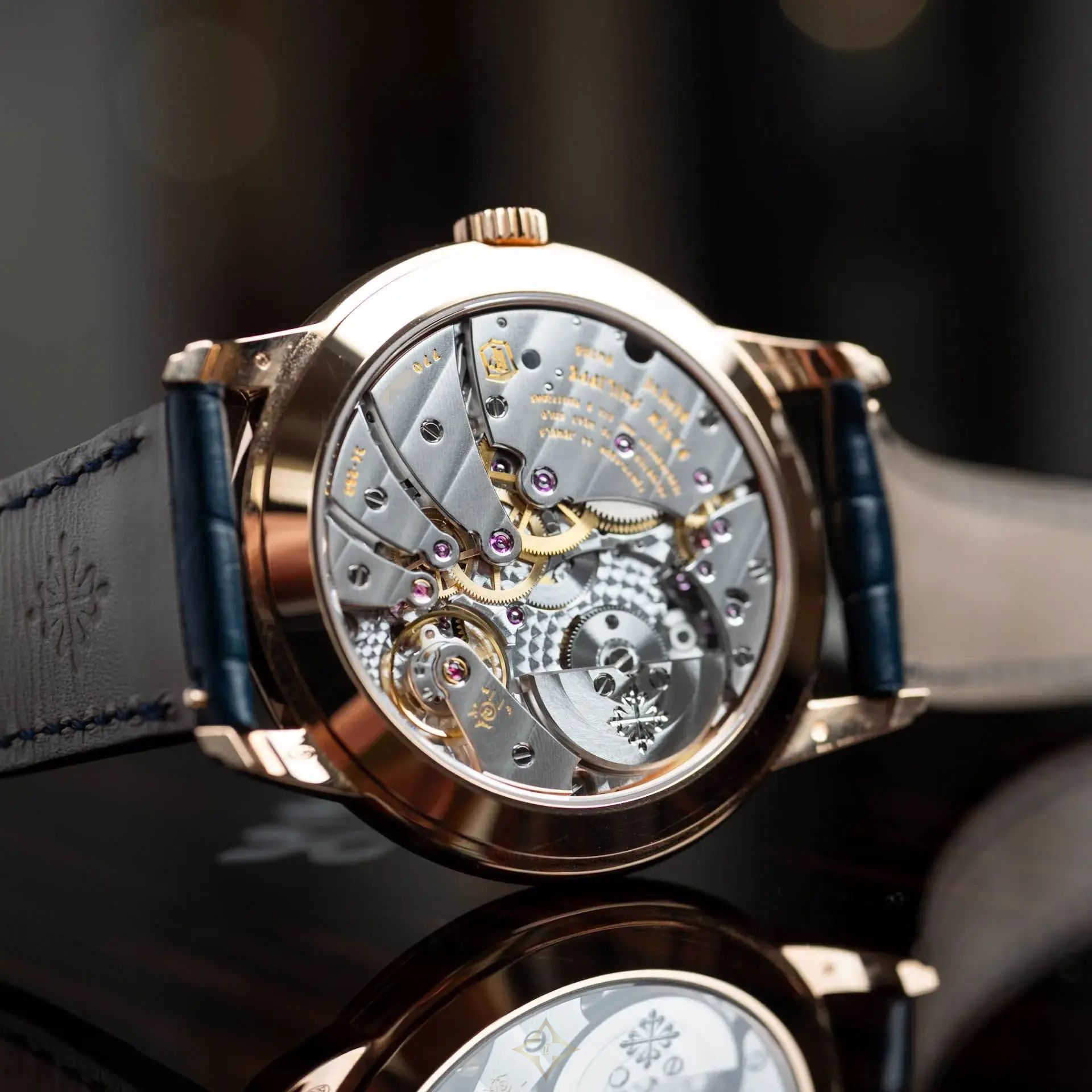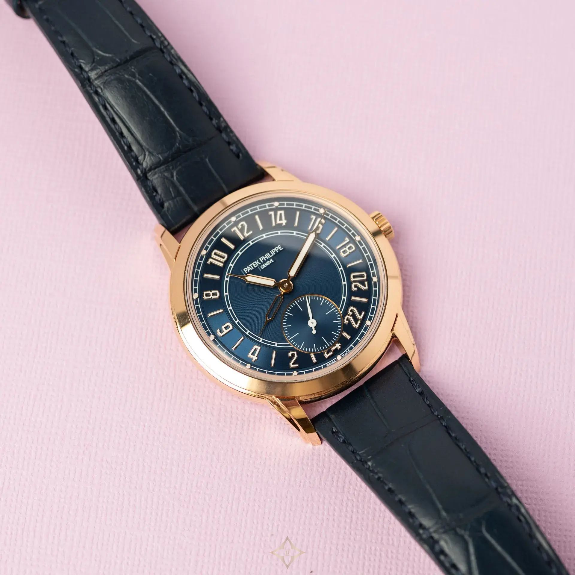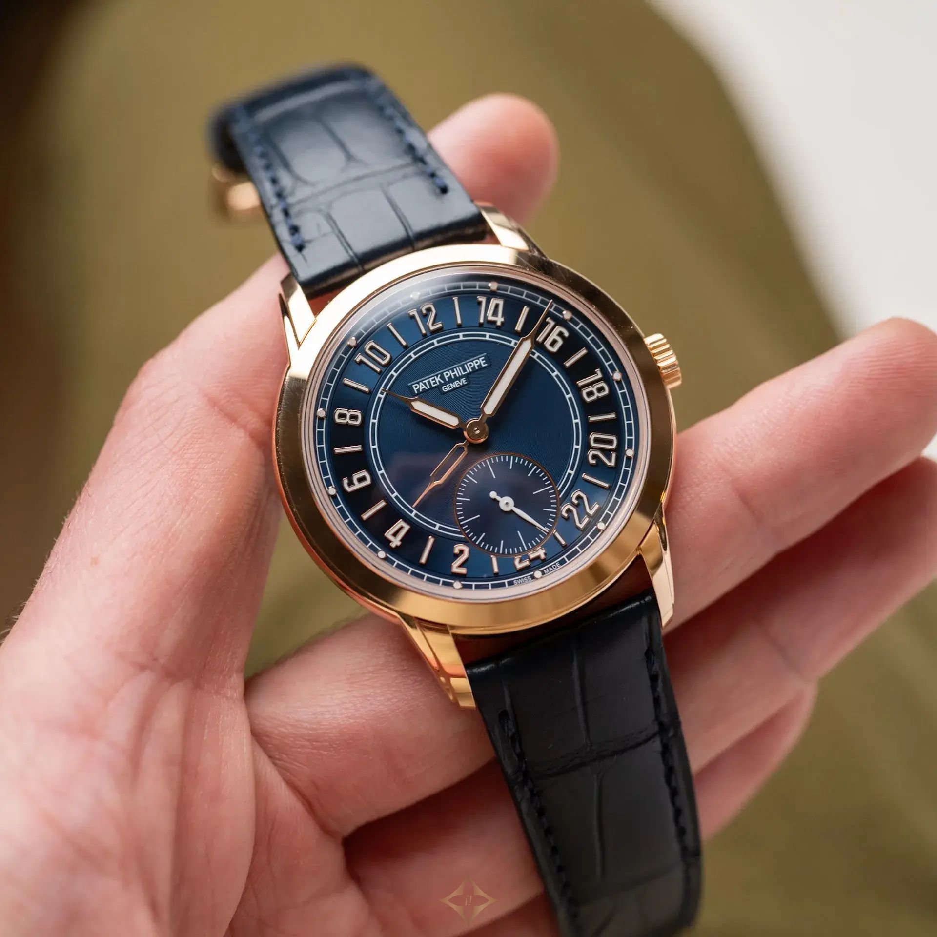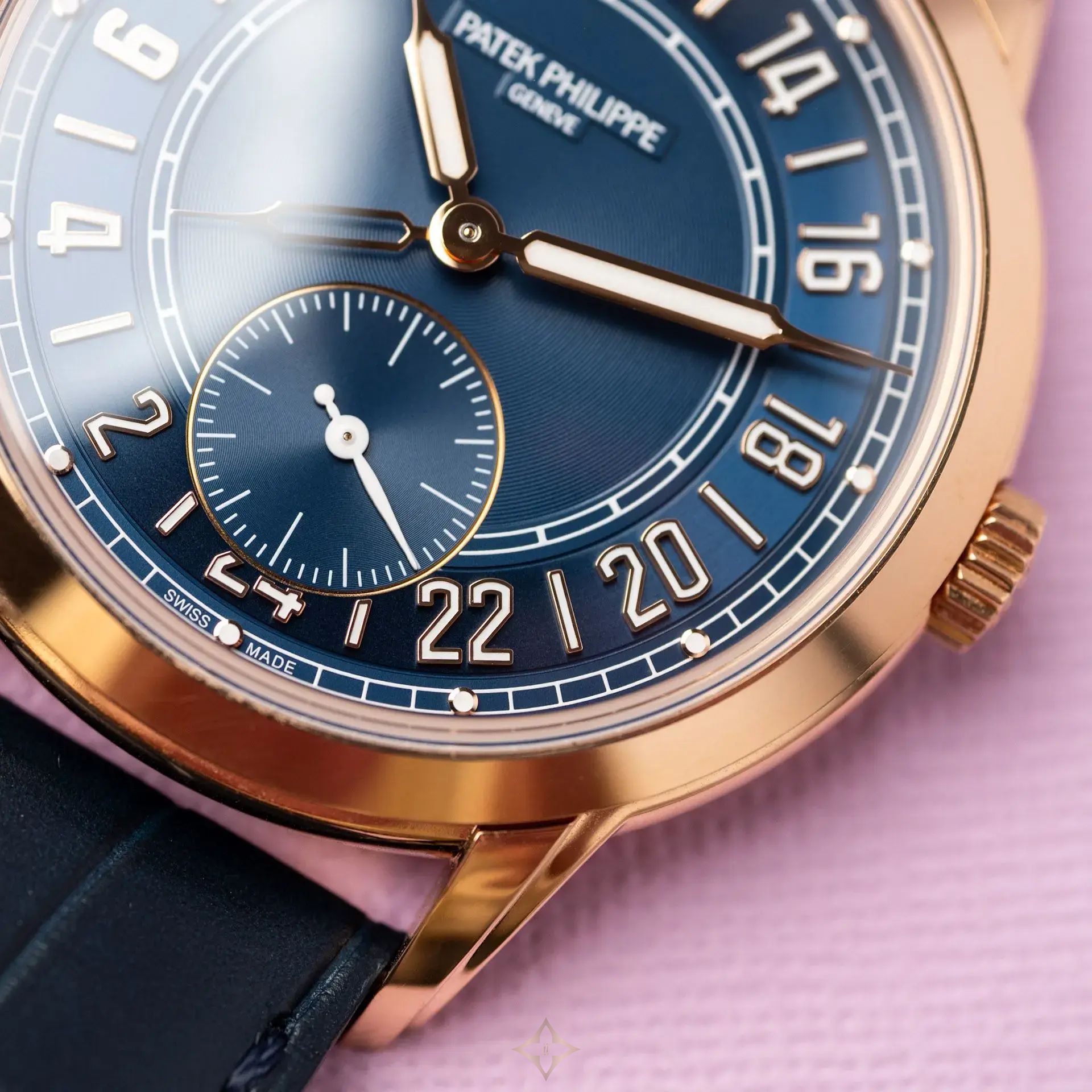 One of the latest additions to the Calatrava Travel watches collection, the dual-zone Travel Time features a 24-hour display. Its slim rose gold case with curved two-tier lugs offers a streamlined look, thanks to a local time correction system that uses the crown instead of the traditional push-buttons. The navy-blue dial with baton hour-markers and applied Arabic numerals in pink gold features a small seconds aperture at 6 o'clock and a blue guilloché center for optimal legibility. Finally, the self-winding caliber with off-center platinum micro-rotor can be admired through the transparent sapphire caseback.