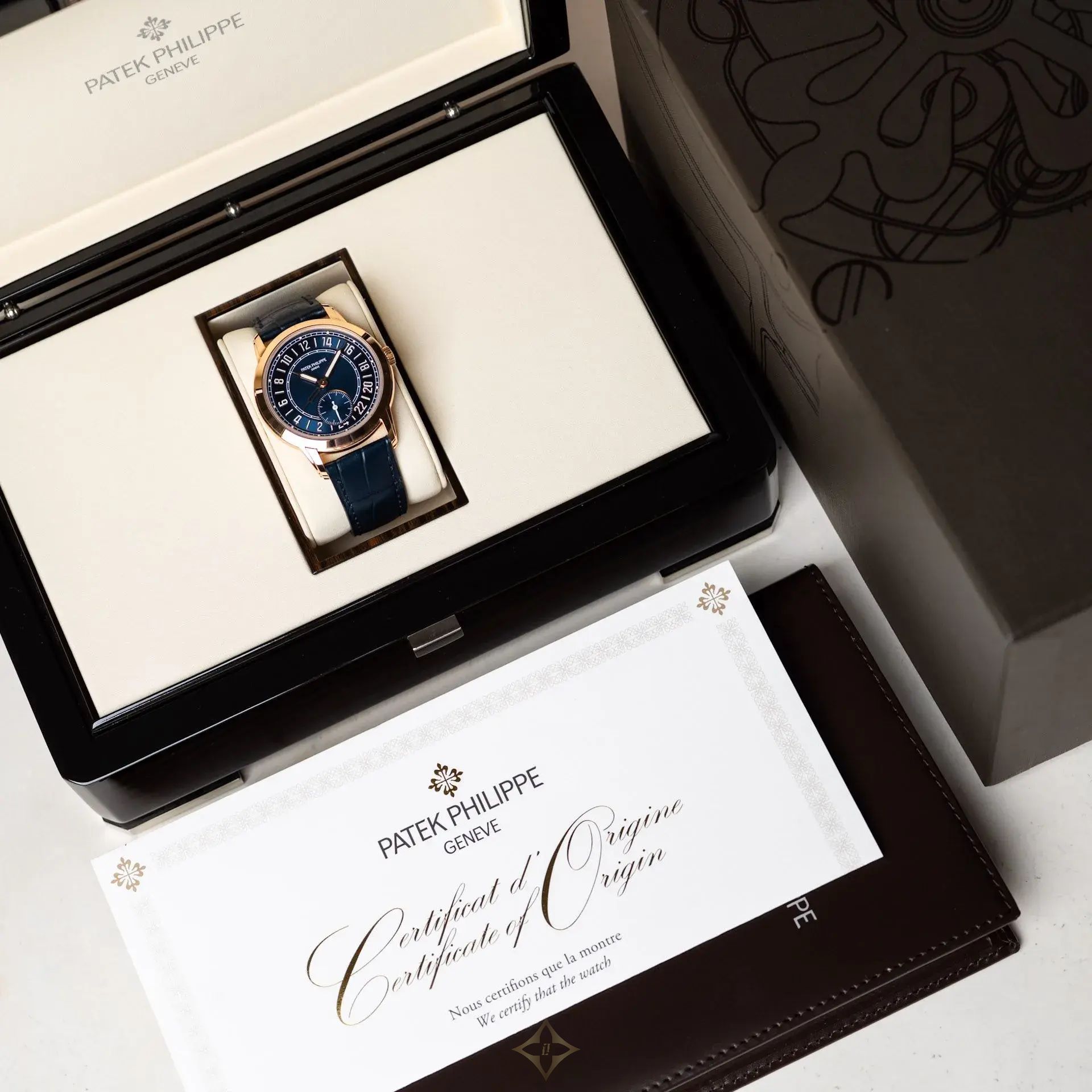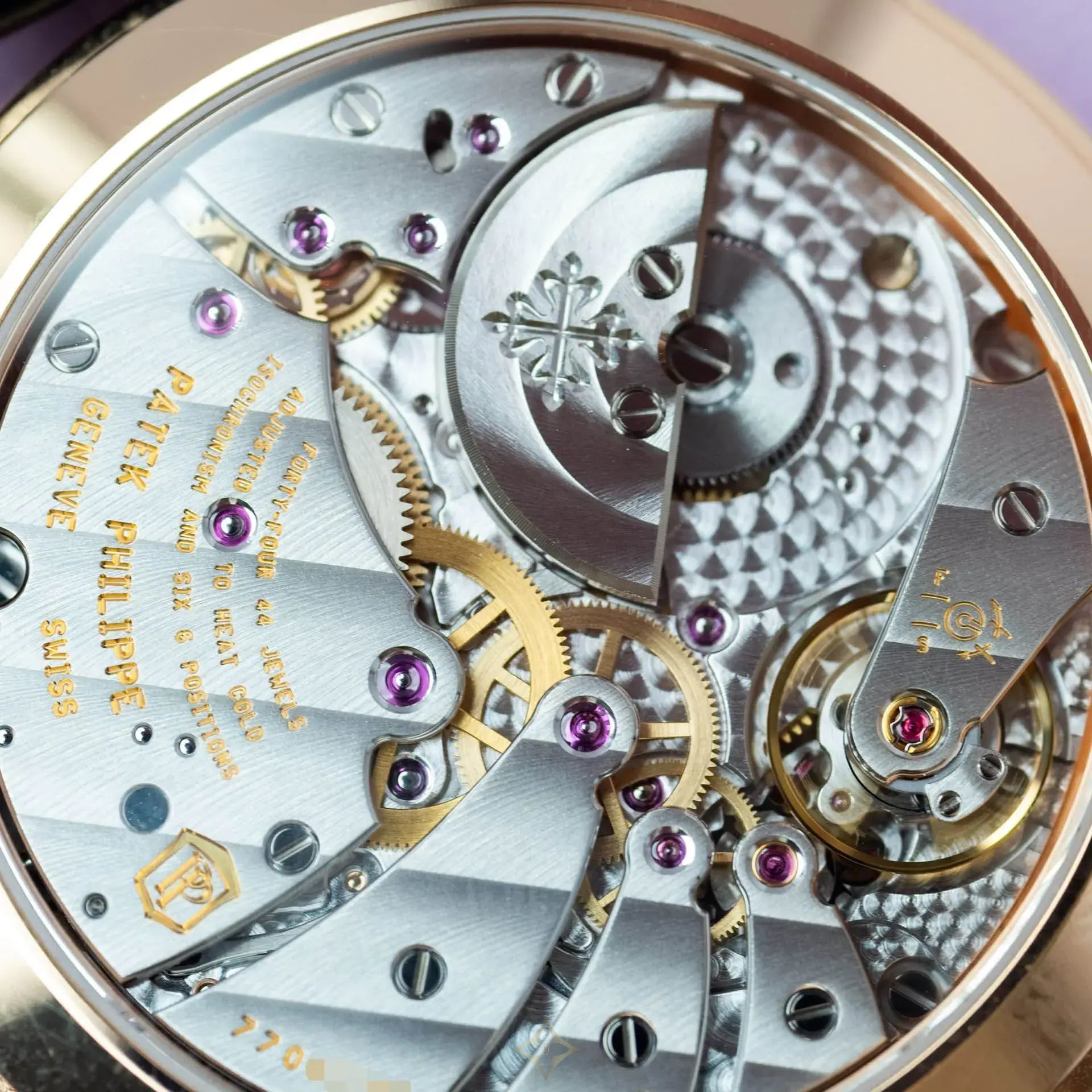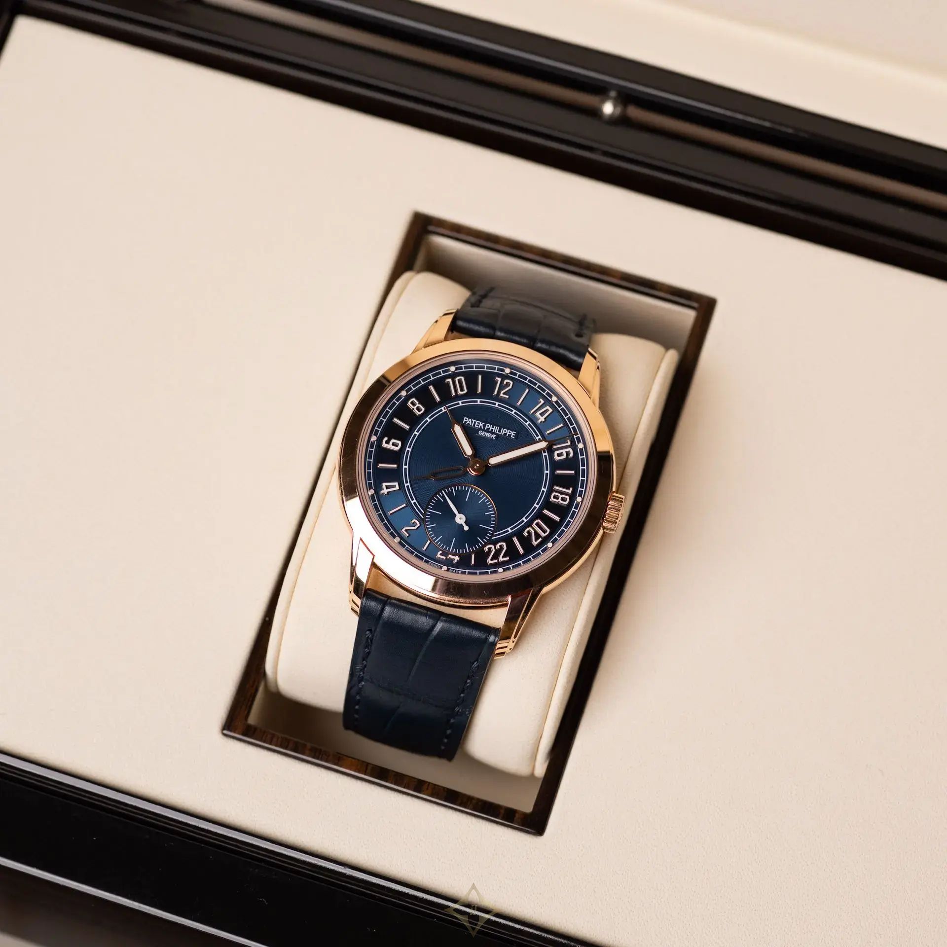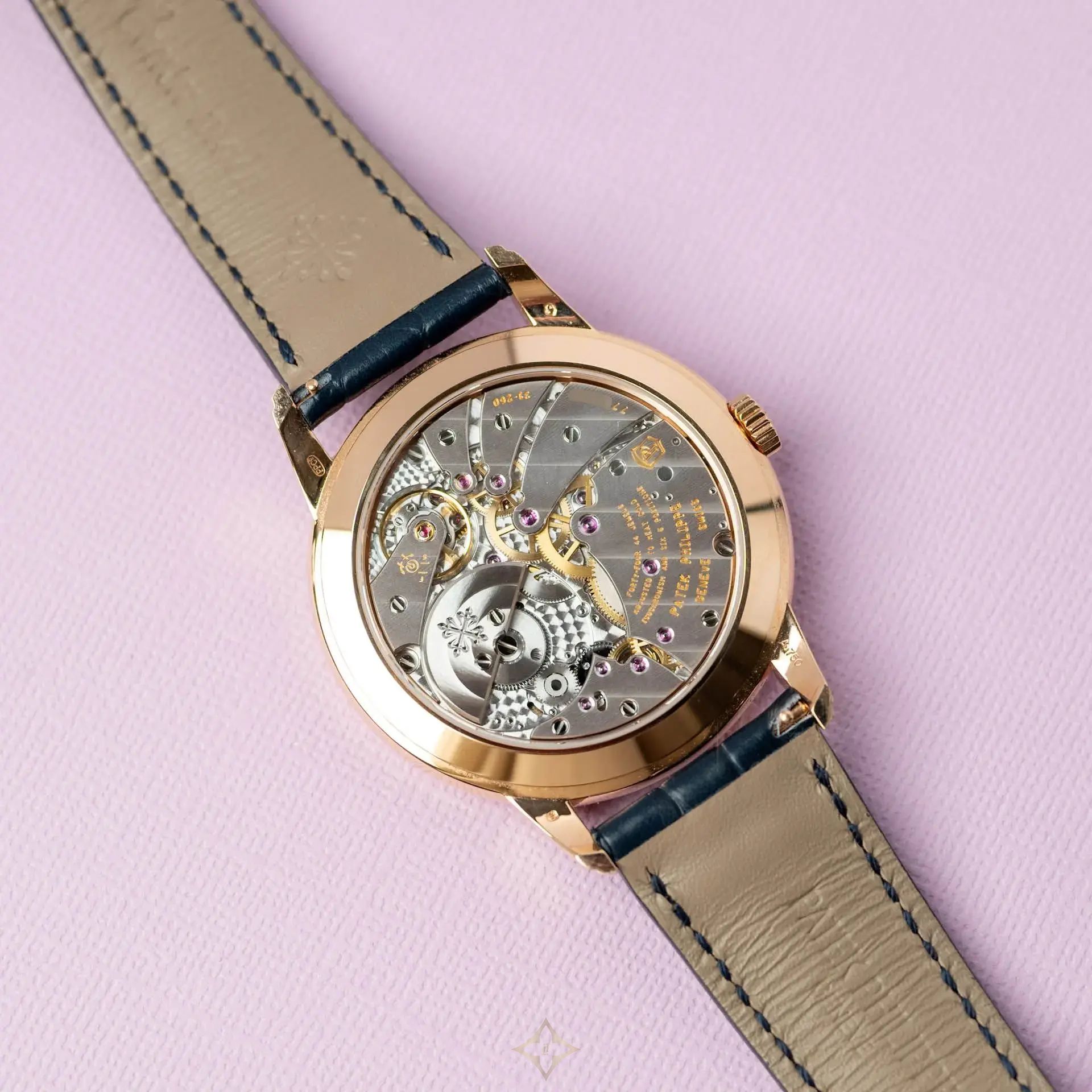 One of the latest additions to the Calatrava Travel watches collection, the dual-zone Travel Time features a 24-hour display. Its slim rose gold case with curved two-tier lugs offers a streamlined look, thanks to a local time correction system that uses the crown instead of the traditional push-buttons. The navy-blue dial with baton hour-markers and applied Arabic numerals in pink gold features a small seconds aperture at 6 o'clock and a blue guilloché center for optimal legibility. Finally, the self-winding caliber with off-center platinum micro-rotor can be admired through the transparent sapphire caseback.