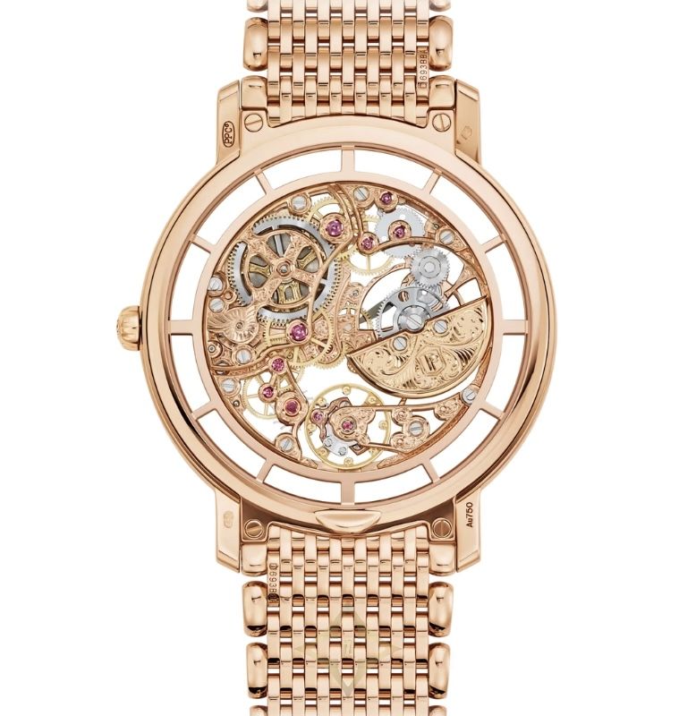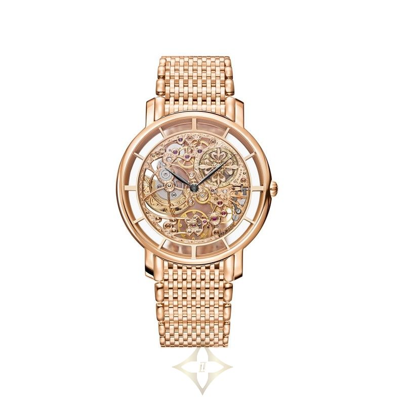 Patek Philippe Complications watch with a rose gold case and sapphire crystal case back. Ultra-thin self-winding skeleton mechanical movement, fully openworked, decorated and hand-engraved. Caliber 240 SQU. Rose gold bracelet. Fold-over clasp.
