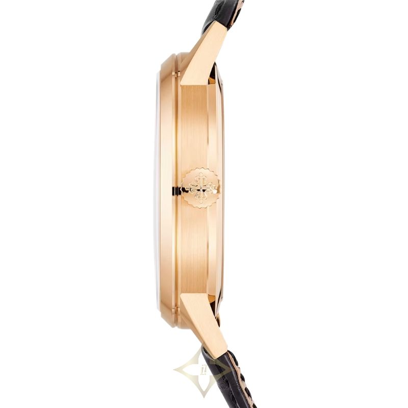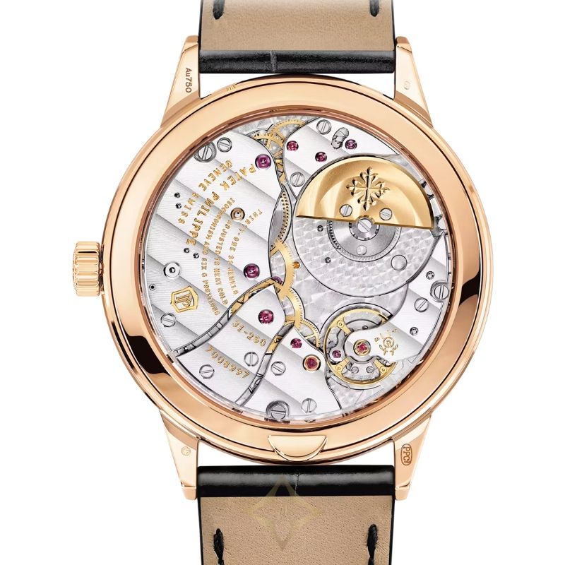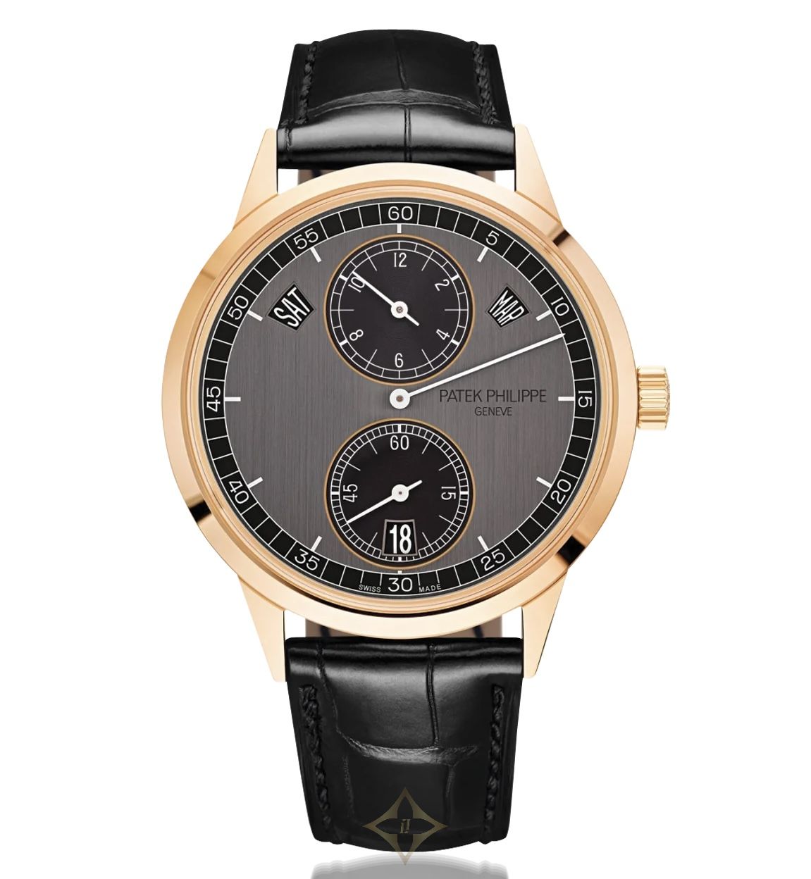 Patek Philippe Complications watch with a rose gold case and sapphire crystal case back. Two-tone graphite–ebony black dial with vertical satin finish. Self-winding mechanical movement. Caliber 31-260 REG QA. Regulator-style display: subsidiary dials for hours and seconds, central minute hand. Day, date, and month shown in apertures. Hand-stitched matte black alligator leather strap with square scales. Pin buckle.