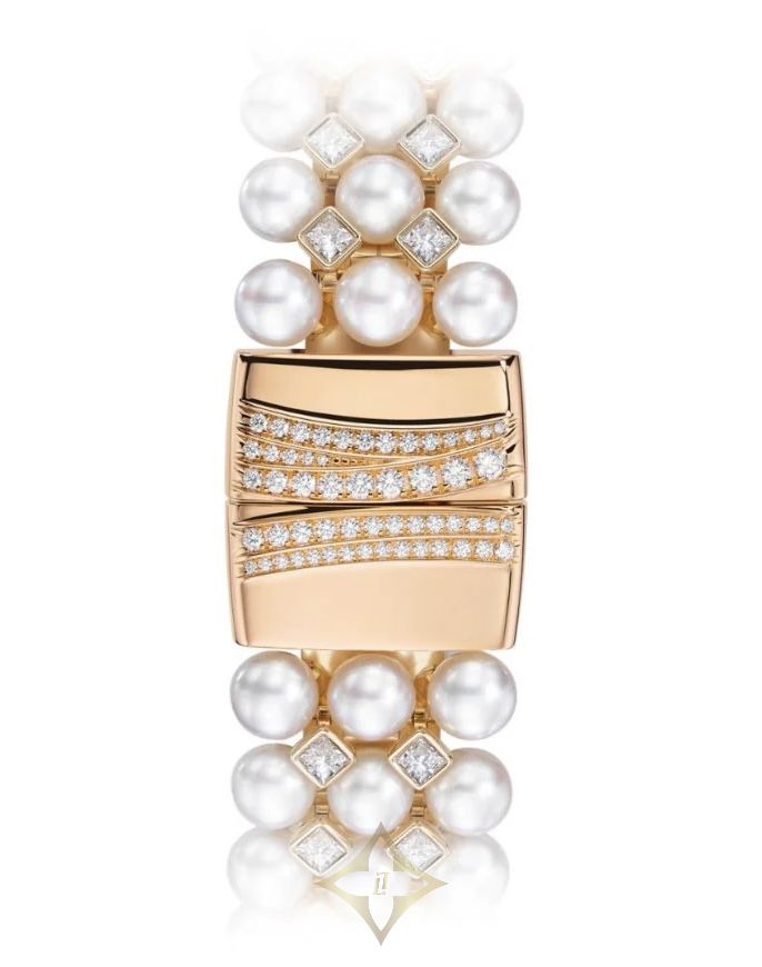 Bracelet set with 78 Akoya pearls (~48.85 ct) and rose gold decorative links set with 48 princess-cut diamonds (~2.28 ct). Fold-over clasp set with 55 diamonds (~0.23 ct).