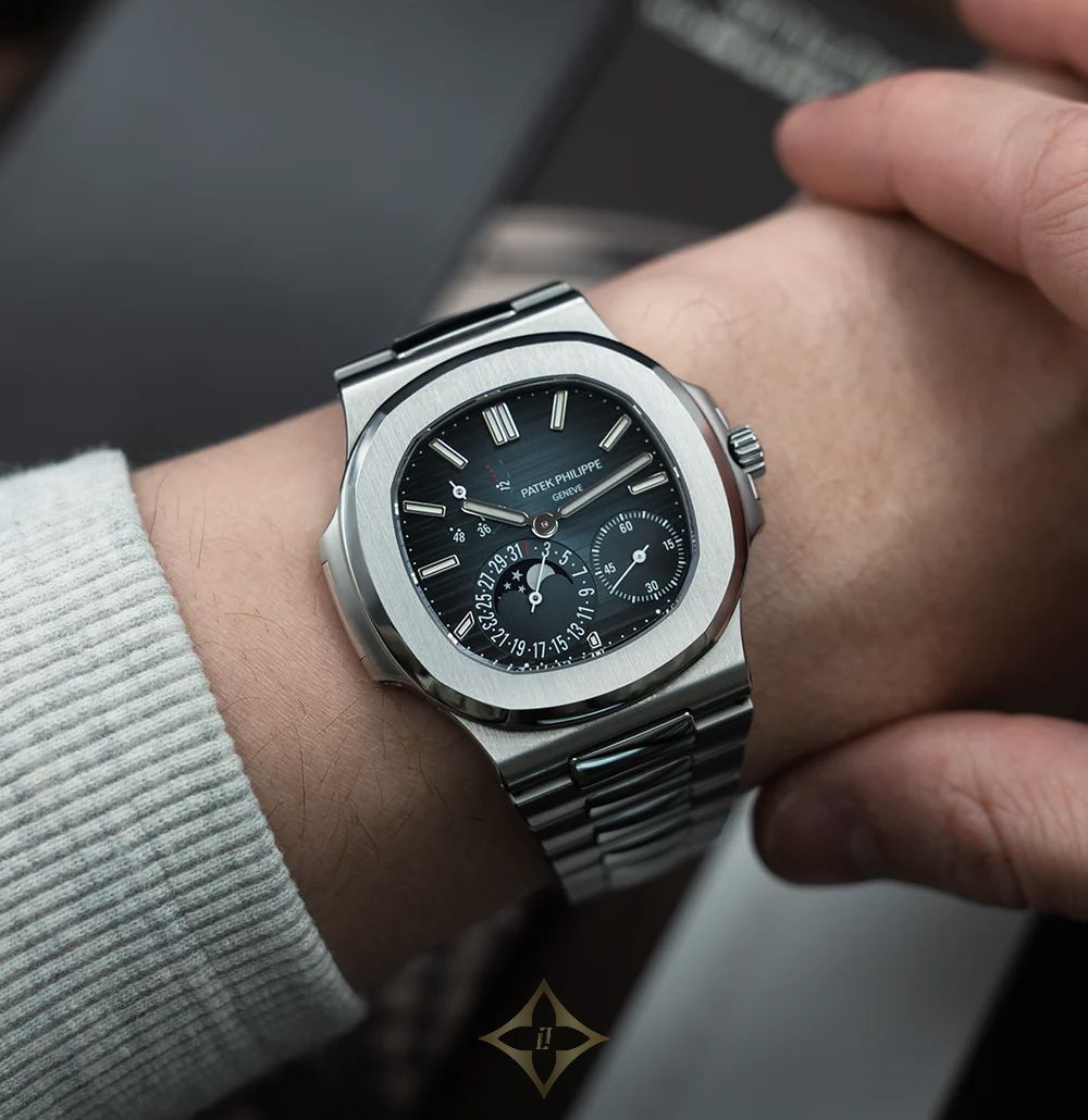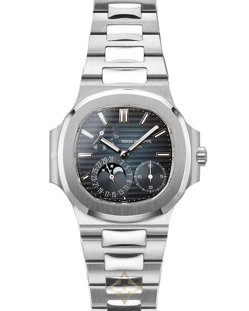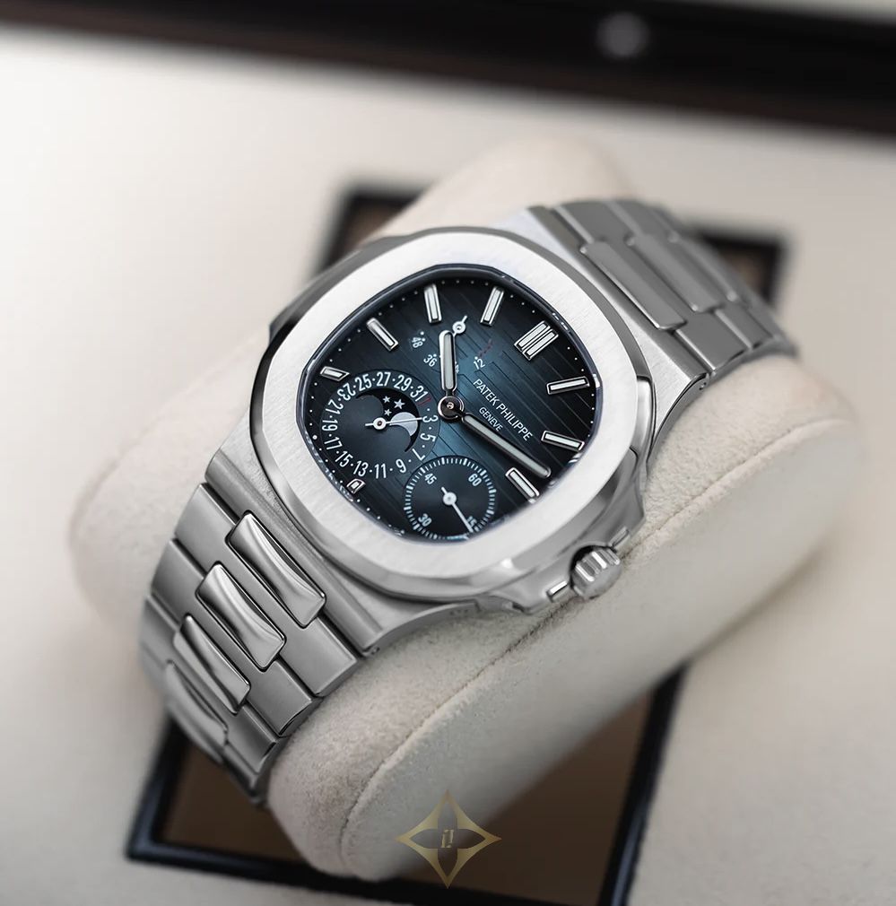 The Patek Philippe Nautilus 5712/1A-001 is an exquisite expression of luxury sports watchmaking, blending elegance with technical mastery. Encased in a 40mm stainless steel case with the iconic rounded octagonal bezel, this timepiece exudes refined sophistication. The blue-black gradient dial, adorned with the signature horizontal embossing, features an asymmetrical layout with a moon phase, power reserve indicator, and small seconds subdial, offering both function and visual intrigue.