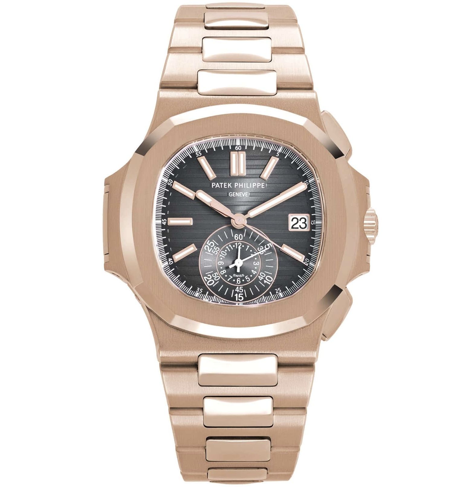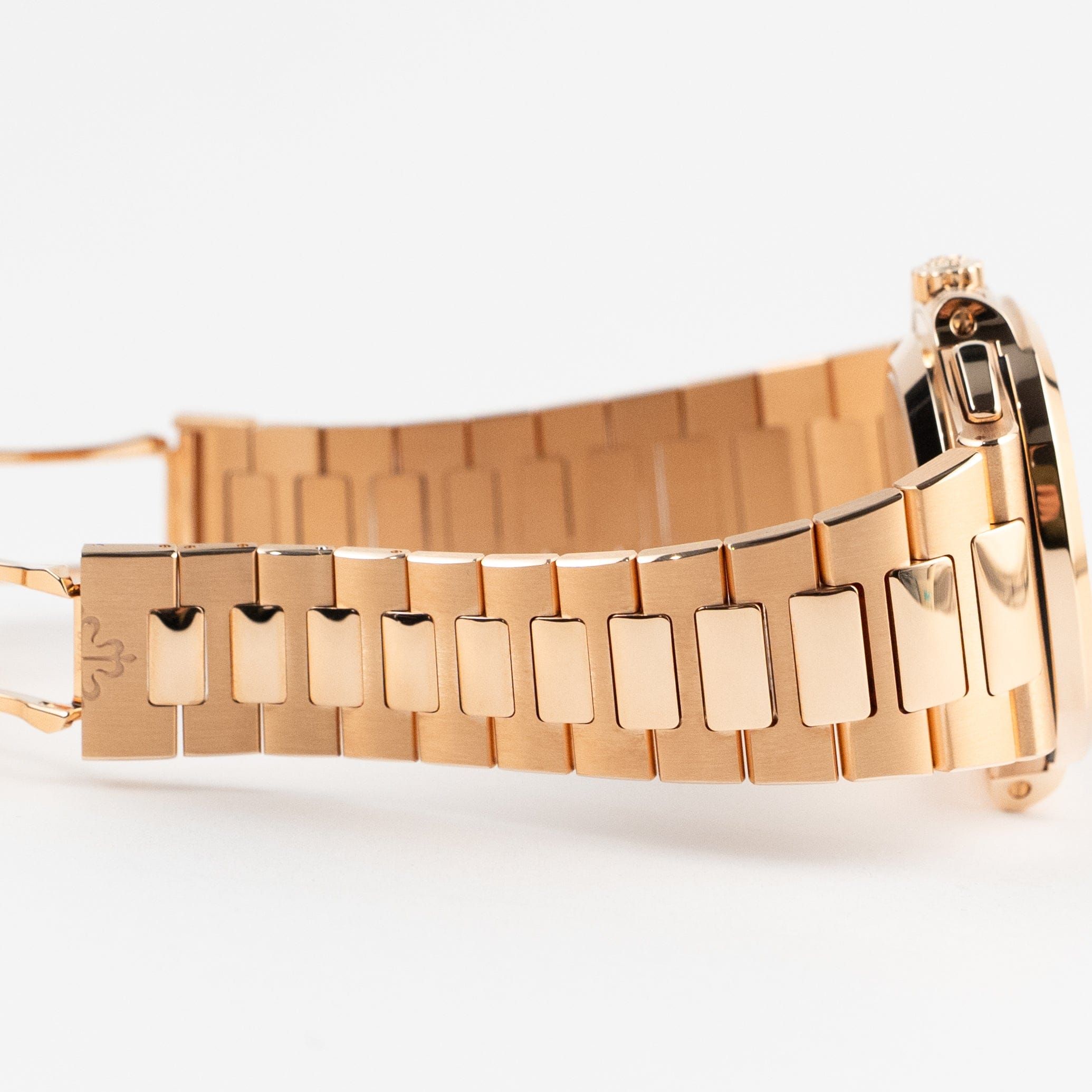 This Patek Philippe Nautilus Chronograph Date 5980/1R-001 is crafted in a 40.5mm rose gold case, black dial with rose gold markers, and matching bracelet. Chronograph timekeeping and a date feature at 3 o'clock are powered by Caliber CH 28-520 C with 55 hours of power reserve. Styled with a rose gold Nautilus bracelet featuring the updated Patek fold over deployment clasp, designed for easy adjustability and extra security on the wrist.